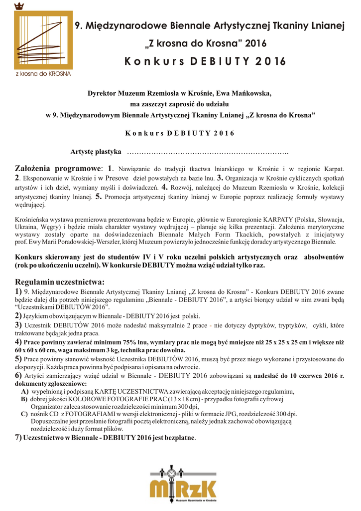 9. Międzynarodowe Biennale Artystycznej Tkaniny Lnianej Z krosna do Krosna” 2016 “ K o n k u r s D E B I U T Y 2 0 16 Dyrektor Muzeum Rzemiosła w Krośnie, Ewa Mańkowska, ma zaszczyt zaprosić do udziału w 9. Międzynarodowym Biennale Artystycznej Tkaniny Lnianej „Z krosna do Krosna” Konkurs DEBIUTY 2016 Artystę plastyka …………………………………………………………. Założenia programowe: 1. Nawiązanie do tradycji tkactwa lniarskiego w Krośnie i w regionie Karpat. 2. Eksponowanie w Krośnie i w Presove dzieł powstałych na bazie lnu. 3. Organizacja w Krośnie cyklicznych spotkań artystów i ich dzieł, wymiany myśli i doświadczeń. 4. Rozwój, należącej do Muzeum Rzemiosła w Krośnie, kolekcji artystycznej tkaniny lnianej. 5. Promocja artystycznej tkaniny lnianej w Europie poprzez realizację formuły wystawy wędrującej. Krośnieńska wystawa premierowa prezentowana będzie w Europie, głównie w Euroregionie KARPATY (Polska, Słowacja, Ukraina, Węgry) i będzie miała charakter wystawy wędrującej – planuje się kilka prezentacji. Założenia merytoryczne wystawy zostały oparte na doświadczeniach Biennale Małych Form Tkackich, powstałych z inicjatywy prof. Ewy Marii Poradowskiej-Werszler, której Muzeum powierzyło jednocześnie funkcję doradcy artystycznego Biennale. Konkurs skierowany jest do studentów IV i V roku uczelni polskich artystycznych oraz absolwentów (rok po ukończeniu uczelni). W konkursie DEBIUTY można wziąć udział tylko raz. Regulamin uczestnictwa: 1) 9. Międzynarodowe Biennale Artystycznej Tkaniny Lnianej „Z krosna do Krosna” - Konkurs DEBIUTY 2016 zwane będzie dalej dla potrzeb niniejszego regulaminu „Biennale - DEBIUTY 2016”, a artyści biorący udział w nim zwani będą “Uczestnikami DEBIUTÓW 2016”. 2) Językiem obowiązującym w Biennale - DEBIUTY 2016 jest polski. 3) Uczestnik DEBIUTÓW 2016 może nadesłać maksymalnie 2 prace - nie dotyczy dyptyków, tryptyków, cykli, które traktowane będą jak jedna praca. 4) Prace powinny zawierać minimum 75% lnu, wymiary prac nie mogą być mniejsze niż 25 x 25 x 25 cm i większe niż 60 x 60 x 60 cm, waga maksimum 3 kg, technika prac dowolna. 5) Prace powinny stanowić własność Uczestnika DEBIUTÓW 2016, muszą być przez niego wykonane i przystosowane do ekspozycji. Każda praca powinna być podpisana i opisana na odwrocie. 6) Artyści zamierzający wziąć udział w Biennale - DEBIUTY 2016 zobowiązani są nadesłać do 10 czerwca 2016 r. dokumenty zgłoszeniowe: A) wypełnioną i podpisaną KARTĘ UCZESTNICTWA zawierającą akceptację niniejszego regulaminu, B) dobrej jakości KOLOROWE FOTOGRAFIE PRAC (13 x 18 cm) - przypadku fotografii cyfrowej Organizator zaleca stosowanie rozdzielczości minimum 300 dpi, C) nośnik CD z FOTOGRAFIAMI w wersji elektronicznej - pliki w formacie JPG, rozdzielczość 300 dpi. Dopuszczalne jest przesłanie fotografii pocztą elektroniczną, należy jednak zachować obowiązującą rozdzielczość i duży format plików. 7) Uczestnictwo w Biennale - DEBIUTY 2016 jest bezpłatne. 8) Przyjmowane będą jedynie czytelnie, szczegółowo i kompletnie wypełnione karty uczestnictwa, wypełnione na maszynie lub komputerze albo wielkimi literami. Nazwy szkół, pracowni, warsztatów artystycznych, tytuły wystaw, konkursów prosimy podawać w „języku oryginału”. Organizator zwraca uwagę na konieczność zadeklarowania wartości pracy w PLN lub w EURO. 9) Niedostarczenie fotografii prac w ustalonym terminie skutkować będzie nieumieszczeniem ich w katalogu. 10) Uczestnicy DEBIUTÓW 2016, którzy przekażą swoje prace w darze dla Muzeum Rzemiosła w Krośnie, otrzymają podziękowanie i potwierdzenie darowizny a ich nazwiska zostaną wpisane do dokumentacji muzealnej i umieszczone w katalogu Biennale. 11) Każdy Uczestnik DEBIUTÓW 2014 do 17 czerwca 2016 - na podstawie nadesłanych dokumentów zgłoszeniowych i zdjęć otrzyma listowne, elektroniczne lub telefonicznie powiadomienie dotyczące wstępnej kwalifikacji prac do Biennale. 12) Ostateczny termin przyjmowania prac w siedzibie Organizatora przypada na dzień 15 lipca 2016 r. Data stempla pocztowego nie będzie brana pod uwagę. 13) Udział w Biennale - DEBIUTY 2016 jest jednocześnie wyrażeniem zgody Uczestników DEBIUTÓW 2016 i autorów fotografii na bezpłatne publikowanie prac w wydawnictwach i w mediach oraz przetwarzanie danych osobowych (tekst jedn. Dz.U. 2014 nr 0 poz. 1182). 14) Koszty nadesłania pracy na Biennale - DEBIUTY 2016 ponosi Uczestnik, natomiast koszty jej odesłania - Organizator. Ze względu na prezentacje wystawy przez okres 1 roku, Organizator będzie odsyłał prace na początku roku, w którym przypada kolejna edycja biennale (2018). W szczególnych okolicznościach na życzenie Uczestnika DEBIUTÓW 2016 praca może być odesłana wcześniej. 15) W przypadku dokonania darowizny pracy przez Uczestnika na rzecz Organizatora, po zakończeniu wystaw wędrujących bieżącej edycji, następuje włączenie pracy do kolekcji muzealnej. Jednakże Organizator deklaruje możliwość bezpłatnego wypożyczenia pracy na prośbę Uczestnika związaną z Jego udziałem w innych wystawach. 16) Przekazanie pracy w darze jest jednoznaczne z nieodpłatnym przekazaniem autorskich praw majątkowych na rzecz Muzeum Rzemiosła w Krośnie na następujących polach eksploatacji: a) utrwalenie i zwielokrotnienie dzieła, w tym techniką drukarską, reprograficzną, zapisu magnetycznego oraz techniką cyfrową; b) obrót oryginałem albo egzemplarzami, na których utwór utrwalono wprowadzenie do obrotu, wystawianie, najem, dzierżawa; c) publiczne udostępnianie dzieła w taki sposób, aby każdy mógł mieć do niego dostęp w miejscu i w czasie przez siebie wybranym, w tym przez Internet. 17) Organizator nie bierze odpowiedzialności za uszkodzenia powstałe podczas transportu prac. 18) Wystawa będzie prezentacją dzieł Uczestników Biennale i