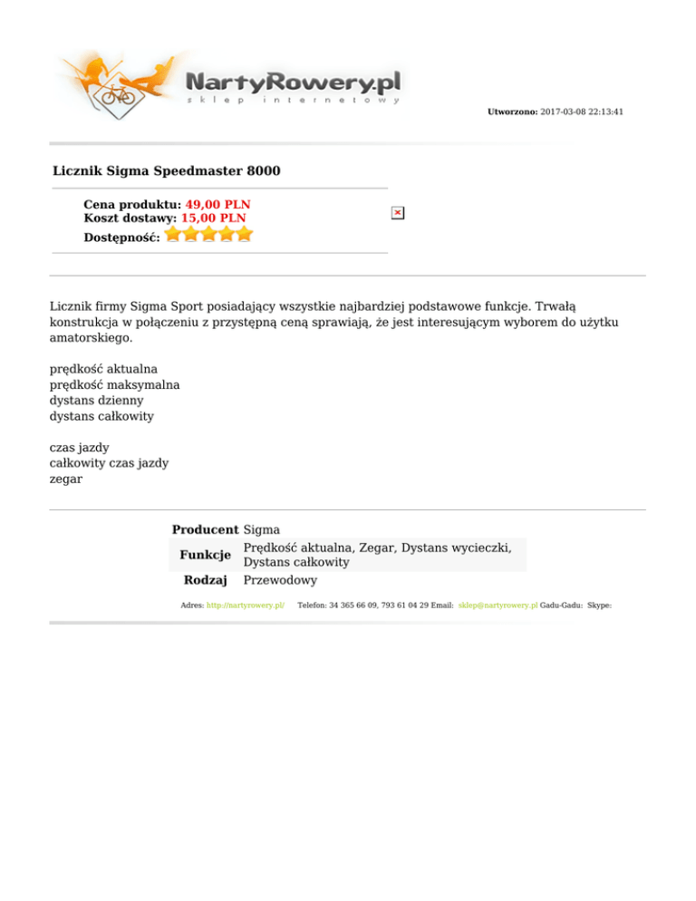 Utworzono: 2017-03-08 22:13:41 Licznik Sigma Speedmaster 8000 Cena produktu: 49,00 PLN Koszt dostawy: 15,00 PLN Dostępność: Licznik firmy Sigma Sport posiadający wszystkie najbardziej podstawowe funkcje. Trwałą konstrukcja w połączeniu z przystępną ceną sprawiają, że jest interesującym wyborem do użytku amatorskiego. prędkość aktualna prędkość maksymalna dystans dzienny dystans całkowity czas jazdy całkowity czas jazdy zegar Producent Sigma Funkcje Rodzaj Prędkość aktualna, Zegar, Dystans wycieczki, Dystans całkowity Przewodowy Adres: http://nartyrowery.pl/ Telefon: 34 365 66 09, 793 61 04 29 Email: [email protected] Gadu-Gadu: Skype:
