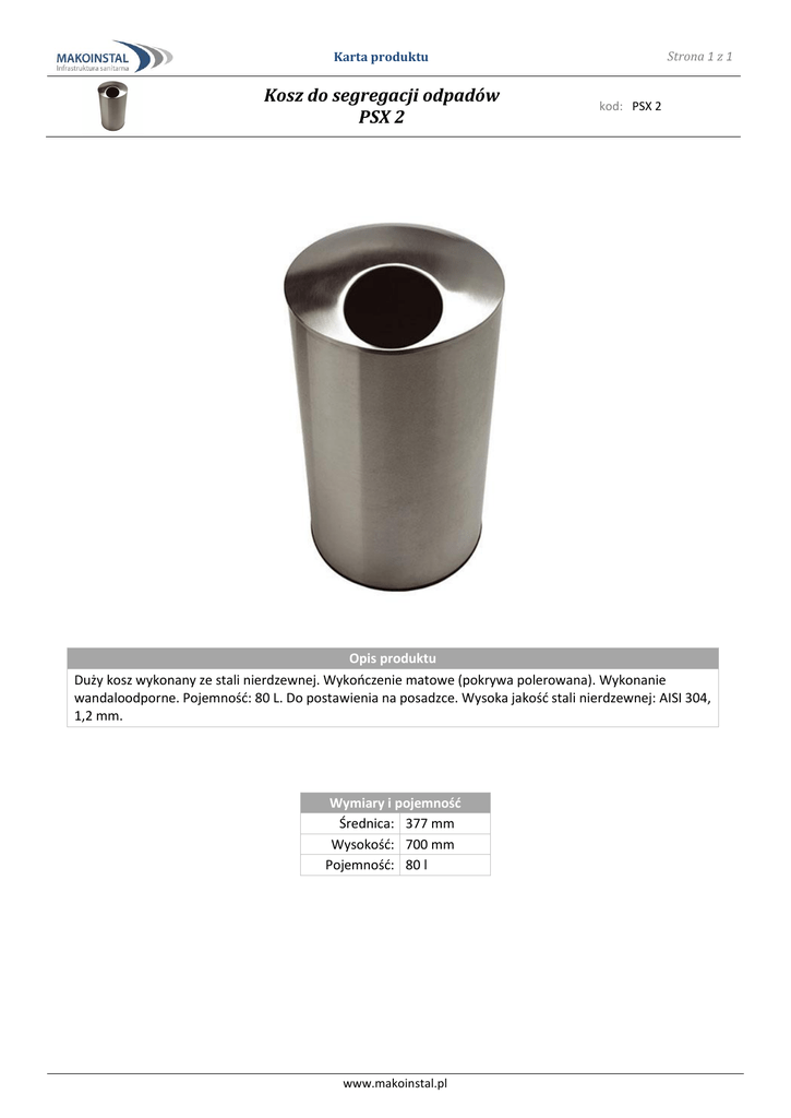Strona 1 z 1 Karta produktu Kosz do segregacji odpadów PSX 2 kod: PSX 2 Opis produktu Duży kosz wykonany ze stali nierdzewnej. Wykończenie matowe (pokrywa polerowana). Wykonanie wandaloodporne. Pojemność: 80 L. Do postawienia na posadzce. Wysoka jakość stali nierdzewnej: AISI 304, 1,2 mm. Wymiary i pojemność Średnica: 377 mm Wysokość: 700 mm Pojemność: 80 l www.makoinstal.pl