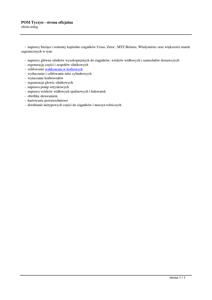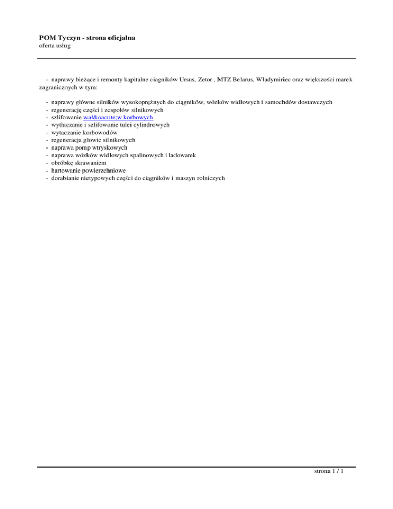 POM Tyczyn - strona oficjalna oferta usług - naprawy bieżące i remonty kapitalne ciagników Ursus, Zetor , MTZ Belarus, Władymiriec oraz większości marek zagranicznych w tym: - naprawy główne silników wysokoprężnych do ciągników, wózków widłowych i samochdów dostawczych regenerację części i zespołów silnikowych szlifowanie wałów korbowych wytłaczanie i szlifowanie tulei cylindrowych wytaczanie korbowodów regeneracja głowic silnikowych naprawa pomp wtryskowych naprawa wózków widłowych spalinowych i ładowarek obróbkę skrawaniem hartowanie powierzchniowe dorabianie nietypowych części do ciągników i maszyn rolniczych strona 1 / 1