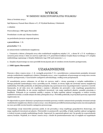 WYROK W IMIENIU RZECZYPOSPOLITEJ POLSKIEJ Dnia 27 kwietnia 2015 r. Sąd Rejonowy Poznań Stare Miasto w P., IV Wydział Rodzinny i Nieletnich w składzie Przewodniczący: SSR Agata Marszałek Protokolant: st.sekr.sąd. Hanna Gendera na posiedzeniu jawnym rozpoznał sprawę z powództwa : I. K. przeciwko: T. K. o: ustanowienie rozdzielności majątkowej 1. Ustanawia z dniem 3 listopada 2014 roku rozdzielność majątkową między I. K. , z domu W. a T. K. wynikającą z zawarcia przez strony w dniu 20 czerwca 1998 roku w P. przed Kierownikiem Urzędu Stanu Cywilnego w P. związku małżeńskiego zapisanego w Księdze Małżeństw tego USC pod numerem (...). 2. Zasądza od pozwanego na rzecz powódki kwotę łącznie 560 zł. tytułem zwrotu kosztów postępowania. /-/ SSR Agata Marszałek UZASADNIENIE Pozwem z dnia 2 marca 2015 r. I. K. wystąpiła przeciwko T. K. z powództwem o ustanowienie pomiędzy stronami ustroju rozdzielności majątkowej z dniem 3 listopada 2014 r. oraz o zasądzenie od pozwanego na swoją rzecz zwrotu kosztów postępowania, w tym kosztów zastępstwa adwokackiego, według norm przepisanych. W uzasadnieniu pozwu wskazano, że od dnia 20 czerwca 1998 r. strony pozostają w związku małżeńskim, z którego pochodzi zamieszkujący wraz z powódką syn M.. Podano, że strony nigdy nie zawierały umowy majątkowej małżeńskiej. Powódka podniosła, że aktualnie pomiędzy nią a pozwanym toczy się postępowanie w sprawie o rozwód. Zaznaczyła, że od roku 2012 nie współżyje z mężem i aktualnie nie prowadzi z nim wspólnego gospodarstwa domowego. Podkreśliła, że nie czynią wspólnych inwestycji i nie mają wspólnych planów, ponadto pozostają w konflikcie. Wskazała że po rozstaniu ustaliła z mężem, że będą wspólnie spłacać zaciągnięty w trakcie trwania małżeństwa kredyt, co miało miejsce do dnia 3 listopada 2014 r. Powódka podniosła, że po tej dacie pozwany zaprzestał regulowania rat. W odpowiedzi na pozew złożonej w przepisanym terminie pozwany wniósł o ustanowienie pomiędzy stronami ustroju rozdzielności majątkowej z dniem 2 marca 2015 r. oraz obciążenie powódki kosztami postępowania oraz niezasądzanie na rzecz powódki zwrotu kosztów zastępstwa procesowego. Uzasadniając swoje stanowisko pozwany podał, że nie prowadzą z żoną wspólnego gospodarstwa domowego, nie mają wspólnych inwestycji ani planów. Potwierdził, że postanowili z powódką, iż będą wspólnie spłacać zaciągnięty w trakcie trwania związku małżeńskiego kredyt. Zaprzeczył, by zaprzestał spłacać raty i by groziło im wypowiedzenie umowy kredytu. Wyjaśnił, że w lutym i marcu 2015 r. doszło do przeterminowania raty ze względu na wygaśnięcie umowy dotyczącej debetowania konta. Zarzucił, że nie został o tym fakcie powiadomiony, ponieważ pismo z banku zostało wysłane na adres powódki. W toku postępowania strony podtrzymały stanowiska w sprawie. Sąd ustalił następujący stan faktyczny T. K. oraz I. K. pozostają od dnia 20 czerwca 1998 r. w związku małżeńskim, z którego pochodzi syn M.. Od marca 2014 r. pomiędzy powódką a pozwanym toczy się postępowanie w sprawie o rozwód. Od roku 2012 strony nie współżyją ze sobą, obecnie nie mają wspólnych planów ani nie prowadzą wspólnych inwestycji. Od dnia 24 lutego 2014 r. zamieszkują oddzielnie i nie prowadzą wspólnego gospodarstwa domowego. Po rozstaniu strony umówiły się, że będą wspólnie spłacać zaciągnięty w trakcie trwania związku małżeńskiego kredyt. W lutym bieżącego roku powódka otrzymała z banku wezwanie do zapłaty wymagalnego zadłużenia. Pismem z dnia 26 lutego 2015 r. zwróciła się do banku z prośbą o rozłożenie zadłużenia na raty. Strony korzystają z odrębnych rachunków bankowych. Pozostają w konflikcie, nie potrafią osiągnąć porozumienia w zakresie wspólnych dotychczas spraw. dowód: wezwanie do zapłaty (k. 6), zaświadczenie z banku (k. 17), zestawienie operacji na rachunku bankowym (k. 18-20), odpis skrócony aktu małżeństwa (k. 29), pismo powódki z dnia 26.02.2015 r. (k. 30), potwierdzenie przyjęcia przelewu do realizacji (k. 31), oświadczenie kredytobiorcy (k. 32a), przesłuchanie powódki (k. 33-34 w zw. z k. 35), przesłuchanie pozwanego (k. 34 w zw. z k. 35) Powyższy stan faktyczny Sąd ustalił w oparciu o dokumenty zgromadzone w aktach niniejszej sprawy oraz w oparciu o dowód z przesłuchania stron. Sąd nie znalazł żadnych przyczyn dla kwestionowania wiarygodności i mocy dowodowej dokumentów, z których przeprowadzony został dowód. Zarzutów w tym względzie nie zgłosiły również strony procesu. Wskazanym wyżej dokumentom urzędowym i prywatnym Sąd przypisał znaczenie jakie wynika z art. 244 i 245 k.p.c. Za wiarygodny Sąd uznał również dowód z przesłuchania stron. Złożone przez powódkę oraz pozwanego zeznania dotyczyły ich aktualnej sytuacji życiowej i majątkowej, a także stosunków majątkowych stron z okresu wspólnego pożycia. Zeznania stron wzajemnie ze sobą korespondowały, były spójne i konsekwentne, nadto częściowo znajdowały potwierdzenie w zgromadzonych w sprawie dokumentach. Strony zgodnie wskazały datę wyprowadzki powódki ze wspólnego mieszkania oraz moment zerwania więzi gospodarczej. Sąd zważył co następuje Powódka I. K. wniosła o ustanowienie rozdzielności majątkowej pomiędzy nią a pozwanym T. K. od dnia 3 listopada 2014 r. W ocenie Sądu powództwo w całości zasługiwało na uwzględnienie. W myśl art. 52 § 1 k.r.o. każdy z małżonków może z ważnych powodów żądać ustanowienia przez sąd rozdzielności majątkowej. Zgodnie natomiast z art. 52 § 2 k.r.o. rozdzielność majątkowa powstaje z dniem oznaczonym w wyroku, który ją ustanawia. W wyjątkowych wypadkach sąd może ustanowić rozdzielność majątkową z dniem wcześniejszym niż dzień wytoczenia powództwa, w szczególności jeżeli małżonkowie 