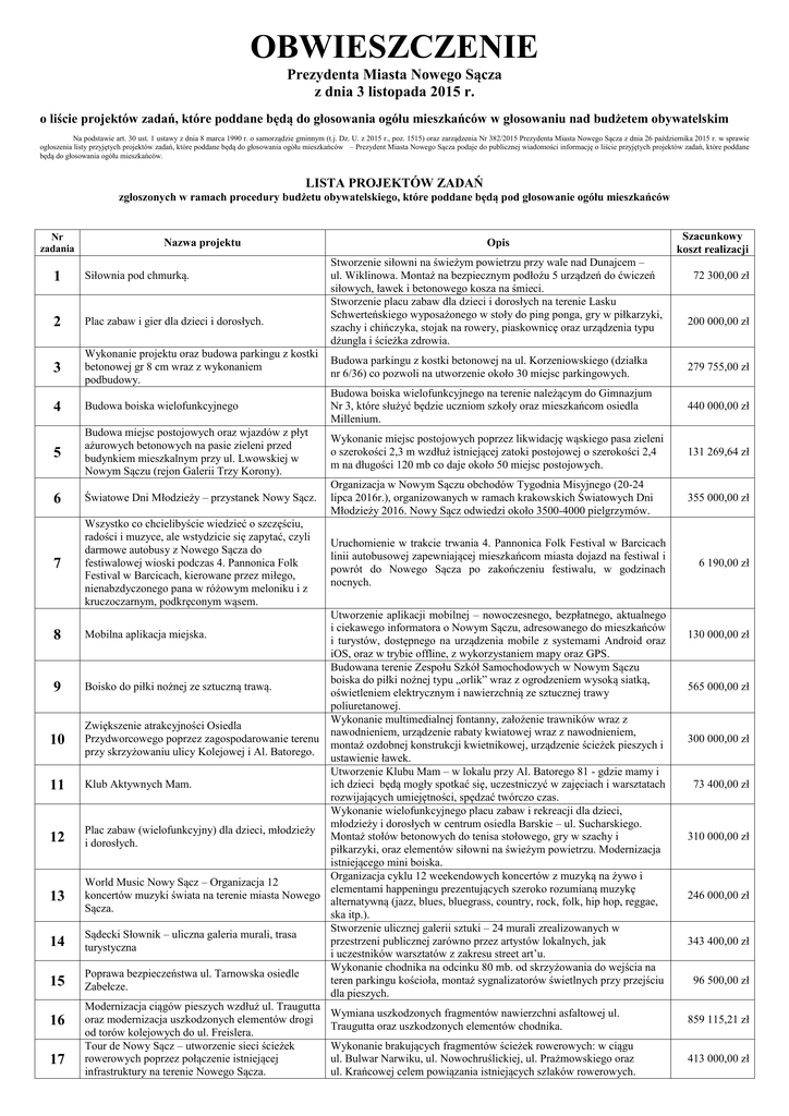 OBWIESZCZENIE Prezydenta Miasta Nowego Sącza z dnia 3 listopada 2015 r. o liście projektów zadań, które poddane będą do głosowania ogółu mieszkańców w głosowaniu nad budżetem obywatelskim Na podstawie art. 30 ust. 1 ustawy z dnia 8 marca 1990 r. o samorządzie gminnym (t.j. Dz. U. z 2015 r., poz. 1515) oraz zarządzenia Nr 382/2015 Prezydenta Miasta Nowego Sącza z dnia 26 października 2015 r. w sprawie ogłoszenia listy przyjętych projektów zadań, które poddane będą do głosowania ogółu mieszkańców – Prezydent Miasta Nowego Sącza podaje do publicznej wiadomości informację o liście przyjętych projektów zadań, które poddane będą do głosowania ogółu mieszkańców. LISTA PROJEKTÓW ZADAŃ zgłoszonych w ramach procedury budżetu obywatelskiego, które poddane będą pod głosowanie ogółu mieszkańców Nr zadania Nazwa projektu Opis Stworzenie siłowni na świeżym powietrzu przy wale nad Dunajcem – ul. Wiklinowa. Montaż na bezpiecznym podłożu 5 urządzeń do ćwiczeń siłowych, ławek i betonowego kosza na śmieci. Stworzenie placu zabaw dla dzieci i dorosłych na terenie Lasku Schwerteńskiego wyposażonego w stoły do ping ponga, gry w piłkarzyki, szachy i chińczyka, stojak na rowery, piaskownicę oraz urządzenia typu dżungla i ścieżka zdrowia. Szacunkowy koszt realizacji 1 Siłownia pod chmurką. 2 Plac zabaw i gier dla dzieci i dorosłych. 3 Wykonanie projektu oraz budowa parkingu z kostki betonowej gr 8 cm wraz z wykonaniem podbudowy. Budowa parkingu z kostki betonowej na ul. Korzeniowskiego (działka nr 6/36) co pozwoli na utworzenie około 30 miejsc parkingowych. 279 755,00 zł 4 Budowa boiska wielofunkcyjnego Budowa boiska wielofunkcyjnego na terenie należącym do Gimnazjum Nr 3, które służyć będzie uczniom szkoły oraz mieszkańcom osiedla Millenium. 440 000,00 zł 5 Budowa miejsc postojowych oraz wjazdów z płyt ażurowych betonowych na pasie zieleni przed budynkiem mieszkalnym przy ul. Lwowskiej w Nowym Sączu (rejon Galerii Trzy Korony). Wykonanie miejsc postojowych poprzez likwidację wąskiego pasa zieleni o szerokości 2,3 m wzdłuż istniejącej zatoki postojowej o szerokości 2,4 m na długości 120 mb co daje około 50 miejsc postojowych. 131 269,64 zł 6 Światowe Dni Młodzieży – przystanek Nowy Sącz. Organizacja w Nowym Sączu obchodów Tygodnia Misyjnego (20-24 lipca 2016r.), organizowanych w ramach krakowskich Światowych Dni Młodzieży 2016. Nowy Sącz odwiedzi około 3500-4000 pielgrzymów. 355 000,00 zł 7 Wszystko co chcielibyście wiedzieć o szczęściu, radości i muzyce, ale wstydzicie się zapytać, czyli darmowe autobusy z Nowego Sącza do festiwalowej wioski podczas 4. Pannonica Folk Festival w Barcicach, kierowane przez miłego, nienabzdyczonego pana w różowym meloniku i z kruczoczarnym, podkręconym wąsem. Uruchomienie w trakcie trwania 4. Pannonica Folk Festival w Barcicach linii autobusowej zapewniającej mieszkańcom miasta dojazd na festiwal i powrót do Nowego Sącza po zakończeniu festiwalu, w godzinach nocnych. 8 9 10 11 12 13 14 15 16 17 Utworzenie aplikacji mobilnej – nowoczesnego, bezpłatnego, aktualnego i ciekawego informatora o Nowym Sączu, adresowanego do mieszkańców Mobilna aplikacja miejska. i turystów, dostępnego na urządzenia mobile z systemami Android oraz iOS, oraz w trybie offline, z wykorzystaniem mapy oraz GPS. Budowana terenie Zespołu Szkół Samochodowych w Nowym Sączu boiska do piłki nożnej typu „orlik” wraz z ogrodzeniem wysoką siatką, Boisko do piłki nożnej ze sztuczną trawą. oświetleniem elektrycznym i nawierzchnią ze sztucznej trawy poliuretanowej. Wykonanie multimedialnej fontanny, założenie trawników wraz z Zwiększenie atrakcyjności Osiedla nawodnieniem, urządzenie rabaty kwiatowej wraz z nawodnieniem, Przydworcowego poprzez zagospodarowanie terenu montaż ozdobnej konstrukcji kwietnikowej, urządzenie ścieżek pieszych i przy skrzyżowaniu ulicy Kolejowej i Al. Batorego. ustawienie ławek. Utworzenie Klubu Mam – w lokalu przy Al. Batorego 81 - gdzie mamy i Klub Aktywnych Mam. ich dzieci będą mogły spotkać się, uczestniczyć w zajęciach i warsztatach rozwijających umiejętności, spędzać twórczo czas. Wykonanie wielofunkcyjnego placu zabaw i rekreacji dla dzieci, młodzieży i dorosłych w centrum osiedla Barskie – ul. Sucharskiego. Plac zabaw (wielofunkcyjny) dla dzieci, młodzieży Montaż stołów betonowych do tenisa stołowego, gry w szachy i i dorosłych. piłkarzyki, oraz elementów siłowni na świeżym powietrzu. Modernizacja istniejącego mini boiska. Organizacja cyklu 12 weekendowych koncertów z muzyką na żywo i World Music Nowy Sącz – Organizacja 12 elementami happeningu prezentujących szeroko rozumianą muzykę koncertów muzyki świata na terenie miasta Nowego alternatywną (jazz, blues, bluegrass, country, rock, folk, hip hop, reggae, Sącza. ska itp.). Stworzenie ulicznej galerii sztuki – 24 murali zrealizowanych w Sądecki Słownik – uliczna galeria murali, trasa przestrzeni publicznej zarówno przez artystów lokalnych, jak turystyczna i uczestników warsztatów z zakresu street art’u. Wykonanie chodnika na odcinku 80 mb. od skrzyżowania do wejścia na Poprawa bezpieczeństwa ul. Tarnowska osiedle teren parkingu kościoła, montaż sygnalizatorów świetlnych przy przejściu Zabełcze. dla pieszych. Modernizacja ciągów pieszych wzdłuż ul. Traugutta Wymiana uszkodzonych fragmentów nawierzchni asfaltowej ul. oraz modernizacja uszkodzonych elementów drogi Traugutta oraz uszkodzonych elementów chodnika. od torów kolejowych do ul. Freislera. Tour de Nowy Sącz – utworzenie sieci ścieżek Wykonanie brakujących fragmentów ścieżek rowerowych: w ciągu rowerowych poprzez połączenie istniejącej ul. Bulwar Narwiku, ul. Nowochruślickiej, ul. Prażmowskiego oraz infrastruktury na terenie Nowego Sącza. ul. Krańcowej celem powiązania istniejących szlaków rowerowych. 72 3