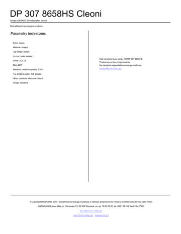 DP 307 8658HS Cleoni Lampa LUKOMO 35 mała plafon sosna Specyfikacja inwestycyjna produktu Parametry techniczne: Kolor: sosna Materiał: sklejka Typ lampy: plafon Liczba źródeł światła: 1 Gwint: 2GX13 Moc: 22W Napięcie zasilania oprawy: 230V Kod zamówieniowy lampy: ST/DP 307 8658HS Produkt wyceniany indywidualnie. Na zapytania odpowiadamy drogą e-mail'ową: [email protected] Typ źródła światła: TL5 circular Układ zasilania: elektronic balast Uwagi: standard © Copyright MAGNAXIS 2015 - kompleksowa obsługa inwestycji w zakresie projektowania i dostaw oświetlenia na terenie całej Polski MAGNAXIS Gutowo Małe ul. Ostrowska 13, 62-300 Września pn.-pt. 10:00-18:00, tel. 602 183 414, fax 61 6427253 [email protected] www.SwiatLamp.pl magnaxis.pl