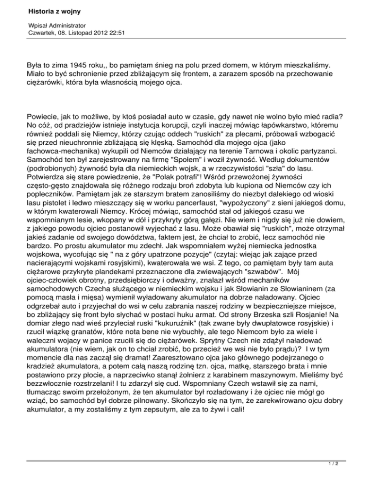 Historia z wojny Wpisał Administrator Czwartek, 08. Listopad 2012 22:51 Była to zima 1945 roku,, bo pamiętam śnieg na polu przed domem, w którym mieszkaliśmy. Miało to być schronienie przed zbliżającym się frontem, a zarazem sposób na przechowanie ciężarówki, która była własnością mojego ojca. Powiecie, jak to możliwe, by ktoś posiadał auto w czasie, gdy nawet nie wolno było mieć radia? No cóż, od pradziejów istnieje instytucja korupcji, czyli inaczej mówiąc łapówkarstwo, któremu również poddali się Niemcy, którzy czując oddech "ruskich" za plecami, próbowali wzbogacić się przed nieuchronnie zbliżającą się klęską. Samochód dla mojego ojca (jako fachowca-mechanika) wykupili od Niemców działający na terenie Tarnowa i okolic partyzanci. Samochód ten był zarejestrowany na firmę "Społem" i woził żywność. Według dokumentów (podrobionych) żywność była dla niemieckich wojsk, a w rzeczywistości "szła" do lasu. Potwierdza się stare powiedzenie, że "Polak potrafi"! Wśród przewożonej żywności często-gęsto znajdowała się różnego rodzaju broń zdobyta lub kupiona od Niemców czy ich popleczników. Pamiętam jak ze starszym bratem zanosiliśmy do niezbyt dalekiego od wioski lasu pistolet i ledwo mieszczący się w worku pancerfaust, "wypożyczony" z sieni jakiegoś domu, w którym kwaterowali Niemcy. Krócej mówiąc, samochód stał od jakiegoś czasu we wspomnianym lesie, wkopany w dół i przykryty górą gałęzi. Nie wiem i nigdy się już nie dowiem, z jakiego powodu ojciec postanowił wyjechać z lasu. Może obawiał się "ruskich", może otrzymał jakieś zadanie od swojego dowództwa, faktem jest, że chciał to zrobić, lecz samochód nie bardzo. Po prostu akumulator mu zdechł. Jak wspomniałem wyżej niemiecka jednostka wojskowa, wycofując się " na z góry upatrzone pozycje" (czytaj: wiejąc jak zające przed nacierającymi wojskami rosyjskimi), kwaterowała we wsi. Z tego, co pamiętam były tam auta ciężarowe przykryte plandekami przeznaczone dla zwiewających "szwabów". Mój ojciec-człowiek obrotny, przedsiębiorczy i odważny, znalazł wśród mechaników samochodowych Czecha służącego w niemieckim wojsku i jak Słowianin ze Słowianinem (za pomocą masła i mięsa) wymienił wyładowany akumulator na dobrze naładowany. Ojciec odgrzebał auto i przyjechał do wsi w celu zabrania naszej rodziny w bezpieczniejsze miejsce, bo zbliżający się front było słychać w postaci huku armat. Od strony Brzeska szli Rosjanie! Na domiar złego nad wieś przyleciał ruski "kukuruźnik" (tak zwane były dwupłatowce rosyjskie) i rzucił wiązkę granatów, które nota bene nie wybuchły, ale tego Niemcom było za wiele i waleczni wojacy w panice rzucili się do ciężarówek. Sprytny Czech nie zdążył naładować akumulatora (nie wiem, jak on to chciał zrobić, bo przecież we wsi nie było prądu)? I w tym momencie dla nas zaczął się dramat! Zaaresztowano ojca jako głównego podejrzanego o kradzież akumulatora, a potem całą naszą rodzinę tzn. ojca, matkę, starszego brata i mnie postawiono przy płocie, a naprzeciwko stanął żołnierz z karabinem maszynowym. Mieliśmy być bezzwłocznie rozstrzelani! I tu zdarzył się cud. Wspomniany Czech wstawił się za nami, tłumacząc swoim przełożonym, że ten akumulator był rozładowany i że ojciec nie mógł go wziąć, bo samochód był dobrze pilnowany. Skończyło się na tym, że zarekwirowano ojcu dobry akumulator, a my zostaliśmy z tym zepsutym, ale za to żywi i cali! 1/2 Historia z wojny Wpisał Administrator Czwartek, 08. Listopad 2012 22:51 P.S. w pobliżu gospodarzy. tak Pozdrawiam trudnym domu, Cóż, czasie w którym mieszkańców miałem najkrwawszej mieszkaliśmy, wtedy Rudy niecałe wojny Rysia, dziękując lecz 9 światowej. Pamiętam lat. ku mojemu ich smutkowi przodkom nie pamiętam zalatach gościnę, przy drodze, nazwiska jaką nam staw dali wt Pozdrowienia ze Szczecina. Jerzy Berechowski Bardzo Dziękuję za maila Otrzymałem jeszcze jednego mala, za którego również dziękuję: Serdecznie witam! kilka moje By Niezmiernie mogli osób. pokolenie i pojąć, Szczególnie mi że miło, aby 67 miała lat żyjemy żecieszył moje możliwość wspomnienia bym wwszystkich pokoju, się, zrozumieć gdyby czego z mieszkańców dzieciństwa czytała młodzież o wżadne jak radosnych pokolenie będzie mogło itych szczęśliwych Polaków przeczytać w,w swoich których czasach jeszcze ponad żyło żyją. ysiącletnich dziejach zdrowia. nie Jerzy zaznało. Berechowski Pozdrawiam wsi cmentarz Rudy-Rysia życząc im dużo 2/2