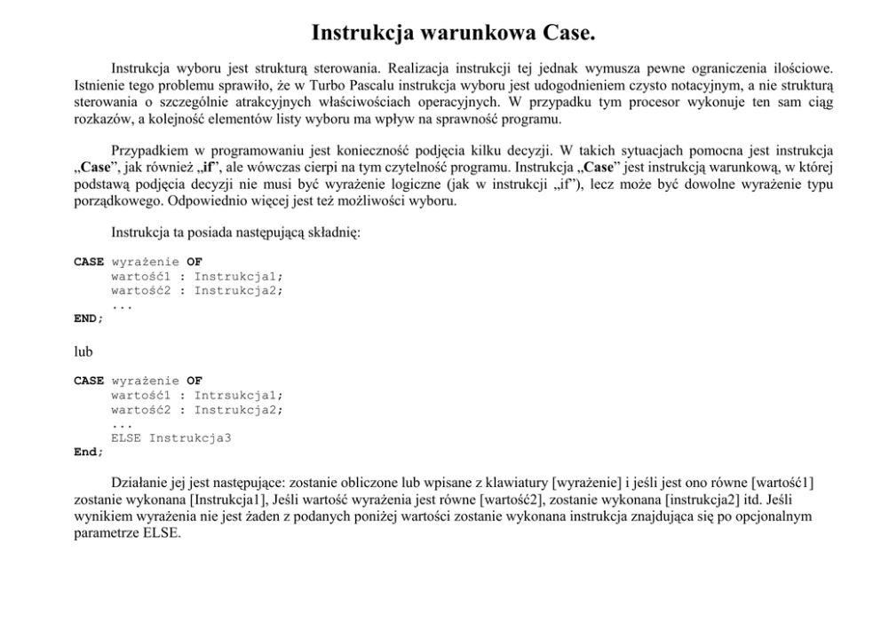 równą temu wyraŜeniu. Jeśli dla kilku róŜnych wartości wyraŜenia ma zostać wykonana ta sama instrukcja to przed