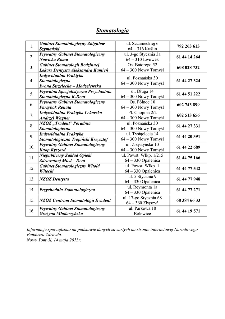 Stomatologia 1. 2. 3. 4. 5. 6. 7. 8. 9. 10. 11. 12. Gabinet Stomatologiczny Zbigniew Szymański Prywatny Gabinet Stomatologiczny Nowicka Roma Gabinet Stomatologii Rodzinnej Lekarz Dentysta Aleksandra Kamień Indywidualna Praktyka Stomatologiczna Iwona Strzelecka – Modzelewska Prywatna Specjalistyczna Przychodnia Stomatologiczna K-Dent Prywatny Gabinet Stomatologiczny Parzybok Renata Indywidualna Praktyka Lekarska Andrzej Wagner NZOZ „Tradent” Poradnia Stomatologiczna Indywidualna Praktyka Stomatologiczna Trepiński Krzysztof Prywatny Gabinet Stomatologiczny Knop Ryszard Niepubliczny Zakład Opieki Zdrowotnej Mied – Dent Gabinet Stomatologiczny Witold Witecki 13. NZOZ Dentysta 14. Przychodnia Stomatologiczna 15. NZOZ Centrum Stomatologii Evadent 16. Prywatny Gabinet Stomatologiczny GraŜyna Młodorzyńska ul. Sczanieckiej 6 64 – 316 Kuślin ul. 3-go Stycznia 3a 64 – 310 Lwówek Os. Batorego 52 64 – 300 Nowy Tomyśl 61 44 14 264 ul. Poznańska 30 64 – 300 Nowy Tomyśl 61 44 27 324 ul. Długa 14 64 – 300 Nowy Tomyśl Os. Północ 10 64 – 300 Nowy Tomyśl Pl. Chopina 2/2 64 – 300 Nowy Tomyśl ul. Poznańska 30 64 – 300 Nowy Tomyśl ul. Tysiąclecia 14 64 – 300 Nowy Tomyśl ul. Zbąszyńska 10 64 – 300 Nowy Tomyśl ul. Powst. Wlkp. 1/215 64 – 330 Opalenica ul. Powst. Wlkp. 1 64 – 330 Opalenica ul. 5 Stycznia 9 64 – 330 Opalenica ul. Reymonta 1a 64 – 330 Opalenica ul. 17-go Stycznia 68 64 – 360 Zbąszyń ul. Parkowa 18 Bolewice 792 263 613 608 028 732 61 44 51 222 602 743 899 602 513 656 61 44 27 331 61 44 20 391 61 44 22 689 61 44 75 166 61 44 77 542 61 44 77 948 61 44 77 271 68 384 66 33 61 44 19 571 Informacje sporządzono na podstawie danych zawartych na stronie internetowej Narodowego Funduszu Zdrowia. Nowy Tomyśl, 14 maja 2013r.