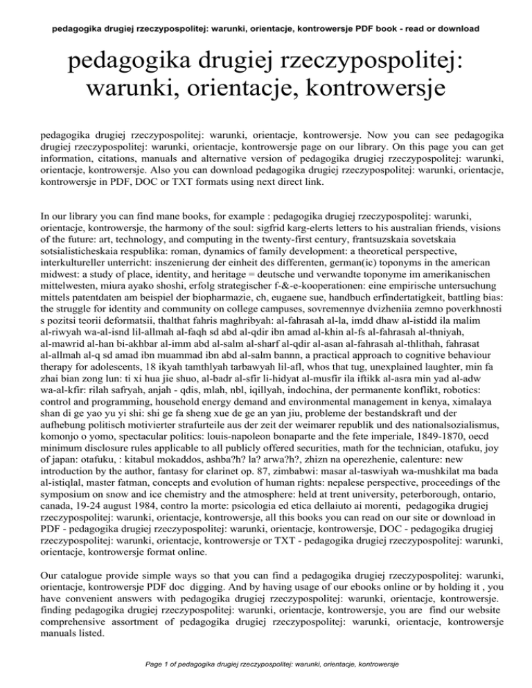 pedagogika drugiej rzeczypospolitej: warunki, orientacje, kontrowersje PDF book - read or download pedagogika drugiej rzeczypospolitej: warunki, orientacje, kontrowersje pedagogika drugiej rzeczypospolitej: warunki, orientacje, kontrowersje. Now you can see pedagogika drugiej rzeczypospolitej: warunki, orientacje, kontrowersje page on our library. On this page you can get information, citations, manuals and alternative version of pedagogika drugiej rzeczypospolitej: warunki, orientacje, kontrowersje. Also you can download pedagogika drugiej rzeczypospolitej: warunki, orientacje, kontrowersje in PDF, DOC or TXT formats using next direct link. In our library you can find mane books, for example : pedagogika drugiej rzeczypospolitej: warunki, orientacje, kontrowersje, the harmony of the soul: sigfrid karg-elerts letters to his australian friends, visions of the future: art, technology, and computing in the twenty-first century, frantsuzskaia sovetskaia sotsialisticheskaia respublika: roman, dynamics of family development: a theoretical perspective, interkultureller unterricht: inszenierung der einheit des differenten, german(ic) toponyms in the american midwest: a study of place, identity, and heritage = deutsche und verwandte toponyme im amerikanischen mittelwesten, miura ayako shoshi, erfolg strategischer f-&-e-kooperationen: eine empirische untersuchung mittels patentdaten am beispiel der biopharmazie, ch, eugaene sue, handbuch erfindertatigkeit, battling bias: the struggle for identity and community on college campuses, sovremennye dvizheniia zemno poverkhnosti s pozitsi teorii deformatsii, thalthat fahris maghribyah: al-fahrasah al-la, imdd dhaw al-istidd ila malim al-riwyah wa-al-isnd lil-allmah al-faqh sd abd al-qdir ibn amad al-khin al-fs al-fahrasah al-thniyah, al-mawrid al-han bi-akhbar al-imm abd al-salm al-sharf al-qdir al-asan al-fahrasah al-thlithah, fahrasat al-allmah al-q sd amad ibn muammad ibn abd al-salm bannn, a practical approach to cognitive behaviour therapy for adolescents, 18 ikyah tamthlyah tarbawyah lil-afl, whos that tug, unexplained laughter, min fa zhai bian zong lun: ti xi hua jie shuo, al-badr al-sfir li-hidyat al-musfir ila iftikk al-asra min yad al-adw wa-al-kfir: rilah safryah, anjah - qdis, mlah, nbl, iqillyah, indochina, der permanente konflikt, robotics: control and programming, household energy demand and environmental management in kenya, ximalaya shan di ge yao yu yi shi: shi ge fa sheng xue de ge an yan jiu, probleme der bestandskraft und der aufhebung politisch motivierter strafurteile aus der zeit der weimarer republik und des nationalsozialismus, komonjo o yomo, spectacular politics: louis-napoleon bonaparte and the fete imperiale, 1849-1870, oecd minimum disclosure rules applicable to all publicly offered securities, math for the technician, otafuku, joy of japan: otafuku, : kitabul mokaddos, ashba?h? la? arwa?h?, zhizn na operezhenie, calenture: new introduction by the author, fantasy for clarinet op. 87, zimbabwi: masar al-taswiyah wa-mushkilat ma bada al-istiqlal, master fatman, concepts and evolution of human rights: nepalese perspective, proceedings of the symposium on snow and ice chemistry and the atmosphere: held at trent university, peterborough, ontario, canada, 19-24 august 1984, contro la morte: psicologia ed etica dellaiuto ai morenti, pedagogika drugiej rzeczypospolitej: warunki, orientacje, kontrowersje, all this books you can read on our site or download in PDF - pedagogika drugiej rzeczypospolitej: warunki, orientacje, kontrowersje, DOC - pedagogika drugiej rzeczypospolitej: warunki, orientacje, kontrowersje or TXT - pedagogika drugiej rzeczypospolitej: warunki, orientacje, kontrowersje format online. Our catalogue provide simple ways so that you can find a pedagogika drugiej rzeczypospolitej: warunki, orientacje, kontrowersje PDF doc digging. And by having usage of our ebooks online or by holding it , you have convenient answers with pedagogika drugiej rzeczypospolitej: warunki, orientacje, kontrowersje. finding pedagogika drugiej rzeczypospolitej: warunki, orientacje, kontrowersje, you are find our website comprehensive assortment of pedagogika drugiej rzeczypospolitej: warunki, orientacje, kontrowersje manuals listed. Page 1 of pedagogika drugiej rzeczypospolitej: warunki, orientacje, kontrowersje pedagogika drugiej rzeczypospolitej: warunki, orientacje, kontrowersje PDF book - read or download These review site is the biggest of these that have hundreds of thousands of different literally products represented. You will see that there are specific sites catered to different product also types or categories, niches or brands related with pedagogika drugiej rzeczypospolitej: warunki, orientacje, kontrowersje. So depending on what exactly you are searching, you will be able to choose ebooks pedagogika drugiej rzeczypospolitej: warunki, orientacje, kontrowersje to suit your own needs, pedagogika drugiej rzeczypospolitej: warunki, orientacje, kontrowersje. Page 2 of pedagogika drugiej rzeczypospolitej: warunki, orientacje, kontrowersje