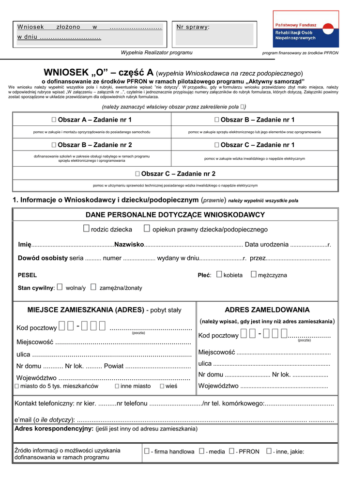 W nios ek złożono w ....... ................. Nr s pr awy: w dniu ............................ Wypełnia Realizator programu program finansowany ze środków PFRON WNIOSEK „O” – część A (wypełnia Wnioskodawca na rzecz podopiecznego) o dofinansowanie ze środków PFRON w ramach pilotażowego programu „Aktywny samorząd” We wniosku należy wypełnić wszystkie pola i rubryki, ewentualnie wpisać ”nie dotyczy”. W przypadku, gdy w formularzu wniosku przewidziano zbyt mało miejsca, należy w odpowiedniej rubryce wpisać „W załączeniu – załącznik nr ..”, czytelnie i jednoznacznie przypisując numery załączników do rubryk formularza, których dotyczą. Załączniki powinny zostać sporządzone w układzie przewidzianym dla odpowiednich rubryk formularza. (należy zaznaczyć właściwy obszar przez zakreślenie pola Obszar A – Zadanie nr 1 ) Obszar B – Zadanie nr 1 pomoc w zakupie i montażu oprzyrządowania do posiadanego samochodu pomoc w zakupie sprzętu elektronicznego lub jego elementów oraz oprogramowania Obszar B – Zadanie nr 2 Obszar C – Zadanie nr 1 dofinansowanie szkoleń w zakresie obsługi nabytego w ramach programu sprzętu elektronicznego i oprogramowania pomoc w zakupie wózka inwalidzkiego o napędzie elektrycznym Obszar C – Zadanie nr 2 pomoc w utrzymaniu sprawności technicznej posiadanego wózka inwalidzkiego o napędzie elektrycznym 1. Informacje o Wnioskodawcy i dziecku/podopiecznym (prawnie) należy wypełnić wszystkie pola DANE PERSONALNE DOTYCZĄCE WNIOSKODAWCY rodzic dziecka opiekun prawny dziecka/podopiecznego Imię...................................................Nazwisko............................................................. Data urodzenia .......................r. Dowód osobisty seria .......... numer .................... wydany w dniu...........................r. przez........................................ PESEL Stan cywilny: Płeć: wolna/y - mężczyzna zamężna/żonaty MIEJSCE ZAMIESZKANIA (ADRES) - pobyt stały Kod pocztowy kobieta ADRES ZAMELDOWANIA (należy wpisać, gdy jest inny niż adres zamieszkania) .......................................... (poczta) Kod pocztowy - ...................... (poczta) Miejscowość ..................................................................... ulica ................................................................................. Miejscowość .......................................................... Nr domu ........... Nr lok. ......... Powiat .................................... ulica ........................................................................ Województwo ................................................................... Nr domu ............................ Nr lok. ...................... miasto do 5 tys. mieszkańców inne miasto wieś Województwo ...................................................... Kontakt telefoniczny: nr kier. ..........nr telefonu ............................./nr tel. komórkowego:...................................... e’mail (o ile dotyczy): .............................................................................................................................. .............. Adres korespondencyjny: (jeśli jest inny od adresu zamieszkania) Źródło informacji o możliwości uzyskania dofinansowania w ramach programu - firma handlowa - media - PFRON - inne, jakie: W n i o s e k „O ” d o t y c zą c y d o f i n a n s o w a n i a w r a m a c h p i l o t a żo w e g o p r o g r a m u „A k t y w n y s a m o r zą d ” DANE DOTYCZĄCE DZIECKA/PODOPIECZNEGO, zwanego dalej „podopiecznym” DANE PERSONALNE MIEJSCE ZAMIESZKANIA (ADRES) (jeśli inny niż Wnioskodawcy – pobyt stały) Imię .................................................................... Kod pocztowy Nazwisko ............................................................ ............................................ - (poczta) Miejscowość ................................................................. Data urodzenia:................................................. r. Ulica ............................................................................ Nr domu ........................... Nr lok. ................................ PESEL Powiat .......................................................................... Pełnoletni: tak nie Płeć: kobieta mężczyzna Województwo ............................................................... miasto do 5 tys. mieszkańców inne miasto wieś STAN PRAWNY DOT. NIEPEŁNOSPRAWNOŚCI PODOPIECZNEGO całkowita niezdolność do pracy i do samodzielnej egzystencji lub znaczny stopień I grupa inwalidzka całkowita niezdolność do pracy umiarkowany stopień II grupa inwalidzka częściowa niezdolność do pracy lekki stopień III grupa inwalidzka całkowita niezdolność do samodzielnej egzystencji orzeczenie o niepełnosprawności – w przypadku osób do 16 roku życia Orzeczenie dot. niepełnosprawności ważne jest: okresowo do dnia: .................................................. bezterminowo RODZAJ NIEPEŁNOSPRAWNOŚCI PODOPIECZNEGO NARZĄD RUCHU 05-R, w zakresie: obu kończyn górnych jednej kończyny górnej obu kończyn dolnych jednej kończyny dolnej innym Podopieczny nie porusza się przy pomocy wózka inwalidzkiego: Podopieczny porusza się samodzielnie przy pomocy wózka inwalidzkiego: Podopieczny porusza się niesamodzielnie przy pomocy wózka inwalidzkiego: NARZĄD WZROKU 04-O osoba niewidoma Lewe oko: Ostrość wzoru (w korekcji):.............................. Prawe oko: Ostrość wzoru (w korekcji):................................... Zwężenie pola widzenia: ....................... stopni Zwężenie pola widzenia: ............................ stopni osoba głuchoniewidoma INNE PRZYCZYNY niepełnosprawności wynikające z orzeczenia (proszę zaznaczyć właściwy kod/symbol ): 01-U upośledzenie umysłowe 03-L zaburzenia głosu, mowy i choroby słuchu 07-S choroby układu oddechowego i krą