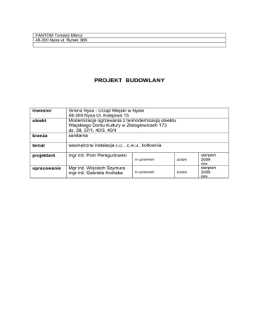 FANTOM Tomasz Mikrut 48-300 Nysa ul. Rynek 36N PROJEKT BUDOWLANY branża Gmina Nysa - Urząd Miejski w Nysie 48-300 Nysa Ul. Kolejowa 15 Modernizacja ogrzewania z termodernizacją obiektu Wiejskiego Domu Kultury w Złotogłowicach 173 dz. 38, 37/1, 40/3, 40/4 sanitarna temat wewnętrzne instalacja c.o. , c.w.u., kotłownia projektant mgr inż. Piotr Peregudowski opracowanie Mgr inż. Wojciech Szymura mgr inż. Gabriela Andraka inwestor obiekt nr uprawnień podpis sierpień 2009 data nr uprawnień podpis sierpień 2009 data Zawartość opracowania: Opis techniczny 1. Dane ogólne 2. Podstawa opracowania 3. Zakres opracowania 4. Opis rozwiązań technicznych 4.1. Instalacja centralnego ogrzewania 4.2. Kotłownia 5. Uwagi końcowe 6. Wytyczne branżowe Załączniki Rysunki: Rys. SI 1 Rys. SI 2 Rys. SI 3 Rys. SI 4 Rys. SI 5 Rys. SI 6 Rzut parteru - wewnętrzna instalacja c.o. Rzut piętra - wewnętrzna instalacja c.o. Rozwinięcie instalacja c.o. Rzut parteru – schemat wewnętrznej instalacji wodnej Rzut pietra – schemat wewnętrznej instalacji wodnej Schemat technologiczny kotłowni 2 1:100 1:100 1:100 OPIS TECHNICZNY do projektu budowlanego instalacji gazu dla modernizacji instalacji centralnego ogrzewania wraz z termomodernizacją obiektu Wiejskiego Domu Kultury w Złotogłowicach 173 dz. 38, 37/1, 40/3,40/4. 1. Dane ogólne obiekt: adres: inwestor: Wiejski Dom Kultury Złotogłowice 173 dz. 38, 37/1, 40/3,40/4 Gmina Nysa – Urząd Miejski w Nysie Remontowany obiekt to budynek 2-kodygnacyjny, niepodpiwniczony. Do budynku projektuje się przyłącze gazowe, projekt przyłącza objęty jest odrębnym opracowaniem. 2 Podstawa opracowania: zlecenie inwestora projekt budowlany architektoniczny; wytyczne projektantów branży architektonicznej i konstrukcyjnej; uzgodnienia z inwestorem; miejscowy plan zagospodarowania przestrzennego; uzgodnienia międzybranżowe; aktualne normy i przepisy. 3. Zakres opracowania. Opracowanie obejmuje projekt budowlany i schematy wykonawcze: wewnętrznej instalacji c.o. wewnętrznej instalacji c.w.u; kotłowni. 4. Opis przyjętych rozwiązań technicznych. 4.1. Instalacja centralnego ogrzewania Zapotrzebowanie na moc cieplną do ogrzania pomieszczeń wyliczono na podstawie normy PN-EN 12831. Moc cieplna dostarczana do pomieszczeń pokrywa straty ciepła spowodowane przenikaniem przez przegrody budowlane oraz zapotrzebowanie na podgrzanie powietrza wentylacyjnego. Obliczenia wykonano przyjmując następujące dane: budynek położony jest w III strefie klimatycznej; obliczeniowa temperatura powietrza zewnętrznego wynosi -200C obliczeniowe temperatury wewnętrzne w pomieszczeniach przyjęto wg rozporządzenia w sprawie warunków technicznych jakim powinny odpowiadać budynki/ Obliczenia współczynników przenikania ciepła dla poszczególnych przegród oraz strat ciepła znajdują się w egzemplarzu archiwalnym. Zapotrzebowania ciepła dla budynku wynosi Qco = 44.090 kW. Instalacje centralnego ogrzewania zaprojektowano jako dwururowa, z rozdziałem dolnym, pompową o parametrach czynnika grzejnego 70/55C , w układzie zamkniętym. Instalację centralnego ogrzewania wykonać należy z rur i kształtek miedzianych łączonych przez lutowanie. Rurociągu rozprowadzające należy prowadzić po wierzchu ścian ze spadkiem 0,3% w kierunku odwodnień. Rurociągi mocować do ścian i podłoża za pomocą obejm metalowych z wkładką gumową. Punkty stałe należy stosować z uwzględnieniem lokalizacji oporów miejscowych. Przy montażu rurociągów stosować należy zalecane przez producenta systemu maksymalne rozstawy uchwytów. 3 Przewody prowadzone w bruzdach i w podłodze należy izolować otuliną pokrytą folią np. Isoterm –flex 445. W pomieszczeniach zaprojektowano grzejniki stalowe, płytowe Buderus typu VK (z podejściem dolnym) lub inne o podobnych parametrach. Grzejniki wyposażone są w zawory termostatyczny, przy których należy zainstalować głowice termostatyczne RTD-3100. Na podejściach należy zainstalować zawory odcinające typu RLV z końcówką spustową DN15. W najwyższych punktach instalacji należy zamontować automatyczne zawory odcinające typu TacoHyVent. Po zamontowaniu instalacje należy poddać próbie szczelności oraz próbie na gorąco z regulacją układu grzejnego. 4.2 Kotłownia Dla budynku kondensacyjny Buderus zgodnie z zapotrzebowaniem ciepła na cele centralnego ogrzewania dobrano kocioł jednofunkcyjny o znamionowej mocy cieplnej 60 kW GB 112-60 prod. Firmy Charakterystyka kotła: nominalna moc cieplna masa kotła maks. ciśnienie robocze wymiary przyłącza c.o. sprawność znormalizowana króciec spalin 60 kW 72 kg 3 bar 900x685x431 mm 1 ½” 105,8% 80 mm Kocioł posiada zamknięta komorę spalania. Wyposażony jest w pogodowy system regulacji ERC z czujnikiem temperatury na zewnątrz i w pomieszczeniu. Do odprowadzenia spalin projektuje się system spalinowy dn 80 albi izolowany termicznie z płaszczem zewnętrznym ze stali nierdzewnej firmy Jeremias . Rury i kształtki należy łączyć przy użyciu uszczelek. Montaż komina wykonać ściśle z zaleceniami producenta systemu. Kocioł współpracować będzie z podgrzewaczem pojemnościowym ciepłej wody użytkowej SU 200 firmy Buderus połączonym równolegle. Podgrzewacz należy wyposażyć w czujniki temp. ciepłej wody WWF. Charakterystyka podgrzewacza pojemność 200l moc ciągła przy 80C 25kW 610 l/h wymiary h/d 1310/600mm średnica przyłącza ¾‘ Sterowanie pracą zasobnika cwu następuje poprzez zawór trójdrogowy . Pompa obiegowa – kocioł gazowy wyposażony jest w pompę obiegową. Pompa cyrkulacyjna – dobrano pompę Z 15 firmy WILO. Rurociągi instalacji w kotłowni zaprojektowano z rur miedzianych półtwardych i miękkich łączonych metodą lutowania kapilarnego prowadzonych po wierzchu ścian Zabezpieczenie instalacji c.o. Zabezpieczeniem kotła będzie, zgodnie z PN-91/B-02414, naczynie wzbiorcze przeponowe oraz zawór bezpieczeństwa. Dob