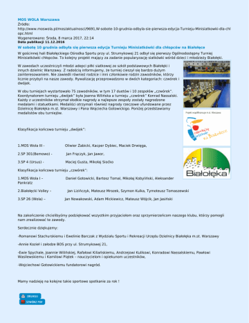 MOS WOLA Warszawa Źródło: http://www.moswola.pl/mos/aktualnosci/9691,W-sobote-10-grudnia-odbyla-sie-pierwsza-edycja-Turnieju-Minisiatkowki-dla-chl opc.html Wygenerowano: Środa, 8 marca 2017, 22:14 Data publikacji 11.12.2016 W sobotę 10 grudnia odbyła się pierwsza edycja Turnieju Minisiatkówki dla chłopców na Białołęce W gościnnej hali Białołęckiego Ośrodka Sportu przy ul. Strumykowej 21 odbył się pierwszy Ogólnodostępny Turniej Minisiatkówki chłopców. To kolejny projekt mający za zadanie popularyzację siatkówki wśród dzieci i młodzieży Białołęki. W zawodach uczestniczyli młodzi adepci piłki siatkowej ze szkół podstawowych Białołęki i innych dzielnic Warszawy. Z radością informujemy, że turniej cieszył się bardzo dużym zainteresowaniem. Nie zawiedli również rodzice i inni członkowie rodzin zawodników, którzy licznie przybyli na nasze zawody. Rywalizację przeprowadzono w dwóch kategoriach: czwórek i dwójek. W obu turniejach wystartowało 75 zawodników, w tym 17 duetów i 10 zespołów „czwórek”. Koordynatorem turnieju „dwójek” była Joanna Wilińska a turnieju „czwórek” Konrad Nassalski. Każdy z uczestników otrzymał słodkie nagrody a najlepsze zespoły zostały nagrodzone medalami i statuetkami. Medaliści otrzymali również nagrody rzeczowe ufundowane przez Dzielnicę Białołęka m.st. Warszawy i Pana Wojciecha Gotowickigo. Poniżej przedstawiamy medalistów obu turniejów. Klasyfikacja końcowa turnieju „dwójek”: 1.MOS Wola III - Oliwier Żabicki, Kacper Dybiec, Maciek Drwięga, 2.SP 301(Bemowo) - Jan Frączyk, Jan Jawor, 3.SP 4 (Ursus) - Maciej Gusta, Mikołaj Sioćko Klasyfikacja końcowa turnieju „czwórek”: 1.MOS Wola I – Pankratz 2.Białołęcki Volley – 3.SP 26 (Wola) – Daniel Gotowicki, Bartosz Tomal, Mikołaj Kobyliński, Aleksander Jan Lizińczyk, Mateusz Mrozek, Szymon Kulka, Tymoteusz Tomaszewski Jan Nowakowski, Adam Mickiewicz, Mateusz Wójcik, Jan Jasiński Na zakończenie chcielibyśmy podziękować wszystkim przyjaciołom oraz sprzymierzeńcom naszego klubu, którzy pomogli nam zrealizować te zawody. Serdecznie dziękujemy: -Romanowi Stachurskiemu i Ewelinie Barczak z Wydziału Sportu i Rekreacji Urzędu Dzielnicy Białołęka m.st. Warszawy -Annie Kozieł i załodze BOS przy ul. Strumykowej 21, -Ewie Spychale, Joannie Wilińskiej, Rafałowi Kiliańskiemu, Andrzejowi Kulikowi, Konradowi Nassalskiemu, Pawłowi Wasilewskiemu i Kamilowi Piątek – nauczycielom i opiekunom uczestników, -Wojciechowi Gotowickiemu fundatorowi nagród. Mamy nadzieję na kolejne takie sportowe spotkanie za rok ! Komentarz (0) dodaj komentarz Brak komentarzy dodaj komentarz