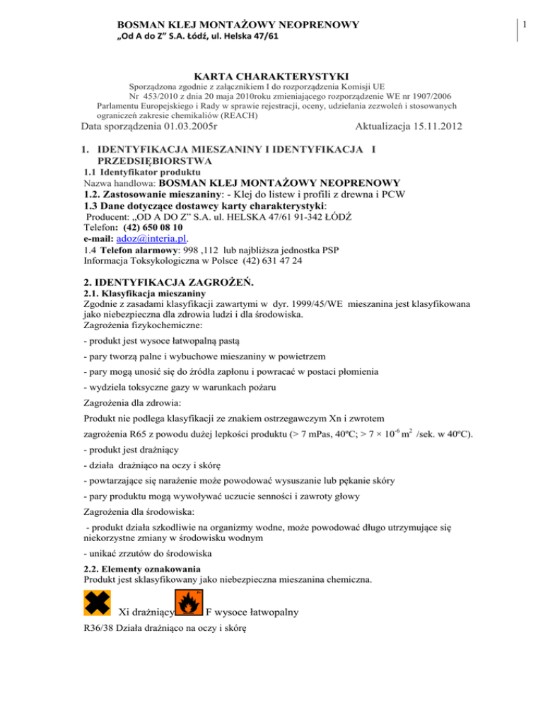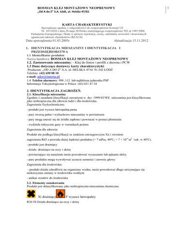 BOSMAN KLEJ MONTAŻOWY NEOPRENOWY „Od A do Z” S.A. Łódź, ul. Helska 47/61 KARTA CHARAKTERYSTYKI Sporządzona zgodnie z załącznikiem I do rozporządzenia Komisji UE Nr 453/2010 z dnia 20 maja 2010roku zmieniającego rozporządzenie WE nr 1907/2006 Parlamentu Europejskiego i Rady w sprawie rejestracji, oceny, udzielania zezwoleń i stosowanych ograniczeń zakresie chemikaliów (REACH) Data sporządzenia 01.03.2005r Aktualizacja 15.11.2012 1. IDENTYFIKACJA MIESZANINY I IDENTYFIKACJA I PRZEDSIĘBIORSTWA 1.1 Identyfikator produktu Nazwa handlowa: BOSMAN KLEJ MONTAŻOWY NEOPRENOWY 1.2. Zastosowanie mieszaniny: - Klej do listew i profili z drewna i PCW 1.3 Dane dotyczące dostawcy karty charakterystyki: Producent: „OD A DO Z” S.A. ul. HELSKA 47/61 91-342 ŁÓDŹ Telefon: (42) 650 08 10 e-mail: [email protected]. 1.4 Telefon alarmowy: 998 ,112 lub najbliższa jednostka PSP Informacja Toksykologiczna w Polsce (42) 631 47 24 2. IDENTYFIKACJA ZAGROŻEŃ. 2.1. Klasyfikacja mieszaniny Zgodnie z zasadami klasyfikacji zawartymi w dyr. 1999/45/WE mieszanina jest klasyfikowana jako niebezpieczna dla zdrowia ludzi i dla środowiska. Zagrożenia fizykochemiczne: - produkt jest wysoce łatwopalną pastą - pary tworzą palne i wybuchowe mieszaniny w powietrzem - pary mogą unosić się do źródła zapłonu i powracać w postaci płomienia - wydziela toksyczne gazy w warunkach pożaru Zagrożenia dla zdrowia: Produkt nie podlega klasyfikacji ze znakiem ostrzegawczym Xn i zwrotem zagrożenia R65 z powodu dużej lepkości produktu (> 7 mPas, 40ºC; > 7 × 10-6 m2 /sek. w 40ºC). - produkt jest drażniący - działa drażniąco na oczy i skórę - powtarzające się narażenie może powodować wysuszanie lub pękanie skóry - pary produktu mogą wywoływać uczucie senności i zawroty głowy Zagrożenia dla środowiska: - produkt działa szkodliwie na organizmy wodne, może powodować długo utrzymujące się niekorzystne zmiany w środowisku wodnym - unikać zrzutów do środowiska 2.2. Elementy oznakowania Produkt jest sklasyfikowany jako niebezpieczna mieszanina chemiczna. Xi drażniący F wysoce łatwopalny R36/38 Działa drażniąco na oczy i skórę 1 BOSMAN KLEJ MONTAŻOWY NEOPRENOWY „Od A do Z” S.A. Łódź, ul. Helska 47/61 R52/53 Działa szkodliwie na organizmy wodne; może powodować długo utrzymujące się niekorzystne zmiany w środowisku wodnym R66 Powtarzające się narażenie może powodować wysuszanie lub pękanie skóry R67 Pary mogą wywoływać uczucie senności i zawroty głowy S2 Chronić przed dziećmi S16 Nie przechowywać w pobliżu źródeł zapłonu – nie palić tytoniu S23 Nie wdychać par S24 Unikać zanieczyszczenia skóry S46 W razie połknięcia niezwłocznie zasięgnij porady lekarza – pokaż opakowanie lub etykietę S61 Unikać zrzutów do środowiska. Postępować zgodnie z instrukcją lub kartą charakterystyki 2.3 Inne zagrożenia Produkt nie spełnia kryteriów PBT lub vPvB zgodnie z załącznikiem XIII REACH 3. SKŁAD/INFORMACJA O SKŁADNIKACH. Produkt jest mieszaniną substancji niebezpiecznych klasyfikowanych zgodnie z Rozporządzeniem (WE) nr 1272/2008 z dnia 16.12.2008 r. w sprawie klasyfikacji, oznakowania i pakowania substancji i mieszanin, zmieniające i uchylające dyrektywy 67/548/EWG i 1999/45/WE oraz zmieniające rozporządzenie (WE) nr 1907/2006, oraz na podstawie danych dostarczonych przez producenta i na podstawie ogólnej wiedzy o substancjach izoalkany C9 do C12 Nr CAS 90622-57-4, NR WE 292-459-0 Stężenie: 10-30% Klasyfikacja zgodnie z zał. I do dyrektywy 67/548/EWG: F;R11, Xn; R65; Xi; R38; ; R67 N; R51/53 Klasyfikacja zgodnie z rozp. WE 1272/2008: H225 , H304: Skin Irrit. 2; H315 , H336 Aquatic Acute 1 ;H400, Aquatic Chronic1 H410 niebezpieczeństwo Octan etylu Nr indeksowy 607-022-00-5; Nr CAS 141-78-6, Nr WE 205-500-4 Stężenie: 10-30% Klasyfikacja zgodnie z zał. I do dyrektywy 67/548/EWG: F; R11; Xi; R36; R66; R67 Klasyfikacja zgodnie z rozp. WE 1272/2008: H225, H319,EUH066 ,H336 Niebezpieczeństwo 4. ŚRODKI PIERWSZEJ POMOCY 2 BOSMAN KLEJ MONTAŻOWY NEOPRENOWY „Od A do Z” S.A. Łódź, ul. Helska 47/61 Zatrucie inhalacyjne W normalnych warunkach produkt nie stanowi zagrożenia. W przypadku złego samopoczucia wyprowadzić osobę poszkodowaną na świeże powietrze, zapewnić spokój, ewentualnie wezwać pomoc medyczną. Skażenie oczu Usunąć szkła kontaktowe, przemyć oczy dużą ilością wody przez ok. 15 minut. Podczas płukania trzymać powieki szeroko otwarte i poruszać gałką oczną (unikać silnego strumienia wody ze względu na ryzyko uszkodzenia rogówki) Zwrócić się o pomoc do lekarza okulisty. Skażenie skóry Zdjąć zanieczyszczoną odzież, skażoną skórę zmyć dokładnie dużą ilością wody, najlepiej bieżącej(nie gorącej). W przypadku utrzymywania się podrażnienia, posmarować skórę kremem i skonsultować się z lekarzem. Spożycie W przypadku połknięcia natychmiast zapewnić pomoc lekarską 5. POSTĘPOWANIE W PRZYPADKU POŻARU Produkt jest wysoce palną pastą. Pary preparatu tworzą palne i wybuchowe mieszaniny z powietrzem. 5.1 Środki gaśnicze : dwutlenek węgla, (gaśnica śniegowa), proszek gaśniczy, prądy wodne rozproszone, piana gaśnicza odporna na działanie alkoholu . proszki gaśnicze, piany, Nieodpowiednie środki gaśnicze nie stosować zwartych strumieni wody . 5.2 Szczególne zagrożenia związane z substancją lub mieszaniną Zalecenia ogólne: Zawiadomić otoczenie o pożarze. Usunąć z obszaru zagrożenia wszystkie osoby postronne. W razie potrzeby wezwać Straż Pożarną i Policję. Zbiorniki narażone na działanie ognia lub wysokiej temperatury chłodzić wodą z bezpiecznej odległości, a jeżeli to możliwe usunąć je z obszaru zagrożenia. Podczas spalania preparatu powstają dymy zawierające niebezpieczne dla zdrowia substancje chemiczne, m.in. tlenki węgla, azotu. 5.3 Informacje dla straży pożarnej -odzież ochronna gazoszczelna, aparat izoluj