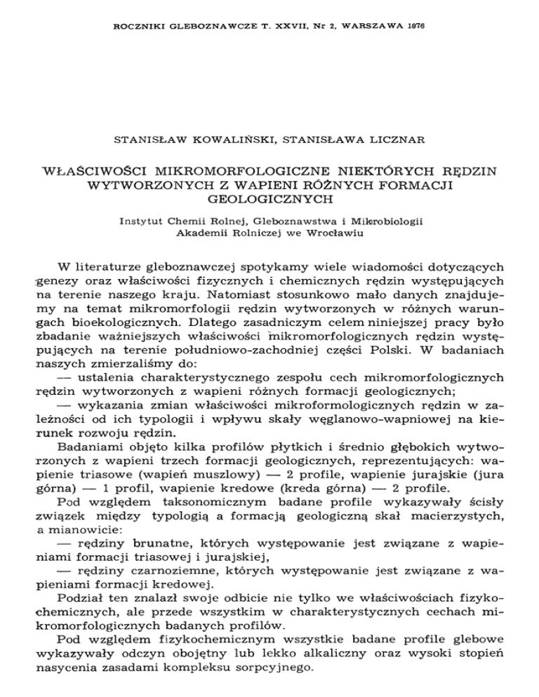 R O C Z N I K I G L E B O Z N A W C Z E T . X X V I I , N r 2, W A R S Z A W A 1876 ST A N ISŁ A W K O W ALIŃ SK I, ST A N ISŁ A W A LICZNAR WŁAŚCIWOŚCI MIKROMORFOLOGICZNE NIEKTÓRYCH RĘDZIN WYTWORZONYCH Z WAPIENI RÓŻNYCH FORMACJI GEOLOGICZNYCH In stytu t C hem ii R olnej, G leb ozn aw stw a i M ikrobiologii A k ad em ii R olniczej w e W rocław iu W literaturze gleboznawczej spotykamy wiele wiadomości dotyczących •genezy oraz właściwości fizycznych i chemicznych rędzin występujących na terenie naszego kraju. Natomiast stosunkowo mało danych znajduje my na temat mikromorfologii rędzin wytworzonych w różnych warungach bioekologicznych. Dlatego zasadniczym celem niniejszej pracy było zbadanie ważniejszych właściwości mikromorfologicznych rędzin w ystę pujących na terenie południowo-zachodniej części Polski. W badaniach naszych zmierzaliśmy do: — ustalenia charakterystycznego zespołu cech mikromorfologicznych rędzin wytworzonych z wapieni różnych formacji geologicznych; — wykazania zmian właściwości mikroformologicznych rędzin w za leżności od ich typologii i wpływ u skały węglanowo-wapniowej na kie runek rozwoju rędzin. Badaniami objęto kilka profilów płytkich i średnio głębokich w ytw o rzonych z wapieni trzech formacji geologicznych, reprezentujących: w a pienie triasowe (wapień muszlowy) — 2 profile, wapienie jurajskie (jura górna) — 1 profil, wapienie kredowe (kreda górna) — 2 profile. Pod względem taksonomicznym badane profile w ykazyw ały ścisły związek między typologią a formacją geologiczną skał macierzystych, a mianowicie: — rędziny brunatne, których występowanie jest związane z wapie niami formacji triasowej i jurajskiej, — rędziny czarnoziemne, których występowanie jest związane z w a pieniami formacji kredowej. Podział ten znalazł swoje odbicie nie tylko we właściwościach fizyko chemicznych, ale przede wszystkim w charakterystycznych cechach m i kromorfologicznych badanych profilów. Pod względem fizykochemicznym wszystkie badane profile glebowe wykazyw ały odczyn obojętny lub lekko alkaliczny oraz wysoki stopień nasycenia zasadami kompleksu sorpcyjnego. 94 S. Kowaliński, S. Licznar Duże różnice w obrębie badanych podtypów rędzin wykazyw ały w ła ściwości mikromorfologiczne, które potwierdziły konieczność typologicz nego podziału tych gleb na podstawie formacji geologicznej skał m acie rzystych oraz pozwoliły na wykazanie zespołu cech charakterystycznych dla poszczególnych jednostek taksonomicznych. W profilach badanych rędzin brunatnych wytworzonych z wapieni triasowych najmniej zróżnicowane są poziomy akumulacyjne, w których występuje stosunkowo duża ilość substancji organicznej o daleko posu niętym rozkładzie. Mikromorfologicznie wykazano, że w poziomie akumu lacyjnym rędziny wytworzonej z wapienia jurajskiego występuje znacz nie więcej substancji organicznej niż w poziomie akumulacyjnym rędzin wytworzonych z wapieni triasowych. Substancja ta jest w formie m ullikolu i argilla-humikolu. W składzie plazmy rędzin brunatnych spotyka się duże różnice jako ściowe i ilościowe. W rędzinach brunatnych wytworzonych z wapienia triasowego występuje znacznie większa ilość substancji ilastej niż w rę dzinie wytworzonej z wapienia jurajskiego. W składzie plazmy rędzin brunatnych wytworzonych z wapienia triasowego znajduje się znacznie więcej związków glinu i żelaza niż w rędzinie wytworzonej z wapienia jurajskiego. W typach plazmy rędzin brunatnych nie widać większego zróżnicowania. We frakcji szkieletowej obok fragmentów związanych ze zwietrzelinami skał macierzystych występują ziarna nie związane z utworami w ęglanowo-wapiennymi. Badane rędziny czarnoziemne wytworzone z wapieni kredowych wyraźnie różnią się od rędzin brunatnych swoimi właściwościami m ikromorfologicznymi. Ich poziomy akumulacyjne odznaczają się obecno ścią podobnych struktur plazmowych oraz znaczną domieszką detrytusu mineralnego skał macierzystych. Szczególnie dużo szkieletu występuje w rędzinach czarnoziemnych mających płytki profil glebowy. Wśród czę ści szkieletowych występują również ziarna nie będące produktami zwie trzenia skał węglanowo-wapiennych. Plazma rędzin czarnoziemnych zbudowana jest z części ilastych oraz domieszki silnie zhumifikowanej substancji organicznej i związków w ęg lanu wapnia. Prawie cała masa substancji organicznej ma postać m ullikolu, a tylko nieliczne fragmenty endohumusu są słabiej rozłożone o strukturze humiskelu. Poza tym spotyka się liczne ekskrementy i bioformacje pochodzenia zwierzęcego. Zarówno w rędzinach brunatnych, jak i czarnoziemnych obserwowa no występowanie nowotworów i konkrecji węglanowo-wapiennych w po staci neokalcytanów, przy czym rędziny czarnoziemne zawierały ich znacznie więcej niż 'rędziny brunatne. V/ obu przypadkach neokalcytany w ystępowały w poziomach przejściowych, chociaż w rędzinach czarno ziemnych obserwowano je również w poziomie akumulacyjnym. Właściwości mikromorfologiczne rędzin z wapieni 95 Przeprowadzone badania pozwoliły na wyciągnięcie następujących wniosków: 1. W szystkie badane rędziny zostały wytworzone ze zwietrzelin skał węglanowo-wapniowych przy współudziale obcej niewęglanowej domiesz ki. Dlatego też mają one charakter rędzin mieszanych. W rędzinach bru natnych ilość materiału obcego pochodzenia jest znacznie większa niż w rędzinach czarnoziemnych. Znajduje to swój wyraz we właściwościach mikromorfologicznych poszczególnych podtypów rędzin. 2. Duży w pływ na typiologię rędzin oraz ich właściwości mikromorfo logiczne wywiera aktywność węglanu wapnia, która uzależniona jest od mechanicznych i fizykochemicznych właściwości skał macierzystych ba danych utworów glebowych. 3. Zbite i mniej aktywne wapienie formacji triasowej i jurajskiej sprzyjają tworzeniu się 