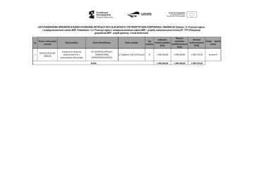 LISTA RANKINGOWA WNIOSKÓW W RAMACH KONKURSU NR RPLB.01.04.01-IZ.00-08-K03/16 I OŚ PRIORYTETOWA GOSPODARKA I INNOWACJE Działanie 1.4. Promocja regionu i umiędzynarodowienie sektora MŚP, Poddziałanie 1.4.1 Promocja regionu i umiędzynarodowienie sektora MŚP – projekty realizowane poza formułą ZIT, TYP III Ekspansja gospodarcza MŚP - projekt grantowy, I runda konkursowa Numer referencyjny Lp. wniosku 1 RPLB.01.04.01-080008/16 Tytuł projektu Nazwa Beneficjenta Adres siedziby Zwiększenie ekspansji eksportowej firm z województwa lubuskiego DC CENTRUM SPÓŁKA Z OGRANICZONĄ ODPOWIEDZIALNOŚCIĄ ul. Reglowa 3 60-113 Poznań SUMA Wartość Całkowita Wartość Typ Uwagi (wynik wydatków wartość projektu dofinansowania oceny) projektu kwalifikowalnych (PLN) (PLN) (PLN) III 1 998 200,00 1 998 200,00 1 698 270,18 1 998 200,00 1 998 200,00 1 698 270,18 pozytywny