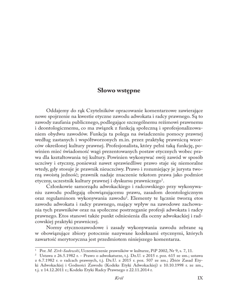 Słowo wstępne Oddajemy do rąk Czytelników opracowanie komentarzowe zawierające nowe spojrzenie na kwestie etyczne zawodu adwokata i radcy prawnego. Są to zawody zaufania publicznego, podlegające szczególnemu reżimowi prawnemu i deontologicznemu, co ma związek z funkcją społeczną i sprofesjonalizowaniem obydwu zawodów. Funkcja ta polega na świadczeniu pomocy prawnej według zastanych i współtworzonych m.in. przez praktykę prawniczą wzorców określonej kultury prawnej. Profesjonalista, który pełni taką funkcję, powinien mieć świadomość wagi prezentowanych postaw etycznych wobec prawa dla kształtowania tej kultury. Powinien wykonywać swój zawód w sposób uczciwy i etyczny, ponieważ nawet sprawiedliwe prawo staje się niemoralne wtedy, gdy stosuje je prawnik nieuczciwy. Prawo i rozumiejący je jurysta tworzą swoistą jedność; prawnik nadaje znaczenie tekstom prawa jako podmiot etyczny, uczestnik kultury prawnej i dyskursu prawniczego1. Członkowie samorządu adwokackiego i radcowskiego przy wykonywaniu zawodu podlegają obowiązującemu prawu, zasadom deontologicznym oraz regulaminom wykonywania zawodu2. Elementy te łącznie tworzą etos zawodu adwokata i radcy prawnego, mający wpływ na zawodowe zachowania tych prawników oraz na społeczne postrzeganie profesji adwokata i radcy prawnego. Etos stanowi także punkt odniesienia dla oceny adwokackiej i radcowskiej praktyki prawniczej. Normy etycznozawodowe i zasady wykonywania zawodu zebrane są w obowiązujące zbiory potocznie nazywane kodeksami etycznymi, których zawartość merytoryczna jest przedmiotem niniejszego komentarza. Por. M. Zirk-Sadowski, Uczestniczenie prawników w kulturze, PiP 2002, Nr 9, s. 7, 11. Ustawa z 26.5.1982 r. − Prawo o adwokaturze, t.j. Dz.U. z 2015 r. poz. 615 ze zm.; ustawa z 6.7.1982 r. o radcach prawnych, t.j. Dz.U. z 2015 r. poz. 507 ze zm.; Zbiór Zasad Etyki Adwokackiej i Godności Zawodu (Kodeks Etyki Adwokackiej) z 10.10.1998 r. ze zm., t.j. z 14.12.2011 r.; Kodeks Etyki Radcy Prawnego z 22.11.2014 r. 1 2 Król IX Słowo wstępne W pierwszej – ogólnej – części niniejszego opracowania zawarte jest syntetyczne omówienie wybranych – spośród podstawowych – zagadnień odnoszących się do kodeksów etycznych i kwestii powiązanych. Rozdział 1 poświęcony jest praktyce adwokackiej i praktyce radcy prawnego jako profesji, ukazuje proces profesjonalizacji zawodu adwokata i radcy prawnego, etapy tego procesu, jego znaczenie i funkcje. W rozdziale 2 postawione jest pytanie o świadczenie pomocy prawnej jako usługi oraz o status radcy prawnego i adwokata jako przedsiębiorcy. Rozdział 3 zawiera wyjaśnienie takich pojęć jak obowiązek prawny, deontologiczny, etycznozawodowy i etyczny. Rozdział 4 odnosi się do podstawowego problemu roli i funkcji kodeksów etyki zawodowej w zawodach adwokata i radcy prawnego, w tym ich funkcji edukacyjnej, gwarancyjnej, budowy wizerunku, integracyjnej, wyznaczania granic dyskursu prawnego oraz funkcji orzeczniczej. Kodeksy pozwalają przede wszystkim budować reguły rozstrzygnięcia w sprawach dyscyplinarnych, a także rekonstruować role społeczne adwokatów i radców prawnych, co ma znaczenie tak dla realizacji funkcji orzeczniczej kodeksów, jak i w procesie wykonywania zawodu adwokata i radcy prawnego. Zagadnieniem o wielkiej wadze orzeczniczej, mającym bezpośrednie przełożenie na status i znaczenie etyk zawodowych, jest kwestia podstaw wymierzania kar dyscyplinarnych, dopuszczalności ich wymierzania i egzekwowania − na podstawie samych kodeksów deontologicznych w odniesieniu do zachowań stanowiących przewinienia dyscyplinarne nieregulowane ustawowo. Zarysowana w orzecznictwie tendencja, nieuznająca autonomii etyk zawodowych w tym zakresie, jest przedmiotem krytyki w rozdziale 4 opracowania. W rozdziale tym ukazany jest także proces i historia kodyfikacji zasad etyk zawodowych obu zawodów prawniczych w Polsce, a także formalny status kodeksów etycznych. Regulacje etyczne przeszły ewolucję, na co zwraca się uwagę w prezentowanym opracowaniu, od kodeksów etycznych w ścisłym znaczeniu do zbiorów reguł profesjonalnego wykonywania zawodu i odpowiedzialności zawodowej. Ocena instytucji kodeksów etyk zawodowych pozostaje kwestią sporną, na co wskazuje się w tym rozdziale. Kontrowersje dotyczą potrzeby uchwalania kodeksów, zakresu regulacji, podstawy obowiązywania i legitymacji sankcjonowania przewinień dyscyplinarnych, a ponadto oddziaływania na świadomość etyczną środowiska zawodowego, postaw moralnych, motywacji przestrzegania zasad etycznozawodowych itp. Rozdział 5 części ogólnej poświęcony jest bardzo ważnej kwestii odpowiedzialności etycznozawodowej za treść prawa wszystkich prawników, w tym adwokatów i radców prawnych, którzy wypowiadają się na temat prawa przy świadczeniu pomocy prawnej. Pomoc prawna prawie zawsze sprowadza się do konieczności ustalenia jaka jest treść prawa. Próba zakreślenia ram tej odpowiedzialności skłania Autora rozdziału 5 do postawienia pytania o etyczny wymiar podejmowania się przez prawników prowadzenia „spraw beznadziejnych”. X Król Słowo wstępne Analiza kodeksów deontologicznych pozwoliła Autorom części ogólnej stwierdzić, że regulacje kodeksowe nie wyczerpują całokształtu zagadnień etycznozawodowych, lecz stanowią co najwyżej „minimum moralności zawodowej”. Kodeksy zasadniczo zajmują się jedynie wycinkiem etyki zawodowej. Twórcy kodeksów pozostawiają do indywidualnej decyzji prawnika, opartej na intuicji moralnej i aspiracjach etycznych, stosowanie w sprawach zawodowych etyki aspiracji i dążeń. Z zaniechania regulacji niektórych obowiązków w kodeksach deontologicznych wywodzona jest czasem swoboda – a nawet dowolność – działania w sferze nieobjętej regulacją. Pogląd taki nie zasługuje na uznanie w oczach Autorów komentarza. Część II opracowania zawiera komentarz do etyki a