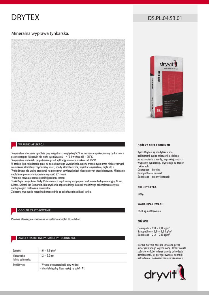 DRYTEX DS.PL.04.53.01 Mineralna wyprawa tynkarska. WARUNKI APLIKACJI OGÓLNY OPIS PRODUKTU Temperatura otoczenia i podłoża przy wilgotności względnej 55% w momencie aplikacji masy tynkarskiej i przez następne 48 godzin nie może być niższa niż +4˚C i wyższa niż +25˚C. Temperatura materiału bezpośrednio przed aplikacją nie może przekraczać 25˚C. W trakcie i po zakończeniu prac, aż do całkowitego wyschnięcia, należy chronić tynk przed niekorzystnymi warunkami atmosferycznymi (silny wiatr, opady atmosferyczne, wysoka temperatura, mgła, itp.). Tynku Drytex nie wolno stosować na poziomych powierzchniach nieosłoniętych przed deszczem. Minimalne nachylenie powierzchni powinno wynosić 27 stopni. Tynku nie można stosować poniżej poziomu terenu. Tynki Drytex mają kolor biały. Kolor elewacji uzyskiwany jest poprzez malowanie farbą elewacyjną Dryvit Silstar, Colorsil lub Demandit. Dla uzyskania odpowiedniego koloru i właściwego zabezpieczenia tynku niezbędne jest malowanie dwukrotne. Zalecamy myć wodą narzędzia bezpośrednio po zakończeniu aplikacji tynku. Tynki Drytex są modyfikowaną polimerami suchą mieszanką, dającą po rozrobieniu z wodą, wysokiej jakości wyprawę tynkarską. Występują w trzech fakturach: Quarzputz – kornik; Sandpebble – baranek; Sandblast – drobny baranek; KOLORYSTYKA Biały. WAGA/OPAKOWANIE OGÓLNE ZASTOSOWANIE 25,0 kg netto/worek Powłoka elewacyjna stosowana w systemie ociepleń Drysulation. ZALETY I ISTOTTNE PARAMETRY TECHNICZNE Gęstość: 1,6 ÷ 1,9 g/cm Maksymalna frakcja uziarnienia: 1,2 ÷ 2,0 mm Tynki Drytex: - Wysoka przepuszczalność pary wodnej - Materiał niepalny (klasa reakcji na ogień - A1) 3 ZUŻYCIE Quarzputz – 2,6 – 2,8 kg/m2 Sandpebble – 2,6 – 2,8 kg/m2 Sandblast – 2,2 – 2,5 kg/m2 Norma zużycia została ustalona przez autoryzowanego wykonawcę. Rzeczywiste zużycie w dużej mierze zależy od rodzaju powierzchni, jej przygotowania, techniki nakładania i doświadczenia wykonawcy. DRYTEX DS.PL.04.53.01 Mineralna wyprawa tynkarska. WARUNKI I CZAS PRZECHOWYWANIA PRZYGOTOWANIE PODŁOŻA Powierzchnia powinna być gładka, czysta, sucha, dobrze związana, wolna od nalotów, wykwitów, tłustych plam i innych środków utrudniających aplikację. Warstwa wyschniętej zaprawy klejącej z zatopioną systemową siatką zbrojącą tworzy warstwę bazową gotową do aplikacji tynków mineralnych. Należy zwrócić szczególną uwagę na odpowiednie wyschniecie warstwy bazowej przed rozpoczęciem aplikacji tynku Drytex. Przechowywać w zamkniętych oryginalnych opakowaniach, w suchych pomieszczeniach w temperaturze od 4˚C do 38˚C, maksimum 12 miesięcy od daty produkcji podanej na opakowaniu. Opakowania należy chronić przed uszkodzeniami oraz bezpośrednim wpływem warunków atmosferycznych i wilgoci. KOLORYSTYKA PRZYGOTOWANIE MATERIAŁU DO UŻYCIA Do czystego wiadra o pojemności 20 l należy nalać ok. 5,5 – 6,0 l czystej wody, a następnie dodawać suchą wyprawę i mieszać mieszarką wolnoobrotową (ilość obrotów 400-500 obr/min) do momentu uzyskania jednorodnej masy. Następnie wyprawę należy odstawić na ok. 5 minut, aby dojrzała. Przemieszać ponownie, dodając w razie potrzeby niewielką ilość wody. Po rozrobieniu z wodą czas przydatności do użycia wynosi 1-2 godziny i zależy od warunków atmosferycznych. SPOSÓB UŻYCIA/APLIKACJI 1) Wyprawę tynkarską Drytex należy nakładać przy użyciu pacy ze stali nierdzewnej na grubość największego kruszywa. 2) Fakturę kształtować na świeżo nałożonym materiale poprzez zatarcie pacą plastikową. Całą powierzchnię należy zacierać jednakowymi ruchami pacy. Aplikacja masy tynkarskiej na jednolitej powierzchni musi być wykonywana w sposób ciągły (bez przerw). Aplikacja powinna być wykonana przez autoryzowanego wykonawcę. Biały. WAGA/OPAKOWANIE 25,0 kg netto/worek CZAS SCHNIĘCIA Około 48 godzin w temperaturze +20˚C i przy wilgotności względnej 55%. W niższych temperaturach i przy wyższej wilgotności względnej czas schnięcia ulega wydłużeniu. KONSERWACJA Z uwagi na konieczność malowania tynków Drytex sposób konserwacji opisany jest w kartach technicznych farb elewacyjnych Dryvit. DOPUSZCZENIE DO ZASTOSOWANIA Dopuszczenie do zastosowania Produkt zgodny z: ETA-08/0210, AT-15-2717/2014 Produkt posiada Atest Higieniczny PZH: HK/B/0877/01/2012 Powyższe informacje są zgodne ze specyfikacjami odnośnie instalacji systemów Dryvit i są przedstawione w dobrej wierze. Dryvit nie ponosi odpowiedzialności za prace projektanta i wykonawcy. W celu upewnienia się, że korzystają Państwo z najnowszych informacji, prosimy o kontakt z naszą firmą. Karta techniczna numer DS.PL.04.53.01 zastępuje kartę techniczną numer DS.02.04.4803 DRYVIT SYSTEMS USA (EUROPE) PAŹDZIERNIK ‘2016