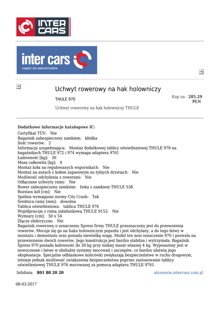Uchwyt rowerowy na hak holowniczy THULE 970 Kup za: 285.29 PLN Uchwyt rowerowy na hak holowniczy THULE Dodatkowe informacje katalogowe IC: Certyfikat TÜV: Nie Bagażnik zabezpieczony zamkiem: kłódka Ilość rowerów: 2 Informacja uzupełniająca: Montaż dodatkowej tablicy oświetleniowej THULE 976 na bagażnikach THULE 972 i 974 wymaga adaptera 9761 Ładowność [kg]: 30 Masa całkowita [kg]: 4 Montaż koła na regulowanych wspornikach: Nie Montaż na autach z kołem zapasowym na tylnych drzwiach: Nie Możliwość odchylenia z rowerami: Nie Odłączane uchwyty ramy: Nie Rower zabezpieczony zamkiem: linka z zamkiem THULE 538 Rozstaw kół [cm]: Nie Spełnia wymagania normy City Crash: Tak Średnica ramy [mm]: dowolna Tablica oświetleniowa: tablica THULE 976 Współpracuje z ramą załadunkową THULE 9152: Nie Wymiary [cm]: 50 x 54 Złącze elektryczne: Nie Bagażnik rowerowy o oznaczeniu Xpress firmy THULE przeznaczony jest do przewożenia rowerów. Mocuje się go na haku holowniczym pojazdu i jest odchylany, a do tego łatwy w montażu i demontażu oraz posiada niewielką wagę. Model ten nosi oznaczenie 970 i pozwala na przewiezienie dwóch rowerów. Jego konstrukcja jest bardzo stabilna i wytrzymała. Bagażnik Xpress 970 posiada ładowność do 30 kg przy niskiej masie własnej 4 kg. Wyposażony jest w nowoczesne i łatwe w obsłudze systemy mocowań i zaczepów, co bardzo ułatwia jego eksploatacje. Specjalne odblaskowe końcówki zwiększają bezpieczeństwo w ruchu drogowym, istnieje jednak możliwość zwiększenia bezpieczeństwa poprzez zastosowanie tablicy oświetleniowej THULE 976 mocowanej za pomocą adaptera THULE 9761. Infolinia: 801 80 20 20 08-03-2017 akcesoria.intercars.com.pl