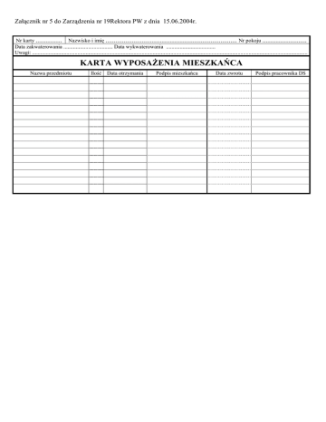 Załącznik nr 5 do Zarządzenia nr 19Rektora PW z dnia 15.06.2004r. Nr karty ................ Nazwisko i imię ................................................................................ Nr pokoju ........................... Data zakwaterowania .................................... Data wykwaterowania .................................... Uwagi: ......................................................................................................................................................................................................... KARTA WYPOSAŻENIA MIESZKAŃCA Nazwa przedmiotu Ilość Data otrzymania Podpis mieszkańca Data zwrotu Podpis pracownika DS