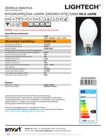 ŹRÓDŁA ŚWIATŁA LAMPY WYŁADOWCZE WYSOKOPRĘŻNA LAMPA ŻAROWO-RTĘCIOWA MLS 160W 160W 230V 360° 50/60 Hz 0,75A E27 IP20 100% 100% 25 po 4 000h 4 000h 16 000x Trwałość Liczba cykli włącz/wyłącz 60s UWAGA! Lampa nie jest przeznaczona do oświetlenia akcentowego. Specyfikacja techniczna Moc: Napięcie znamionowe: 160W 230V ~50/60Hz • 115V - 0,75A Strumień świetlny: 2800 lm Skuteczność świetlna: Temperatura barwowa: Barwa światła: Współczynnik zachowania strumienia świetlnego na zakończenie nominalnego okresu trwałości: Kąt promieniowania światła: Współczynnik oddawania barw (Ra): Współczynnik mocy: Rodzaj trzonka: Stopień szczelności: Optymalne warunki eksploatacji: Czas zapłonu: Nominalny okres trwałości: Liczba cykli włącz/wyłącz: Czas nagrzania lampy do 100%: Zawartość rtęci w lampie (Hg): 18 lm/W 3000K ciepły biały 100% 360° ≥98 >0.95 E27 IP20 -20°C ~ +50°C 0,2s >4 000h 16 000x 60s 9mg 5903263460886 Budowa metal / szkło Ø76mm*175mm Obudowa / Osłona: Wymiary produktu: 903263 460886 ENERGIEY IJA IA енергия · ενεργεια Lampa przeznaczona do oświetlenia zewnętrznego: hal wystawowych, sportowych, domów towarowych, budynków i obejść gospodarczych, do naświetlania w hodowli i przy uprawach szklarniowych. Lampy te pozwalają na prostą modernizację istniejącego oświetlenia żarowego. Instrukcja postępowania ze szczątkami lampy w razie przypadkowego jej uszkodzenia oraz utylizacji pod linkiem: http://www.smart-lighting.pl/62/srodowisko ® EAN-13 5903263460886 A⁺⁺ A⁺ A B C D E C 160 kWh/1000h ® SMART sp. z o.o. • Al. Niepodległości 660 • 81-855 Sopot 58 551 91 91 • www.smart-lighting.pl • [email protected] Firma Smart® nie wyraża zgody na kopiowanie treści lub stron niniejszej witryny internetowej ani też na reprodukcję, modyfikację, udostępnianie do publicznej wiadomości i dystrybucji oraz inne wykorzystywanie materiałów na niej zawartych, zastrzegając sobie wszystkie prawa do ich treści.