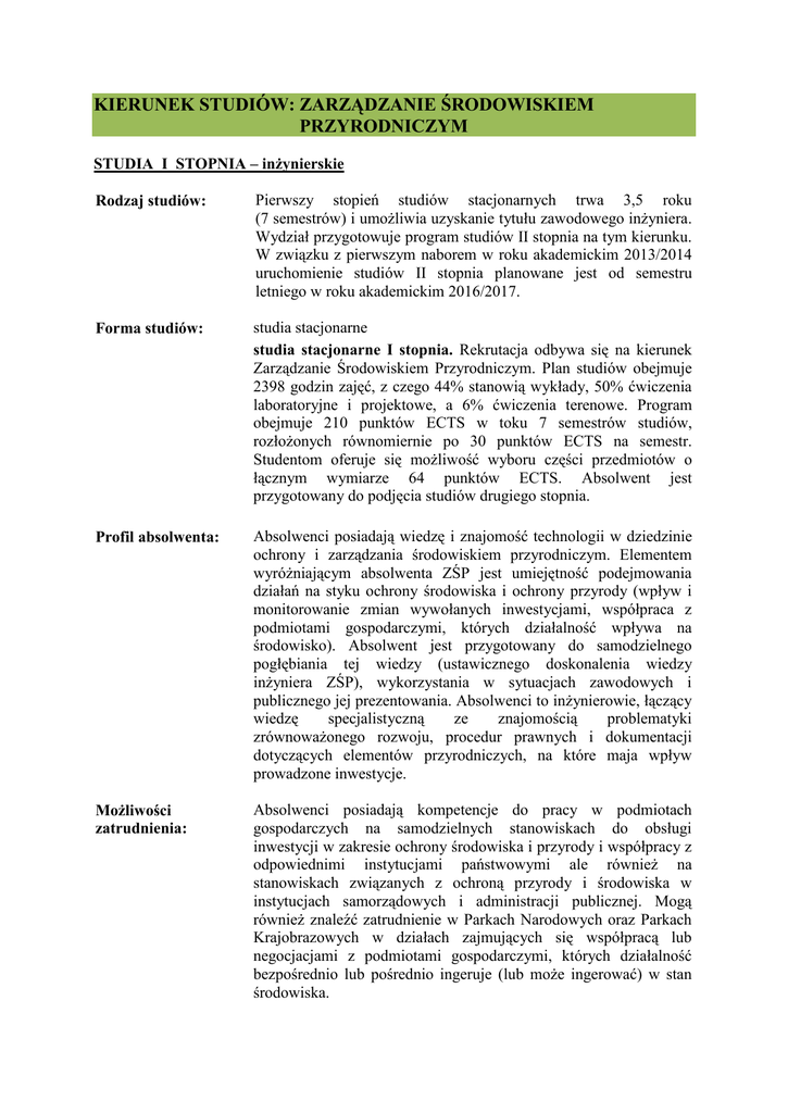KIERUNEK STUDIÓW: ZARZĄDZANIE ŚRODOWISKIEM PRZYRODNICZYM STUDIA I STOPNIA – inżynierskie Rodzaj studiów: Pierwszy stopień studiów stacjonarnych trwa 3,5 roku (7 semestrów) i umożliwia uzyskanie tytułu zawodowego inżyniera. Wydział przygotowuje program studiów II stopnia na tym kierunku. W związku z pierwszym naborem w roku akademickim 2013/2014 uruchomienie studiów II stopnia planowane jest od semestru letniego w roku akademickim 2016/2017. Forma studiów: studia stacjonarne studia stacjonarne I stopnia. Rekrutacja odbywa się na kierunek Zarządzanie Środowiskiem Przyrodniczym. Plan studiów obejmuje 2398 godzin zajęć, z czego 44% stanowią wykłady, 50% ćwiczenia laboratoryjne i projektowe, a 6% ćwiczenia terenowe. Program obejmuje 210 punktów ECTS w toku 7 semestrów studiów, rozłożonych równomiernie po 30 punktów ECTS na semestr. Studentom oferuje się możliwość wyboru części przedmiotów o łącznym wymiarze 64 punktów ECTS. Absolwent jest przygotowany do podjęcia studiów drugiego stopnia. Profil absolwenta: Absolwenci posiadają wiedzę i znajomość technologii w dziedzinie ochrony i zarządzania środowiskiem przyrodniczym. Elementem wyróżniającym absolwenta ZŚP jest umiejętność podejmowania działań na styku ochrony środowiska i ochrony przyrody (wpływ i monitorowanie zmian wywołanych inwestycjami, współpraca z podmiotami gospodarczymi, których działalność wpływa na środowisko). Absolwent jest przygotowany do samodzielnego pogłębiania tej wiedzy (ustawicznego doskonalenia wiedzy inżyniera ZŚP), wykorzystania w sytuacjach zawodowych i publicznego jej prezentowania. Absolwenci to inżynierowie, łączący wiedzę specjalistyczną ze znajomością problematyki zrównoważonego rozwoju, procedur prawnych i dokumentacji dotyczących elementów przyrodniczych, na które maja wpływ prowadzone inwestycje. Możliwości zatrudnienia: Absolwenci posiadają kompetencje do pracy w podmiotach gospodarczych na samodzielnych stanowiskach do obsługi inwestycji w zakresie ochrony środowiska i przyrody i współpracy z odpowiednimi instytucjami państwowymi ale również na stanowiskach związanych z ochroną przyrody i środowiska w instytucjach samorządowych i administracji publicznej. Mogą również znaleźć zatrudnienie w Parkach Narodowych oraz Parkach Krajobrazowych w działach zajmujących się współpracą lub negocjacjami z podmiotami gospodarczymi, których działalność bezpośrednio lub pośrednio ingeruje (lub może ingerować) w stan środowiska.