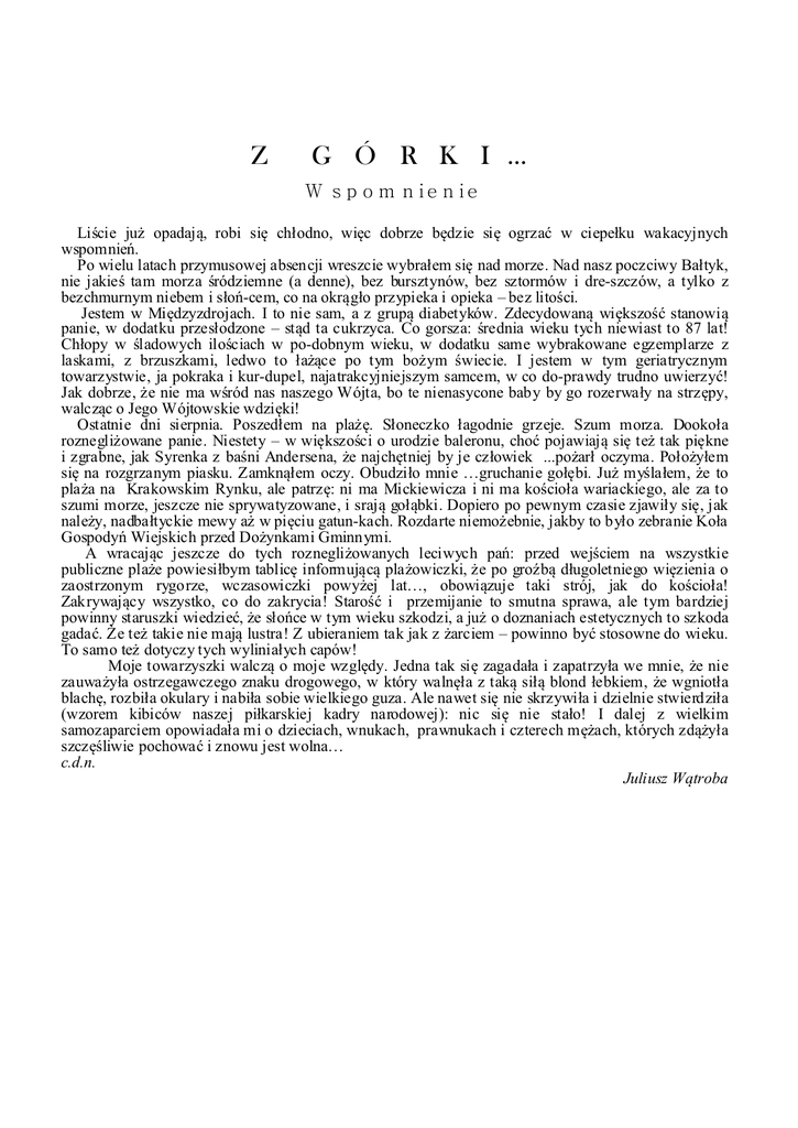 Z G Ó R K I … W s p o m n ie n ie Liście już opadają, robi się chłodno, więc dobrze będzie się ogrzać w ciepełku wakacyjnych wspomnień. Po wielu latach przymusowej absencji wreszcie wybrałem się nad morze. Nad nasz poczciwy Bałtyk, nie jakieś tam morza śródziemne (a denne), bez bursztynów, bez sztormów i dre-szczów, a tylko z bezchmurnym niebem i słoń-cem, co na okrągło przypieka i opieka – bez litości. Jestem w Międzyzdrojach. I to nie sam, a z grupą diabetyków. Zdecydowaną większość stanowią panie, w dodatku przesłodzone – stąd ta cukrzyca. Co gorsza: średnia wieku tych niewiast to 87 lat! Chłopy w śladowych ilościach w po-dobnym wieku, w dodatku same wybrakowane egzemplarze z laskami, z brzuszkami, ledwo to łażące po tym bożym świecie. I jestem w tym geriatrycznym towarzystwie, ja pokraka i kur-dupel, najatrakcyjniejszym samcem, w co do-prawdy trudno uwierzyć! Jak dobrze, że nie ma wśród nas naszego Wójta, bo te nienasycone baby by go rozerwały na strzępy, walcząc o Jego Wójtowskie wdzięki! Ostatnie dni sierpnia. Poszedłem na plażę. Słoneczko łagodnie grzeje. Szum morza. Dookoła roznegliżowane panie. Niestety – w większości o urodzie baleronu, choć pojawiają się też tak piękne i zgrabne, jak Syrenka z baśni Andersena, że najchętniej by je człowiek ...pożarł oczyma. Położyłem się na rozgrzanym piasku. Zamknąłem oczy. Obudziło mnie …gruchanie gołębi. Już myślałem, że to plaża na Krakowskim Rynku, ale patrzę: ni ma Mickiewicza i ni ma kościoła wariackiego, ale za to szumi morze, jeszcze nie sprywatyzowane, i srają gołąbki. Dopiero po pewnym czasie zjawiły się, jak należy, nadbałtyckie mewy aż w pięciu gatun-kach. Rozdarte niemożebnie, jakby to było zebranie Koła Gospodyń Wiejskich przed Dożynkami Gminnymi. A wracając jeszcze do tych roznegliżowanych leciwych pań: przed wejściem na wszystkie publiczne plaże powiesiłbym tablicę informującą plażowiczki, że po groźbą długoletniego więzienia o zaostrzonym rygorze, wczasowiczki powyżej lat…, obowiązuje taki strój, jak do kościoła! Zakrywający wszystko, co do zakrycia! Starość i przemijanie to smutna sprawa, ale tym bardziej powinny staruszki wiedzieć, że słońce w tym wieku szkodzi, a już o doznaniach estetycznych to szkoda gadać. Że też takie nie mają lustra! Z ubieraniem tak jak z żarciem – powinno być stosowne do wieku. To samo też dotyczy tych wyliniałych capów! Moje towarzyszki walczą o moje względy. Jedna tak się zagadała i zapatrzyła we mnie, że nie zauważyła ostrzegawczego znaku drogowego, w który walnęła z taką siłą blond łebkiem, że wgniotła blachę, rozbiła okulary i nabiła sobie wielkiego guza. Ale nawet się nie skrzywiła i dzielnie stwierdziła (wzorem kibiców naszej piłkarskiej kadry narodowej): nic się nie stało! I dalej z wielkim samozaparciem opowiadała mi o dzieciach, wnukach, prawnukach i czterech mężach, których zdążyła szczęśliwie pochować i znowu jest wolna… c.d.n. Juliusz Wątroba Pod Pałóm Asisz się jak żaba na czornym globinie, ty bździno, lebiodo, kora cie nie minie! Bo żeś krygle strzaskoł i szynkwas obalił, ty dioseczny diosku na rób se tak dalij, a sie nie wypytasz i do pierdla trefisz, tam ci bydzie isto ty howado lepij! Juliusz Wątroba Słowniczek gwarowy Pod Pałom – tradycyjna nawa rudzickiego „Baru pod Zamkiem”, asić sie – pysznić się globin – pasta do butów bździna – tu: pogardliwie o słabeuszu lebioda – słaby, chorowity człowiek krygle - kufle szynkwas – bufet, lada baru diosek – zły duch wypytać – wyprosić pierdel – więzienie isto – pewnie, prawdopodobnie howado – człowiek ordynarny
