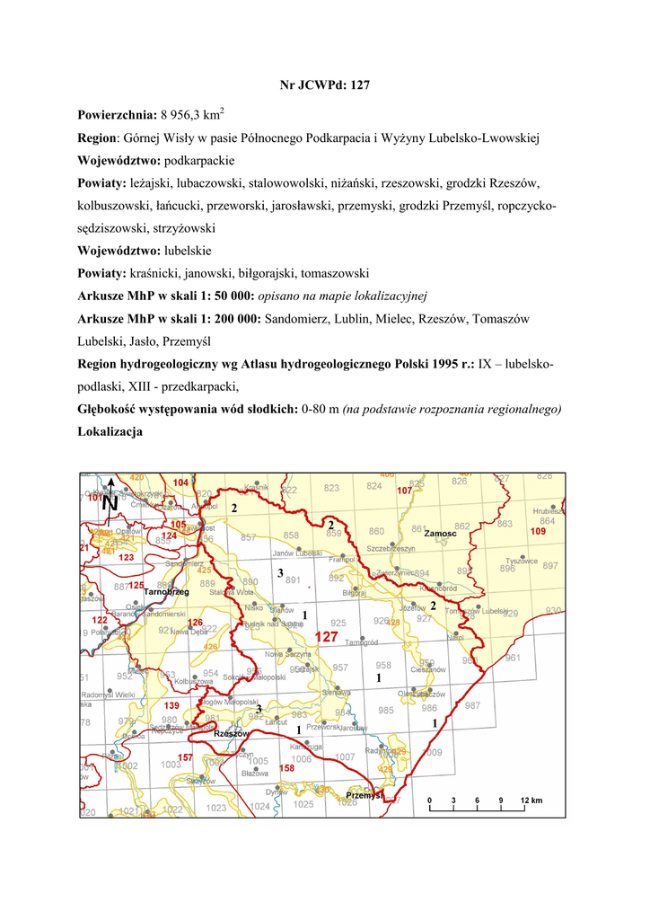 Nr JCWPd: 127 Powierzchnia: 8 956,3 km2 Region: Górnej Wisły w pasie Północnego Podkarpacia i WyŜyny Lubelsko-Lwowskiej Województwo: podkarpackie Powiaty: leŜajski, lubaczowski, stalowowolski, niŜański, rzeszowski, grodzki Rzeszów, kolbuszowski, łańcucki, przeworski, jarosławski, przemyski, grodzki Przemyśl, ropczyckosędziszowski, strzyŜowski Województwo: lubelskie Powiaty: kraśnicki, janowski, biłgorajski, tomaszowski Arkusze MhP w skali 1: 50 000: opisano na mapie lokalizacyjnej Arkusze MhP w skali 1: 200 000: Sandomierz, Lublin, Mielec, Rzeszów, Tomaszów Lubelski, Jasło, Przemyśl Region hydrogeologiczny wg Atlasu hydrogeologicznego Polski 1995 r.: IX – lubelskopodlaski, XIII - przedkarpacki, Głębokość występowania wód słodkich: 0-80 m (na podstawie rozpoznania regionalnego) Lokalizacja Profile m. n.p.m . 2 220 Q 1 3 Cr Q Q 170 Ng Ng 120 warstwy wodonośne utwory słabo przepuszczalne SYMBOL całej JCWPd uwzględniający wszystkie profile: Q, Cr Opis symbolu: W piętrze czwartorzędowym występuje jeden poziom wodonośny związany z utworami akumulacji rzecznej (piaski, Ŝwiry). Piętro wodonośne kredowe zbudowane jest z utworów węglanowych. Strefa aktywnej wymiany wód zwykłych występuje do głębokości około 100 - 120 m p.p.t.). Lokalnie moŜe występować łączność hydrauliczna piętra czwartorzędowego i kredowego. Q – wody porowe w utworach akumulacji rzecznej (piaski, Ŝwiry) Cr – wody szczelinowe w utworach węglanowych (wapienie, margle, opoki) Cecha szczególna JCWPd (ilościowa, chemiczna): Q - ilościowo – stan dobry, jakościowo – dobry, Cr - ilościowo – stan dobry, jakościowo – dobry. GZWP występujące w obrębie JCWPd: 460 (Cr), 407 (Cr), 425 (Q), 428 (Q), 429 (Q)