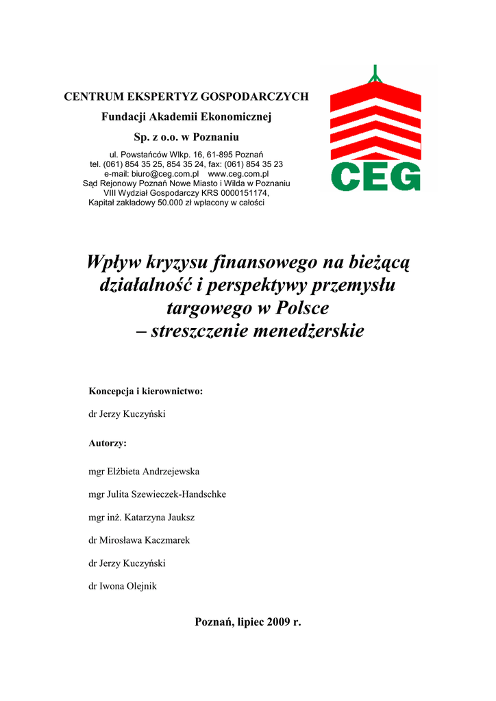 CENTRUM EKSPERTYZ GOSPODARCZYCH Fundacji Akademii Ekonomicznej Sp. z o.o. w Poznaniu ul. Powstańców Wlkp. 16, 61-895 Poznań tel. (061) 854 35 25, 854 35 24, fax: (061) 854 35 23 e-mail: [email protected] www.ceg.com.pl Sąd Rejonowy Poznań Nowe Miasto i Wilda w Poznaniu VIII Wydział Gospodarczy KRS 0000151174, Kapitał zakładowy 50.000 zł wpłacony w całości Wpływ kryzysu finansowego na bieŜącą działalność i perspektywy przemysłu targowego w Polsce – streszczenie menedŜerskie Koncepcja i kierownictwo: dr Jerzy Kuczyński Autorzy: mgr ElŜbieta Andrzejewska mgr Julita Szewieczek-Handschke mgr inŜ. Katarzyna Jauksz dr Mirosława Kaczmarek dr Jerzy Kuczyński dr Iwona Olejnik Poznań, lipiec 2009 r. Wpływ kryzysu finansowego na bieŜącą działalność i perspektywy przemysłu targowego w Polsce – streszczenie menedŜerskie SPIS TREŚCI SPIS TREŚCI ............................................................................................................................. 2 1. WSTĘP................................................................................................................................... 3 2. METODOLOGIA BADAŃ ................................................................................................... 5 3. DIAGNOZA NASTĘPSTW KRYZYSU FINANSOWEGO DLA PRZEDSIĘBIORSTW TARGOWYCH I PRZEDSIĘBIORSTW USŁUG TARGOWYCH....................................... 10 4. ANALIZA REAKCJI WYSTAWCÓW NA KRYZYS FINANSOWY.............................. 12 5. ANALIZA REAKCJI ZWIEDZAJĄCYCH NA KRYZYS FINANSOWY ....................... 16 6. PROGNOZA NASTĘPSTW KRYZYSU FINANSOWEGO DLA PRZEDSIĘBIORSTW TARGOWYCH NA LATA 2009-2010 ................................................................................... 18 7. PROGNOZA NASTĘPSTW KRYZYSU FINANSOWEGO DLA PRZEDSIĘBIORSTW USŁUG TARGOWYCH NA LATA 2009-2010..................................................................... 19 8 ANALIZA REAKCJI NA KRYZYS FINANSOWY HOTELARSTWA JAKO REPREZENTANTA SEKTORA DALSZEGO OTOCZENIA TARGÓW ............................ 21 9. PROGNOZA NASTĘPSTW KRYZYSU FINANSOWEGO DLA PRZEDSIĘBIORSTW NA LATA 2009-2010 W ŚWIETLE OPINII SAMORZĄDU GOSPODARCZEGO ............ 24 10. ZAKOŃCZENIE................................................................................................................ 25 CENTRUM EKSPERTYZ GOSPODARCZYCH Fundacji Akademii Ekonomicznej Sp. z o. o. w Poznaniu 2 Wpływ kryzysu finansowego na bieŜącą działalność i perspektywy przemysłu targowego w Polsce – streszczenie menedŜerskie 1. WSTĘP Targi – ewolucja, współczesność – kryzys finansowy Targi posiadają bogatą i wieloletnią tradycję zarówno w Europie, jak i na całym świecie. Od wieków były waŜną instytucją handlu, która wywarła ogromny wpływ na rozwój cywilizacji nie tylko w sferze gospodarczej, ale takŜe społecznej oraz kulturowej. Targi przeszły długą drogę ewolucji w zakresie pełnionych funkcji oraz ich wpływu na funkcjonowanie przedsiębiorstw. Targi jako narzędzie marketingowe, stwarzają szansę osiągnięcia wielu celów naraz, a jednocześnie pomagają w tworzeniu i pielęgnowaniu kontaktów osobistych, będących niezwykle istotnym czynnikiem sukcesu. Są one nie tylko najlepszym sposobem dotarcia do wielu klientów w jednym miejscu i czasie, ale równieŜ koncentrują uwagę otoczenia klientów, kooperantów i mediów – na firmach i ich produktach. Targi XXI wieku są waŜnym narzędziem komunikacji marketingowej (face-to-face) wielu podmiotów. We współczesnej, globalnie powiązanej i wspomaganej rozwojem cyfryzacji gospodarce, w warunkach rosnącej konkurencyjności firm i powszechnej absorpcji innowacji, rośnie znaczenie bezpośrednich kontaktów wystawców i zwiedzających podczas tysięcy imprez wystawienniczych. Ogólnoświatowy kryzys ekonomiczny rynku finansowego i bankowego rozpoczął się od zapaści rynku poŜyczek hipotecznych wysokiego ryzyka w Stanach Zjednoczonych. W połowie 2007 roku obligacje subprime okazały się papierami bez pokrycia. W lipcu 2007 zbankrutowały dwa fundusze inwestycyjne banku Bear Stearns. Przełomowym momentem okazał się jednak 15 września 2008 roku, kiedy to miało miejsce największe bankructwo w historii USA. Tego dnia drugi co do wielkości bank inwestycyjny Lehman Brothers, po bezowocnej próbie zwrócenia się o pomoc do banku centralnego USA FED, zmuszony został ogłosić upadłość. 25 września 2008 roku, wskutek pogłębiającego się kryzysu, zbankrutował największy bank oszczędnościowy USA, a takŜe największy bank hipoteczny - Washington Mutual w Seattle w USA. W następstwie bankructwa Lehman Brothers oraz zagroŜenia upadłością kolejnych amerykańskich i europejskich banków, doszło w kolejnych tygodniach do utraty zaufania na rynku międzybankowym. Z powodu obaw o niewypłacalność banki przestały sobie poŜyczać CENTRUM EKSPERTYZ GOSPODARCZYCH Fundacji Akademii Ekonomicznej Sp. z o. o. w Poznaniu 3 Wpływ kryzysu finansowego na bieŜącą działalność i perspektywy przemysłu targowego w Polsce – streszczenie menedŜerskie pieniądze. W krótkim czasie kryzys dotarł teŜ do Europy. Upadły cztery islandzkie banki. 25 października 2008 miał miejsce największy spadek na polskiej giełdzie od ponad 14 lat, kiedy to aktywa straciły w sumie na wartości 43,3 mld złotych, a indeks największych spółek WIG 20 spadł o 8,1%. Jedną z podstawowych konsekwencji kryzysu finansowego w Polsce jest spowolnienie wzrostu gospodarczego. Według Głównego Urzędu Statystycznego nasza gospodarka wzrosła w pierwszych trzech miesiącach roku 2009 o 0,9 %, a licząc kwartał do kwartału – o 0,4%. Inwestycje firm spadły o 0,9% w porównaniu z ostatnim kwartałem 2008 roku, zmniejszył się teŜ eksport, a jeszcze bardziej spadł import. W konsekwencji przedsiębiorstwa ograniczyły produkcję o 1,4% w porównaniu z ostatnimi trzema miesiącami minionego roku.1 Cel i chara