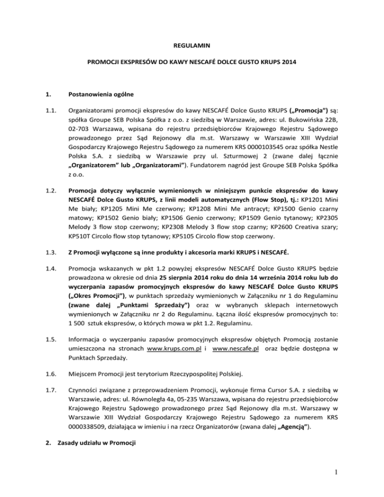 REGULAMIN PROMOCJI EKSPRESÓW DO KAWY NESCAFÉ DOLCE GUSTO KRUPS 2014 1. Postanowienia ogólne 1.1. Organizatorami promocji ekspresów do kawy NESCAFÉ Dolce Gusto KRUPS („Promocja”) są: spółka Groupe SEB Polska Spółka z o.o. z siedzibą w Warszawie, adres: ul. Bukowińska 22B, 02-703 Warszawa, wpisana do rejestru przedsiębiorców Krajowego Rejestru Sądowego prowadzonego przez Sąd Rejonowy dla m.st. Warszawy w Warszawie XIII Wydział Gospodarczy Krajowego Rejestru Sądowego za numerem KRS 0000103545 oraz spółka Nestle Polska S.A. z siedzibą w Warszawie przy ul. Szturmowej 2 (zwane dalej łącznie „Organizatorem” lub „Organizatorami”). Fundatorem nagród jest Groupe SEB Polska Spółka z o.o. 1.2. Promocja dotyczy wyłącznie wymienionych w niniejszym punkcie ekspresów do kawy NESCAFÉ Dolce Gusto KRUPS, z linii modeli automatycznych (Flow Stop), tj.: KP1201 Mini Me biały; KP1205 Mini Me czerwony; KP1208 Mini Me antracyt; KP1500 Genio czarny matowy; KP1502 Genio biały; KP1506 Genio czerwony; KP1509 Genio tytanowy; KP2305 Melody 3 flow stop czerwony; KP2308 Melody 3 flow stop czarny; KP2600 Creativa szary; KP510T Circolo flow stop tytanowy; KP5105 Circolo flow stop czerwony. 1.3. Z Promocji wyłączone są inne produkty i akcesoria marki KRUPS i NESCAFÉ. 1.4. Promocja wskazanych w pkt 1.2 powyżej ekspresów NESCAFÉ Dolce Gusto KRUPS będzie prowadzona w okresie od dnia 25 sierpnia 2014 roku do dnia 14 września 2014 roku lub do wyczerpania zapasów promocyjnych ekspresów do kawy NESCAFÉ Dolce Gusto KRUPS („Okres Promocji”), w punktach sprzedaży wymienionych w Załączniku nr 1 do Regulaminu (zwane dalej „Punktami Sprzedaży”) oraz w wybranych sklepach internetowych wymienionych w Załączniku nr 2 do Regulaminu. Łączna ilość ekspresów promocyjnych to: 1 500 sztuk ekspresów, o których mowa w pkt 1.2. Regulaminu. 1.5. Informacja o wyczerpaniu zapasów promocyjnych ekspresów objętych Promocją zostanie umieszczona na stronach www.krups.com.pl i www.nescafe.pl oraz będzie dostępna w Punktach Sprzedaży. 1.6. Miejscem Promocji jest terytorium Rzeczypospolitej Polskiej. 1.7. Czynności związane z przeprowadzeniem Promocji, wykonuje firma Cursor S.A. z siedzibą w Warszawie, adres: ul. Równoległa 4a, 05-235 Warszawa, wpisana do rejestru przedsiębiorców Krajowego Rejestru Sądowego prowadzonego przez Sąd Rejonowy dla m.st. Warszawy w Warszawie XIII Wydział Gospodarczy Krajowego Rejestru Sądowego za numerem KRS 0000338509, działająca w imieniu i na rzecz Organizatorów (zwana dalej „Agencją”). 2. Zasady udziału w Promocji 1 2.1. Uczestnikami Promocji mogą być wyłącznie pełnoletnie osoby fizyczne, zamieszkałe na terytorium Rzeczypospolitej Polskiej, posiadające pełną zdolność do czynności prawnych oraz dokonujące zakupu produktu objętego Promocją jako osoba fizyczna, a nie jako przedsiębiorca w rozumieniu art. 4 Ustawy o swobodzie działalności gospodarczej („Uczestnik”). 2.2. Uczestnictwo w Promocji jest dobrowolne. 2.3. Każdy Uczestnik może wziąć udział w Promocji wielokrotnie, spełniając wszystkie warunki konieczne uczestnictwa w Promocji. 2.4. Uczestnictwo w Promocji nie wyłącza możliwości brania udziału w innych promocjach organizowanych przez Organizatora w Okresie Promocji dotyczących ekspresów do kawy NESCAFÉ Dolce Gusto KRUPS. 2.5. Warunkiem koniecznym udziału w Promocji jest zakup przez Uczestnika w sprzedaży detalicznej, tj. w sklepach wskazanych w Załączniku nr 1 lub Załączniku nr 2 do Regulaminu, w Okresie Promocji jednego z następujących ekspresów do kawy NESCAFÉ Dolce Gusto KRUPS, z linii modeli automatycznych, tj.: KP1201 Mini Me biały; KP1205 Mini Me czerwony; KP1208 Mini Me antracyt; KP1500 Genio czarny matowy; KP1502 Genio biały; KP1506 Genio czerwony; KP1509 Genio tytanowy; KP2305 Melody 3 flow stop czerwony; KP2308 Melody 3 flow stop czarny; KP2600 Creativa szary; KP510T Circolo flow stop tytanowy; KP5105 Circolo flow stop czerwony. 2.6. Uczestnik Promocji, który w Okresie Promocji kupi ekspres NESCAFÉ Dolce Gusto KRUPS objęty Promocją zgodnie z pkt. 2.5. powyżej, może uzyskać rabat przy kasie w wysokości 150 zł brutto w momencie zakupu ekspresu. 2.7. Organizator Promocji zastrzega, że kwota 150 zł brutto nie podlega zamianie na inne nagrody rzeczowe lub pieniężne. 3. Postępowanie reklamacyjne 3.1. Reklamacje dotyczące przebiegu Promocji mogą być zgłaszane wyłącznie na piśmie na adres agencji reklamowej Cursor S.A. z siedzibą w Warszawie, adres: Cursor S.A. Skrytka pocztowa 160, 02-303 Warszawa 79, z dopiskiem na kopercie NESCAFÉ Dolce Gusto KRUPS. Koszty wysłania listu pokrywa Uczestnik. 3.2. Prawo złożenia reklamacji przysługuje jedynie Uczestnikowi Promocji przez cały Okres Promocji oraz przez 21 dni kalendarzowych po zakończeniu Okresu Promocji. O zachowaniu terminu składania reklamacji decyduje data stempla pocztowego. 3.3. Pisemna reklamacja powinna zawierać imię, nazwisko, dokładny adres Uczestnika Promocji jak również opis i wskazanie przyczyny reklamacji. 2 3.4. Reklamacje rozpatrywane będą przez Komisję powołaną przez Organizatorów Promocji w terminie 14 dni kalendarzowych od dnia otrzymania reklamacji. Uczestnik zostanie powiadomiony o decyzji Komisji w sprawie jego reklamacji listem poleconym na adres podany w reklamacji. 3.5. Po wyczerpaniu postępowania reklamacyjnego Uczestnikowi przysługuje prawo do dochodzenia nieuwzględnionych roszczeń na drodze postępowania sądowego. 4. Przetwarzanie danych osobowych 4.1. Uczestnik Promocji, w celu złożenia reklamacji dotyczącej przebiegu Promocji, o czym mowa w pkt 3 Regulaminu, udostępnia Organizatorom swoje dane osobowe, tj.: imię, nazwisko, adres zamieszkania, w celu realizacji obowiązków wynikających z przeprowadzenia postępowania reklamacyjnego. Dane osobowe będą wykorzystane przez Organizatorów wyłącznie w celu przeprowadzenia postępowania reklama