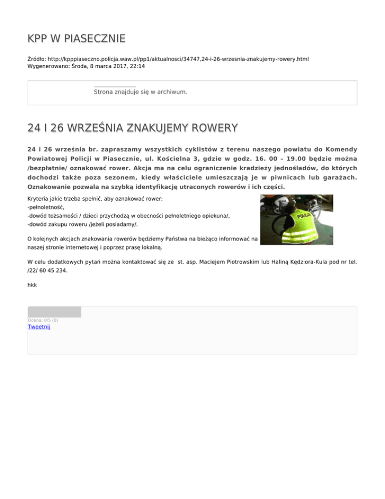 KPP W PIASECZNIE 24 I 26 WRZEŚNIA ZNAKUJEMY ROWERY