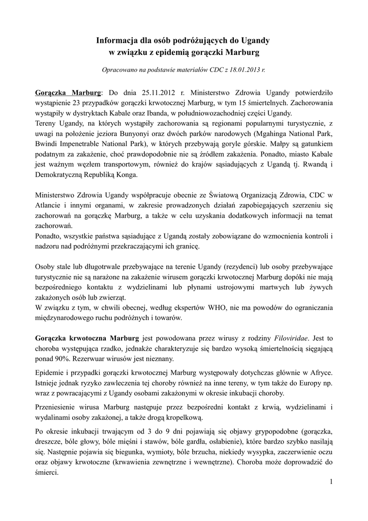 Informacja dla osób podróżujących do Ugandy w związku z epidemią gorączki Marburg Opracowano na podstawie materiałów CDC z 18.01.2013 r. Gorączka Marburg: Do dnia 25.11.2012 r. Ministerstwo Zdrowia Ugandy potwierdziło wystąpienie 23 przypadków gorączki krwotocznej Marburg, w tym 15 śmiertelnych. Zachorowania wystąpiły w dystryktach Kabale oraz Ibanda, w południowozachodniej części Ugandy. Tereny Ugandy, na których wystąpiły zachorowania są regionami popularnymi turystycznie, z uwagi na położenie jeziora Bunyonyi oraz dwóch parków narodowych (Mgahinga National Park, Bwindi Impenetrable National Park), w których przebywają goryle górskie. Małpy są gatunkiem podatnym za zakażenie, choć prawdopodobnie nie są źródłem zakażenia. Ponadto, miasto Kabale jest ważnym węzłem transportowym, również do krajów sąsiadujących z Ugandą tj. Rwandą i Demokratyczną Republiką Konga. Ministerstwo Zdrowia Ugandy współpracuje obecnie ze Światową Organizacją Zdrowia, CDC w Atlancie i innymi organami, w zakresie prowadzonych działań zapobiegających szerzeniu się zachorowań na gorączkę Marburg, a także w celu uzyskania dodatkowych informacji na temat zachorowań. Ponadto, wszystkie państwa sąsiadujące z Ugandą zostały zobowiązane do wzmocnienia kontroli i nadzoru nad podróżnymi przekraczającymi ich granicę. Osoby stale lub długotrwale przebywające na terenie Ugandy (rezydenci) lub osoby przebywające turystycznie nie są narażone na zakażenie wirusem gorączki krwotocznej Marburg dopóki nie mają bezpośredniego kontaktu z wydzielinami lub płynami ustrojowymi martwych lub żywych zakażonych osób lub zwierząt. W związku z tym, w chwili obecnej, według ekspertów WHO, nie ma powodów do ograniczania międzynarodowego ruchu podróżnych i towarów. Gorączka krwotoczna Marburg jest powodowana przez wirusy z rodziny Filoviridae. Jest to choroba występująca rzadko, jednakże charakteryzuje się bardzo wysoką śmiertelnością sięgającą ponad 90%. Rezerwuar wirusów jest nieznany. Epidemie i przypadki gorączki krwotocznej Marburg występowały dotychczas głównie w Afryce. Istnieje jednak ryzyko zawleczenia tej choroby również na inne tereny, w tym także do Europy np. wraz z powracającymi z Ugandy osobami zakażonymi w okresie inkubacji choroby. Przeniesienie wirusa Marburg następuje przez bezpośredni kontakt z krwią, wydzielinami i wydalinami osoby zakażonej, a także drogą kropelkową. Po okresie inkubacji trwającym od 3 do 9 dni pojawiają się objawy grypopodobne (gorączka, dreszcze, bóle głowy, bóle mięśni i stawów, bóle gardła, osłabienie), które bardzo szybko nasilają się. Następnie pojawia się biegunka, wymioty, bóle brzucha, niekiedy wysypka, zaczerwienie oczu oraz objawy krwotoczne (krwawienia zewnętrzne i wewnętrzne). Choroba może doprowadzić do śmierci. 1 Inne informacje na temat gorączki krwotocznej Marburg znajduje się na oficjalnych stronach: • Światowej Organizacji Zdrowia (WHO) http://www.who.int/en/ • Europejskiego Centrum ds. Zapobiegania i Kontroli http://www.ecdc.europa.eu/en/Pages/home.aspx • Centrum ds. Zapobiegania i Kontroli Chorób w Atlancie http://www.cdc.gov/ Chorób Nie ma specyficznego leczenia, ani szczepionki przeciwko gorączce krwotocznej Marburg. Brak skutecznego leczenia i duża zakaźność wirusów wymusza stosowanie odpowiednich zabezpieczeń przez osoby kontaktujące się lub opiekujące się osobą zakażoną lub chorą (np. szczególne warunki izolacji, środków ochrony osobistej). W razie zachorowania w trakcie pobytu należy natychmiast poprosić o pomoc lekarską, zaś w przypadku wystąpienia choroby gorączkowej po powrocie z ww. rejonu należy niezwłocznie zgłosić się do lekarza informując o przebytej podróży. W celu uzyskania informacji o innych chorobach zakaźnych należy przed wyjazdem do tego kraju skontaktować się z lekarzem medycyny podróży lub lekarzem medycyny chorób tropikalnych, najlepiej nie później niż 4 - 6 tyg. przed planowaną podróżą. Pozwoli to na przyjęcie zalecanej przez lekarza profilaktyki. Więcej informacji dotyczących bezpieczeństwa w ww. krajach znajduje się na stronie Ministerstwa Spraw Zagranicznych w zakładce „Polak za granicą”. 2