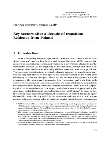 Managerial Economics 2015, vol. 16, no. 1, pp. 39–76 http://dx.doi.org/10.7494/manage.2015.16.1.39 Henryk Gurgul*, Łukasz Lach* Key sectors after a decade of transition: Evidence from Poland 1. Introduction More than twenty five years ago, Poland, which is often called a model transition economy1, was the first Central and Eastern European (CEE) country that replaced an authoritarian communist regime by a government elected in partlydemocratic election. At the beginning of the transition, Poland and other CEE economies were confronted with many difficult economic and social problems. The process of transition from a centrally-planned economy to a market economy was the very first process of this type in the economic history of the world (and the history of economic thought). There was no theoretical background for such a transition. The state-owned companies lost cooperation and trade links with other former communist Comecon countries and were exhibited to competition by companies from highly-developed Western economies. Thus, it is not surprising that the industrial output, real wages, and salaries were dropping, and at the same time, both inflation and unemployment were rapidly rising2. In order to face these rising socio-economic problems, the authorities in Poland decided to apply the so-called shock therapy, which in this context is understood as a rapid adjustment of existing economic rules according to market principles and requirements * AGH University of Science and Technology, Faculty of Management, Department of Applications of Mathematics in Economics, e-mails: [email protected] (Henryk Gurgul), llach@zarz. agh.edu.pl (Łukasz Lach). We would like to thank anonymous referees for their helpful suggestions on earlier versions of this paper. 1 This opinion is often expressed by both researchers (e.g., Lenain, 2000) and politicians (recall US President Barack Obama hailing Poland as a model of transition during his visits to Warsaw in 2011 and 2014 – for details see: http://www.huffingtonpost.com/2011/05/28/obama-poland-democracy_n_868434.html and http://www.whitehouse.gov/the-press-office/2014/06/04/remarks-presidentobama-25th-anniversary-freedom-day-warsaw-poland). 2 At the early stage of the transition, one could even notice a hyperinflation in Poland as the annual inflation rate reached a level of a few hundred percentage points. 39 Henryk Henryk Gurgul*, Gurgul,Łukasz ŁukaszLach* Lach (i.e., liberalization). In general, this procedure, also known as the Balcerowicz’s plan3, was aimed at keeping the inflation under control. The first positive effects of the undertaken measures could be observed in trade, and also later in services. However, in the sectors of manufacturing, mining, metallurgy, foundry, and other branches of heavy industry, the economic transformation was generally less successful. Heavy industries were essentially reduced and lost their significance. In other words, the transition process resulted in significant restructuring of the economy under study. One can take for granted that, because of the forthcoming transition process, the importance and size of all sectors change radically. This means that the ranking of importance of the sectors thoroughly changes as well. The main aim of this contribution is a derivation of the ranking of importance of industries of the Polish economy based on available IO data from the second decade of transition. Since the IO tables used cover a period from 2000 to 2005, the empirical analysis may also help us assess the impact of Poland’s 2004 EU accession on the changes in ranking of importance of the sectors. The research is conducted in the framework of the so-called key sector analysis, which is based on the entropy theory. A crucial work on entropy decomposition analysis that provides a useful way of examining errors or changes in input-output structures was published by Henri Theil in the mid 60s4. This approach allows us to decompose changes in the output into a set of additive components. Key sector analysis provides empirical evidence regarding the economic structure of sectors within an economy5. In general, the main goal of this type of analysis is to identify the sectors that have the greatest effects on the rest of the economy. In addition, the most important coefficients of input-output matrix may also be identified. The key sector analysis often refers to the so-called multiplier product matrix (MPM)6. By means of such a matrix, the probable future course of the economic structure of a country under study can be identified. The dynamics of the entries in the input-output matrix reflect the interaction of the different firm strategies towards innovation, for example. As one can see, the knowledge of key sectors is important for many reasons. Besides general policy implications, such knowledge is useful in updating and forecasting procedures of input matrices where 3 4 5 6 40 Professor Leszek Balcerowicz is a former Deputy Prime Minister and Minister of Finance and former President of the National Bank of Poland (NBP). He is one of the main architects of Poland's economic reforms initiated in 1989. See Theil (1967). See e.g. Chenery and Watanabe (1958), Hewings and Romanos (1981), Hewings (1982), Defourny and Thorbecke (1984), Białas and Gurgul (1998). The interpretation of the elements of this matrix is strongly related to the so-called maximum entropy criterion, which gives us the opportunity to analyze various aspects of sectorial interdependences in a static Input-Output model. We will provide more details on maximum entropy decomposition in Section 3. Key sectors after a decade of transition: Evidence from Poland early identification of key sectors is crucial for the choice of an adequate method and more-precise approximation. When focusing on the transition process, one has also take into account that this process has affected the basic principles of collecting social statistics by the central s