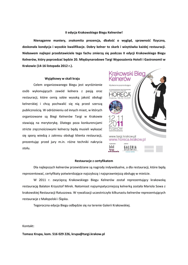 II edycja Krakowskiego Biegu Kelnerów! Nienaganne maniery, znakomita prezencja, dbałośd o wygląd, sprawnośd fizyczna, doskonała kondycja i wysokie kwalifikacje. Dobry kelner to skarb i wizytówka każdej restauracji. Niebawem najlepsi przedstawiciele tego fachu zmierzą się podczas II edycji Krakowskiego Biegu Kelnerów, który poprzedzad będzie 20. Międzynarodowe Targi Wyposażenia Hoteli i Gastronomii w Krakowie (14-16 listopada 2012 r.). Wyjątkowy w skali kraju Celem organizowanego Biegu jest wyróżnienie osób wykonujących zawód kelnera z pasją oraz restauracji, które cenią sobie wysoką jakośd obsługi kelnerskiej i chcą pochwalid się nią przed szerszą publicznością. W odróżnieniu od innych miast, w których organizowane są Biegi Kelnerów Targi w Krakowie stawiają na merytorykę. Dlatego poza konkurencjami stricte zręcznościowymi kelnerzy będą musieli wykazad się sporą wiedzą z zakresu obsługi klienta restauracji, prezentując przed jury m.in. różne techniki nakrycia stołu. Restauracje z certyfikatem Dla najlepszych kelnerów przewidziane są nagrody indywidualne, a dla restauracji, które będą reprezentowad, certyfikaty potwierdzające najszybszą i najsprawniejszą obsługę w mieście. W 2011 r. zwycięzcą Krakowskiego Biegu Kelnerów został reprezentujący krakowską restaurację Balaton Krzysztof Mirek. Natomiast najsympatyczniejszą kelnerką została Mariola Sowa z krakowskiej Restauracji Ratuszowa. W rywalizacji uczestniczyło kilkunastu kelnerów reprezentujących restauracje z Małopolski i Śląska. Tegoroczna edycja Biegu odbędzie się na terenie Galerii Krakowskiej. Kontakt: Tomasz Krupa, kom. 516 029 226, [email protected]