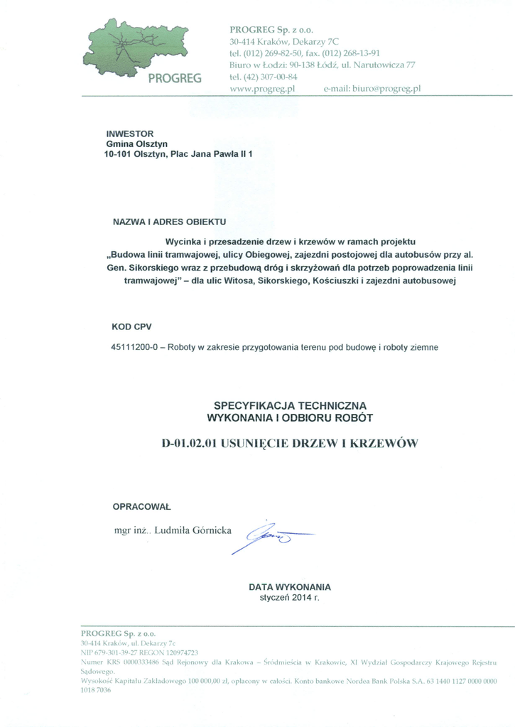 D 01.02.01 USUNIĘCIE DRZEW I KRZEWÓW CPV 45111200-0 Roboty w zakresie przygotowania terenu pod budowę i roboty ziemne 1. WSTĘP 1.1.Przedmiot SST Przedmiotem niniejszej szczegółowej specyfikacji technicznej (SST) są wymagania dotyczące wykonania i odbioru robót związanych z wycinką i przesadzeniem drzew i krzewów w ramach projektu „Budowa linii tramwajowej, ulicy Obiegowej, zajezdni postojowej dla autobusów przy al. Gen. Sikorskiego wraz z przebudową dróg i skrzyżowań dla potrzeb poprowadzenia linii tramwajowej” – dla ulic Witosa, Sikorskiego, Kościuszki i zajezdni autobusowej 1.2. Zakres stosowania SST Szczegółowa specyfikacja techniczna (SST) stanowi obowiązujący dokument przetargowy i kontraktowy przy zlecaniu i realizacji robót wymienionych w pkt. 1.1. 1.3. Zakres robót objętych SST Ustalenia zawarte w niniejszej specyfikacji dotyczą zasad prowadzenia robót przygotowawczych związanych z : • przesadzeniem drzew • przesadzeniem krzewów • ścinaniem drzew • ścinaniem krzewów Lokalizację drzew i krzewów przewidzianych do usunięcia pokazano w Dokumentacji Technicznej 1.4. Określenia podstawowe Stosowane określenia podstawowe są zgodne z obowiązującymi, odpowiednimi polskimi normami oraz z definicjami podanymi w SST „Wymagania ogólne". 1.4.1. Ziemia urodzajna - ziemia posiadająca właściwości zapewniające roślinom prawidłowy rozwój. 1.4.2. Kompost z kory – rozdrobniona kora lub zrębki przekompostowane z nawozami lub osadami z oczyszczalni 1.5. Ogólne wymagania dotyczące robót Ogólne wymagania dotyczące robót podano w SST „Wymagania ogólne. 2. MATERIAŁY 2.1. Ogólne wymagania dotyczące materiałów Ogólne wymagania dotyczące materiałów podano w SST „Wymagania ogólne". 2.2. Przesadzanie drzew i krzewów : Do przesadzania drzew i krzewów należy stosować następujące materiały : • torf, tkania jutowa, • drut stalowy, ocynkowany, miękki • preparaty ułatwiające ukorzenianie • ziemia urodzajna • kompost z kory 2.3.Usuwanie drzew i krzewów : Nie występują 3. SPRZĘT 3.1. Ogólne wymagania dotyczące sprzętu Ogólne wymagania dotyczące sprzętu podano w SST „Wymagania ogólne". 3.2. Sprzęt do przesadzania drzew i krzewów Do wykonywania robót związanych z przesadzaniem drzew należy stosować: • przesadzarkę mechaniczną samojezdną o średnicy kosza odpowiedniej do wielkości drzewa • koparko – spycharkę lub żuraw samojezdny • środek transportowy 3.3. Sprzęt do usuwania drzew i krzewów Do wykonywania robót związanych z usunięciem drzew i krzewów należy stosować: • piły mechaniczne, • podnośnik hydrauliczny 4. TRANSPORT 4.1. Ogólne wymagania dotyczące transportu Ogólne wymagania dotyczące transportu podano w SST„Wymagania ogólne". 4.2. Transport drewna użytkowego Drewno użytkowe ( opałowe) może być przewożone dowolnym środkiem transportu zgodnym z przepisami BHP. W czasie trwania transportu Wykonawca powinien zabezpieczyć ładunki przed możliwością przesuwania się. Drewno jest własnością Właściciela Terenu. 2 5. WYKONANIE ROBÓT 5.1. Ogólne zasady wykonania robót Ogólne zasady wykonania robót podano w SST„Wymagania ogólne". 5.2. Przesadzanie drzew UWAGA : Podane w tabelach odległości drzew od uzbrojenia terenu są pomiarami z mapy. Rzeczywiste odległości mogą się różnić od podanych. W zasięgu korzeni mogą się znajdować sieci nie naniesione na mapie. Wykopywanie drzew do przesadzenia sprzętem mechanicznym musi być poprzedzone przekopem kontrolnym. Przy pracy ręcznej zachować należytą ostrożność. 5.2.1. Warunki przesadzania drzew starszych : Wykopanie, przewóz na miejsce sadzenia oraz posadzenie przesadzarką mechaniczną na podwoziu samochodowym. 5.2.2. Warunki przesadzania drzew młodszych : Drzewa można przesadzić ręcznie, za pomocą żurawia samochodowego lub koparko-spycharki o udźwigu do 4 t. 5.2.3. Warunki przesadzania krzewów Krzewy należy wykopywać i sadzić ręcznie. 5.2.4. Wykonanie prac • doły do posadzenia drzew starszych należy zaprawić preparatem ułatwiającym ukorzenianie • doły dla drzew młodszych i krzewów należy zaprawić ziemią urodzajną z dodatkiem preparatu ułatwiającego ukorzenianie • korony drzew i krzewów liściastych należy odpowiednio przyciąć • pnie drzew liściastych zabezpieczyć warstwą torfu i tkaniną jutową • drzewa starsze po posadzeniu ustabilizować co najmniej trzema sztywnymi odciągami • drzewa młodsze należy zabezpieczyć trzema palikami związanymi w dolnej i górnej części konstrukcji • misy pod drzewami należy ściółkować kompostem z kory warstwą grubości średnio 5 cm. Warstwa kory powinna być grubsza w zewnętrznej części misy i coraz cieńsza w kierunku pnia drzewa. Ściółka nie może bezpośrednio dotykać do pnia. Do ściółkowania powierzchni nie wolno używać świeżej kory • teren pod krzewami należy ściółkować kompostem z kory warstwą grubości 5 cm • po posadzeniu drzewa i krzewy należy obficie podlać 5.2.5. Pielęgnacja drzew i krzewów przesadzonych przez trzy lata Pielęgnacja polega na następujących zabiegach: • uzupełnieniu strat wody przez staranne podlewanie, nie dopuszczając jednak do nadmiernego nawilgocenia, zwłaszcza na glebach ciężkich (grunty spoiste). • ograniczeniu strat wody przez duże drzewa w czasie nagrzewania się pnia i konarów oraz działania wiatrów, poprzez stosowanie owijania pni i konarów torfem i tkaniną jutową • zabezpieczenia pnia i konarów należy każdego roku na wiosnę wymieniać, a zdjęte palić, ponieważ są siedliskiem patogenów • uzupełnianiu warstwy ściółki wokół świeżo przesadzonego drzewa/krzewu, • usuwaniu chwastów 5.3. Zasady usuwania drzew i krzewów Decyzję na usunięcie drzew i krzewów objętych ochroną prawną uzyska Zamawiający. Roboty związane z usunięciem drzew i krzewów obejmują ścięcie drzew i krze