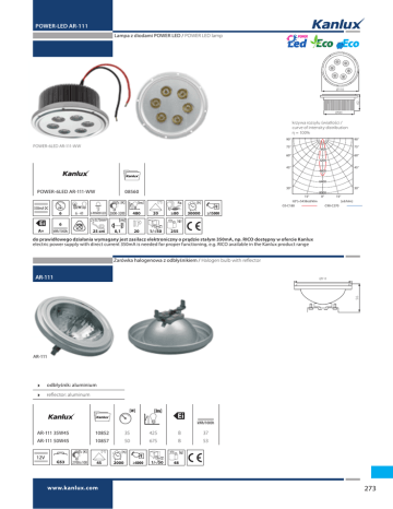 POWER-LED AR-111 Lampa z diodami POWER LED / POWER LED lamp 62 Ø110 Ø90 krzywa rozsyłu światłości / curve of intensity distribution η=100% ηBZ1= 100% 90° POWER-6LED AR-111-WW 75° 90° 1600 60° 75° 60° 3200 45° 4800 45° 6400 POWER-6LED AR-111-WW 350mA DC 30° 08560 15° I(0°)=5438cd/klm C0-C180 6 6 - 41 6 POWER LED 2800-3200 480 20 ≥80 20 1/-/50 255 30000 30° 8000 0° 15° [cd/klm] C90-C270 ≥15000 2 x 0,75mm2 6 A+ 25 cm 0,1 do prawidłowego działania wymagany jest zasilacz elektroniczny o prądzie stałym 350mA, np. RICO dostępny w ofercie Kanlux electric power supply with direct current 350mA is needed for proper functioning, e.g. RICO available in the Kanlux product range Żarówka halogenowa z odbłyśnikiem / Halogen bulb with reflector AR-111 56 Ø111 AR-111 odbłyśnik: aluminium reflector: aluminum AR-111 35W45 10852 35 425 B 37 AR-111 50W45 10857 50 675 B 53 2700±100 45 www.kanlux.com 2000 ≥8000 1/-/50 48 273