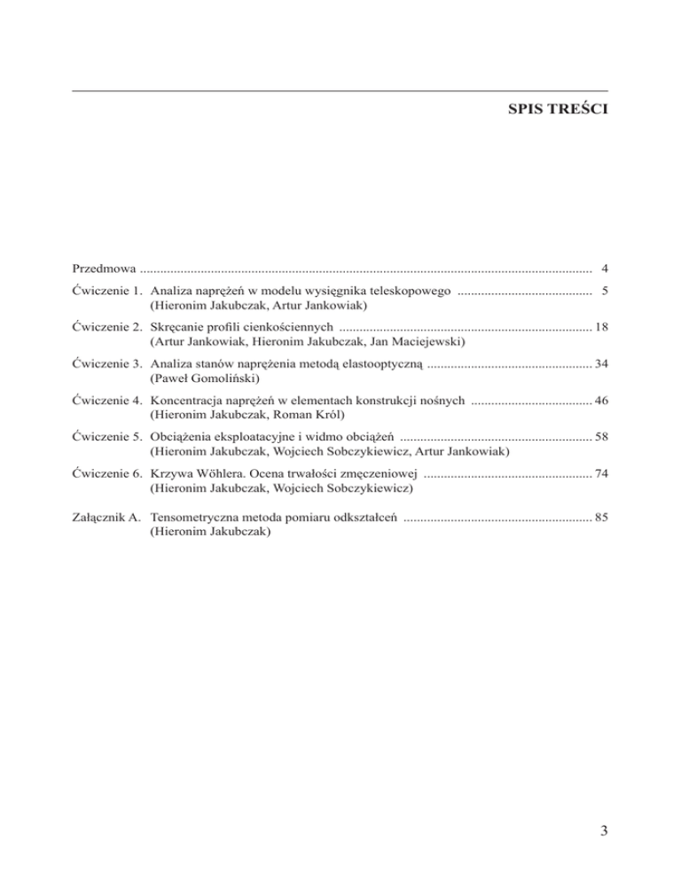 SPIS TREŚCI Przedmowa ...................................................................................................................................... 4 Ćwiczenie 1. Analiza naprężeń w modelu wysięgnika teleskopowego ........................................ 5 (Hieronim Jakubczak, Artur Jankowiak) Ćwiczenie 2. Skręcanie profili cienkościennych ........................................................................... 18 (Artur Jankowiak, Hieronim Jakubczak, Jan Maciejewski) Ćwiczenie 3. Analiza stanów naprężenia metodą elastooptyczną ................................................. 34 (Paweł Gomoliński) Ćwiczenie 4. Koncentracja naprężeń w elementach konstrukcji nośnych .................................... 46 (Hieronim Jakubczak, Roman Król) Ćwiczenie 5. Obciążenia eksploatacyjne i widmo obciążeń ......................................................... 58 (Hieronim Jakubczak, Wojciech Sobczykiewicz, Artur Jankowiak) Ćwiczenie 6. Krzywa Wöhlera. Ocena trwałości zmęczeniowej .................................................. 74 (Hieronim Jakubczak, Wojciech Sobczykiewicz) Załącznik A. Tensometryczna metoda pomiaru odkształceń ........................................................ 85 (Hieronim Jakubczak) 3