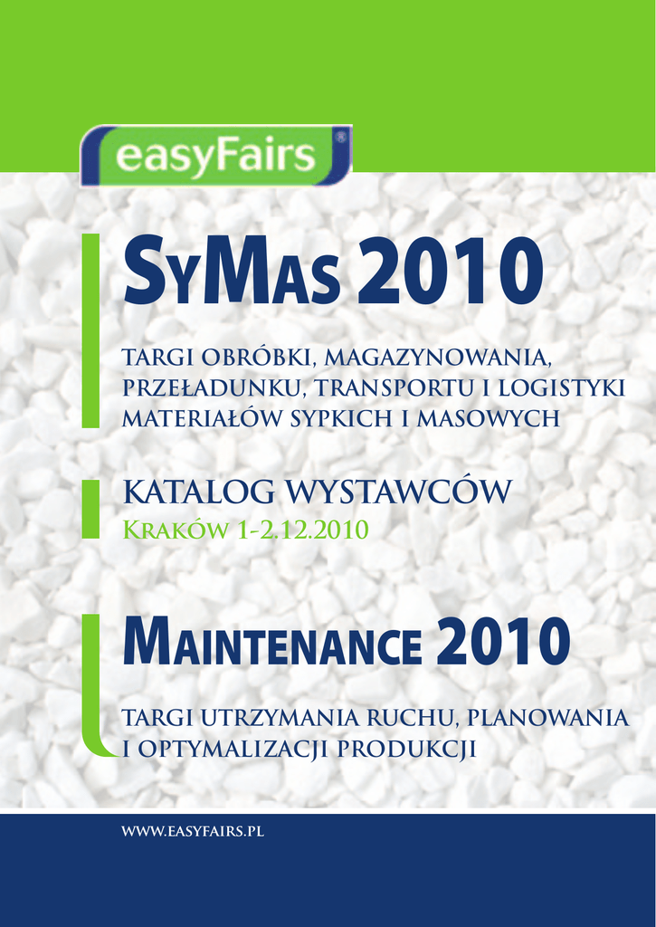 SyMas 2010 TARGI OBRÓBKI, MAGAZYNOWANIA, PRZEŁADUNKU, TRANSPORTU I LOGISTYKI MATERIAŁÓW SYPKICH I MASOWYCH Katalog WYSTAWCÓW Kraków 1-2.12.2010 Maintenance 2010 TARGI UTRzYMANIA RUCHU, PLANOWANIA I OPTYMALIZACJI PRODUKCJI www.easyfairs.pl Witamy Szanowni Państwo! Mamy przyjemność powitać Państwa na II edycji jedynych w Polsce targów przeznaczonych dla branży materiałów sypkich i masowych – easyFairs®SyMas. Poprzednia edycja targów udowodniła, że prezentacja maszyn i urządzeń, służących obróbce, magazynowaniu, przeładunkowi i transportowi materiałów sypkich i masowych jest na polskim rynku bardzo pożądana. W tym roku zdecydowaliśmy się na rozszerzenie oferty poprzez organizację – równolegle z targami easyFairs®SyMas – targów utrzymania ruchu, planowania i optymalizacji produkcji – easyFairs®Maintenance. Nowy temat targów został wprowadzony w odpowiedzi na liczne zapytania ubiegłorocznych odwiedzających targi easyFairs®SyMas. Pragnąc sprostać Państwa oczekiwaniom, postanowiliśmy połączyć obydwie imprezy, aby zaoszczędzić czas tych z Państwa, którzy zainteresowani są również zagadnieniem utrzymania ruchu w przedsiębiorstwach. Naszym celem jest zapewnienie Państwu jak najlepszych warunków do odwiedzenia naszych targów. Ich struktura jest jasna i przejrzysta, co pozwoli szybko odnaleźć interesujących Państwa wystawców i ich stoiska. Standaryzacja modułów umożliwia koncentrację uwagi na ciekawej ofercie produktowej i nowościach z branży, a nie na samej oprawie. „Nawiązaliśmy sporo ciekawych kontaktów, które, mam nadzieję, będą się dalej rozwijały z obopólną korzyścią. Czas trwania imprezy uważam za optymalny, ponieważ nie odciągał nas zbyt długo od podstawowych zajęć, a jednocześnie czasu było dosyć, aby nawiązać kontakty do ewentualnej współpracy” – podkreśla ubiegłoroczny wystawca – Zdzisław Niewiński, właściciel firmy Elektroniczne Wagi Przemysłowe. Jesteśmy przekonani, że dzięki formule targów easyFairs®, również dla Państwa wizyta na tegorocznych targach będzie w pełni satysfakcjonująca. W ramach targów mogą Państwo również skorzystać z bezpłatnego udziału w seminariach learnShops™. Są to krótkie prezentacje nowości i ciekawych rozwiązań związanych z branżą materiałów sypkich i masowych, a także z sektorem utrzymania ruchu, z nastawieniem przede wszystkim na zastosowania praktyczne. Usytuowanie warsztatów na hali wystawowej, a nie w zamkniętych salach, umożliwi Państwu swobodny udział w interesujących Państwa seminariach. Pierwszego dnia targów zapraszamy również na II Ogólnopolską Konferencję „Materiały Sypkie i Masowe” organizowaną przez naszego partnera – magazyn branżowy Powder & Bulk. Tegoroczna edycja targów easyFairs®SyMas i easyFairs®Maintenance z pewnością będzie dla Państwa doskonałą okazją do nawiązania współpracy z największymi firmami w Polsce i za granicą, znalezienia ciekawych rozwiązań oraz poszerzenia wiedzy na temat branży materiałów sypkich i masowych oraz sektora utrzymania ruchu. Dziękujemy za Państwa wizytę i już dziś zapraszamy na kolejną edycję w listopadzie 2011 roku. Dyrektor Zarządzający easyFairs®Poland Sp. z o. o. Ewa Woch-Kośmider Tereny wystawowe: Hala Targów w Krakowie, ul. Centralna 41a Termin: 1-2 grudnia 2010 r. Godziny otwarcia Targów: 1.12.2010 r. godz. 9.00-16.00 2.12.2010 r. godz. 9.00-15.30 Dojazd: Przystanek CENTRALNA Tramwaje: 1, 14, 22 Autobusy: 113, 121, 163, 174 Wstęp na targi jest bezpłatny po dokonaniu rejestracji na stronie www.easyfairs.pl/symas lub www.easyfairs.pl/mtc lub po okazaniu wypełnionego zaproszenia. SPIS TREŚCI Witamy Learn Shops Lista wystawców Plan hali 2 www.easyfairs.pl 2 3 4 4-5 Harmonogram II Konferencji „Materiały sypkie i masowe” Wpisy firm Patroni medialni Plany targowe na 2011 rok 6 7 24 26 learnShops Program learnShops™ SyMas/Maintenance 2010 Kraków, hala TwK, 1-2 grudnia 2010 r. 01.12.2010 r. (środa) 10:00 RECTUS POLSKA Sp. z o. o. Zawory zaciskowe firmy AKO Armaturen Grzegorz Franiak 10:30Holroyd Instruments Ltd.: Quick & Simple Condition Monitoring Trevor Holroyd 11.30 I-care sarl Belgium Condition monitoring of slow speed machinery 12.00 BalticBerg Consulting Doskonalenie utrzymania ruchu – nowoczesne strategie i metodologie Arkadiusz Burnos 13:00 Nivelco-Poland Sp. z o. o. Aparatura oferowana przez Nivelco-Poland do pomiarów poziomu i przepływu materiałów sypkich Dariusz Piszer 13.30 KAESER KOMPRESSOREN Sp. z o. o. Racjonalna gospodarka sprężonym powietrzem Grzegorz Szajna 14.00 Hansford Sensors Sp. z o. o. Wykorzystanie akcelerometrów w monitorowaniu stanu maszyn Mateusz Bujak 14.30 Fluke Jak być w dwóch miejscach jednocześnie dzięki urządzeniom pomiarowym firmy FLUKE Robert Olkiewicz 15.00 CEREUS WENA ADAM i GRAŻYNA WITKOWSCY Sp. j. Najnowsze trendy w zastosowaniu środków smarowych Statoil w transporcie ciężkim i urządzeniach stosowanych do przeładunku i magazynowania Tomasz Piergies 02.12.2010 r. (czwartek) 10.00 PRO-ORGANIKA Sp. z o. o. Jacob - system rurowy - nr 1 w Europie Eurac - złączki do łączenia rurociągów Vigilex - panele bezpieczeństwa zabezpieczające przed wzrostem ciśnienia (wybuchowego) Andrzej Żelazo 11.00 SOFRADEN Dozowanie dodatków – elastyczność, niezawodność, bezpieczeństwo Jarosław Manczew 11.30 Mas Trading Pakowanie szczelne VACUUM. Foliowanie kapturowe palet (stretch) Piotr Ławski 12.00 KOOPERACJA „POLKO” Sp. z o. o. Urządzenia systemu POLKO w przemyśle Damian Homa 12.30 Herding - Technika Filtracyjna Sp. z o. o. Bezpieczny odzysk materiałów pylistych Adam Zahler 13.00 TESSA WOLFF I SYNOWIE Sp. j. Kompendium wiedzy (teoria i praktyka) z zakresu przeciwwybuchowego zabezpieczania instalacji transportu i odpylania materiałów sypkich Bartosz Wolff 14.00 Biuro Inżynierskie Maciej Zajączkowski Ważenie dynamiczne drogą do op
