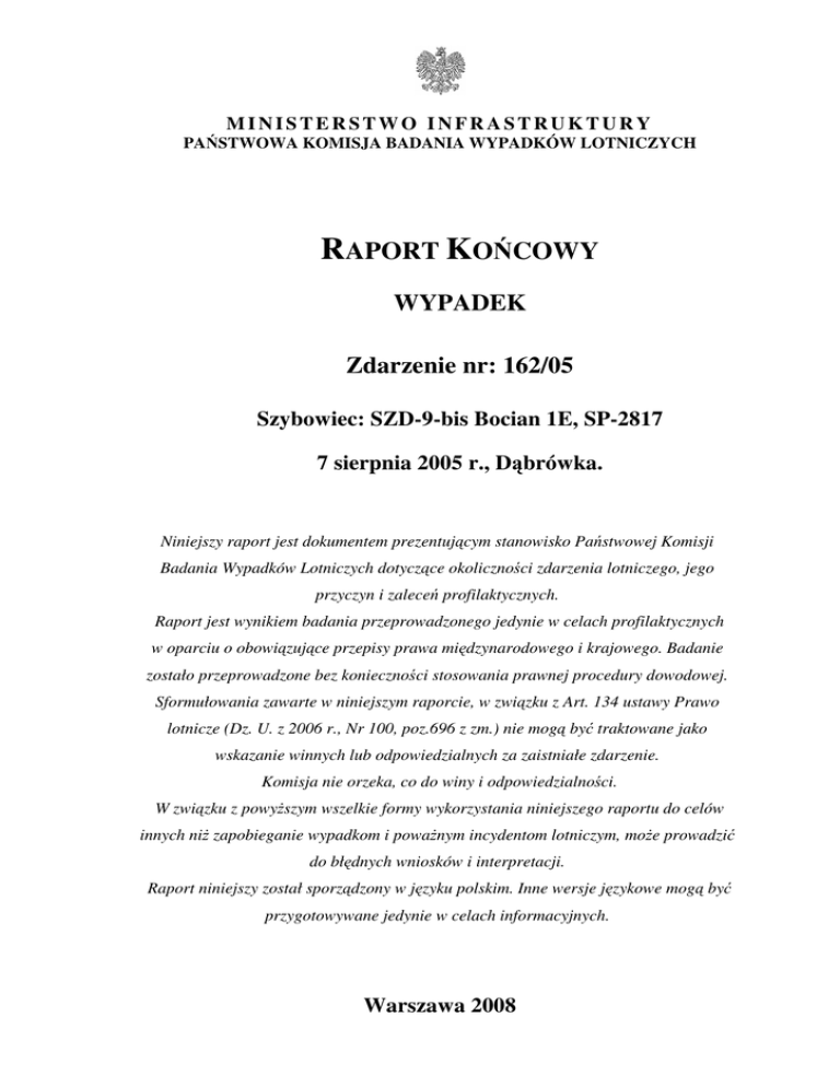 MINISTERSTWO INFRASTRUKTURY PAŃSTWOWA KOMISJA BADANIA WYPADKÓW LOTNICZYCH RAPORT KOŃCOWY WYPADEK Zdarzenie nr: 162/05 Szybowiec: SZD-9-bis Bocian 1E, SP-2817 7 sierpnia 2005 r., Dąbrówka. Niniejszy raport jest dokumentem prezentującym stanowisko Państwowej Komisji Badania Wypadków Lotniczych dotyczące okoliczności zdarzenia lotniczego, jego przyczyn i zaleceń profilaktycznych. Raport jest wynikiem badania przeprowadzonego jedynie w celach profilaktycznych w oparciu o obowiązujące przepisy prawa międzynarodowego i krajowego. Badanie zostało przeprowadzone bez konieczności stosowania prawnej procedury dowodowej. Sformułowania zawarte w niniejszym raporcie, w związku z Art. 134 ustawy Prawo lotnicze (Dz. U. z 2006 r., Nr 100, poz.696 z zm.) nie mogą być traktowane jako wskazanie winnych lub odpowiedzialnych za zaistniałe zdarzenie. Komisja nie orzeka, co do winy i odpowiedzialności. W związku z powyższym wszelkie formy wykorzystania niniejszego raportu do celów innych niż zapobieganie wypadkom i poważnym incydentom lotniczym, może prowadzić do błędnych wniosków i interpretacji. Raport niniejszy został sporządzony w języku polskim. Inne wersje językowe mogą być przygotowywane jedynie w celach informacyjnych. Warszawa 2008 Państwowa Komisja Badania Wypadków Lotniczych Szybowiec SZD-9 bis Bocian 1E, SP-2817, 07.08. 2005 r. Dąbrówka SPIS TREŚCI Informacje Ogólne......................................................................................................... 3 Streszczenie ................................................................................................................... 3 1. INFORMACJE FAKTYCZNE I ANALIZA ......................................................... 4 1.1. Historia lotu, analiza okoliczności i przebiegu zdarzenia lotniczego ................. 4 1.2. Obrażenia osób.................................................................................................... 5 1.3. Uszkodzenia statku powietrznego....................................................................... 5 1.4. Inne uszkodzenia................................................................................................. 5 1.5. Informacja o składzie osobowym (dane o załodze) ............................................ 5 1.6. Informacja o statku powietrznym........................................................................ 6 1.7. Informacje meteorologiczne................................................................................ 6 1.8. Środki nawigacyjne............................................................................................. 6 1.9. Łączność.............................................................................................................. 6 1.10. Informacje o lotnisku ........................................................................................ 6 1.11. Pokładowe rejestratory...................................................................................... 7 1.12. Informacja o szczątkach i zderzeniu ................................................................. 7 1.13. Informacje medyczne i patologiczne ................................................................ 7 1.14. Pożar.................................................................................................................. 7 1.15. Ratownictwo i szansa przeżycia........................................................................ 7 1.16. Badania i ekspertyzy ......................................................................................... 7 2. WNIOSKI.................................................................................................................. 7 2.1. Ustalenia komisji................................................................................................. 7 2.2. Przyczyna wypadku lotniczego........................................................................... 8 3. ZALECENIA PROFILAKTYCZNE ........................................................................ 9 RAPORT KOŃCOWY Strona 2 z 9 Państwowa Komisja Badania Wypadków Lotniczych Szybowiec SZD-9 bis Bocian 1E, SP-2817, 07.08. 2005 r. Dąbrówka INFORMACJE OGÓLNE Nr ewidencyjny zdarzenia: Rodzaj i typ statku powietrznego: Znak rozpoznawczy statku powietrznego: Dowódca statku powietrznego: 162/05 Szybowiec: SZD-9-bis Bocian 1E” SP-2817 Uczeń-pilot Użytkownik statku powietrznego: Aeroklub regionalny Właściciel statku powietrznego: Aeroklub regionalny Miejsce zdarzenia: Data i czas zdarzenia: Dąbrówka 07 sierpnia 2005 r., godz.14:36 LT STRESZCZENIE W dniu 7 sierpnia 2005r. w czasie lotu termicznego wg zadania A-VI ćwicz. 1 na szybowcu SZD-9bis Bocian 1E ze znakami rozpoznawczymi SP-2817 uczeń-pilot oddalił się od lotniska i lądował przymusowo w terenie przygodnym na polu porośniętym trawą uderzając w niewidoczne głębokie poprzeczne bruzdy. Uczeń-pilot nie doznał obrażeń. Szybowiec został poważnie uszkodzony. O zdarzeniu powiadomiono Państwową Komisję Badania Wypadków Lotniczych. Badanie wypadku prowadził zespół badawczy PKBWL w składzie: mgr inż. Jerzy KĘDZIERSKI - kierownik zespołu badawczego. mgr Agata KACZYŃSKA - członek zespołu inż. Tomasz MAKOWSKI - członek zespołu W trakcie badania PKBWL ustaliła, co następuje: Przyczynami zdarzenia były błędy ucznia-pilota polegające na: - zastosowaniu niewłaściwej taktyki termicznego lotu nadlotniskowego, co spowodowało niezamierzone wyjście ze stożka dolotowego, - zbyt późnym wybraniu pola do przymusowego lądowania - nieumiejętnym przeprowadzeniu manewru lądowania, co spowodowało silne uderzenie podwozia szybowca w nierówną poprzecznie pofałdowaną RAPORT KOŃCOWY Strona 3 z 9 Państwowa Komisja Badania Wypadków Lotniczych Szybowiec SZD-9 bis Bocian 1E, SP-2817, 07.08. 2005 r. Dąbrówka powierzchnię terenu oraz dodatkowe nadmierne obciążenie konstrukcji i złamanie kadłuba szybowca. Wpływ na zaistn