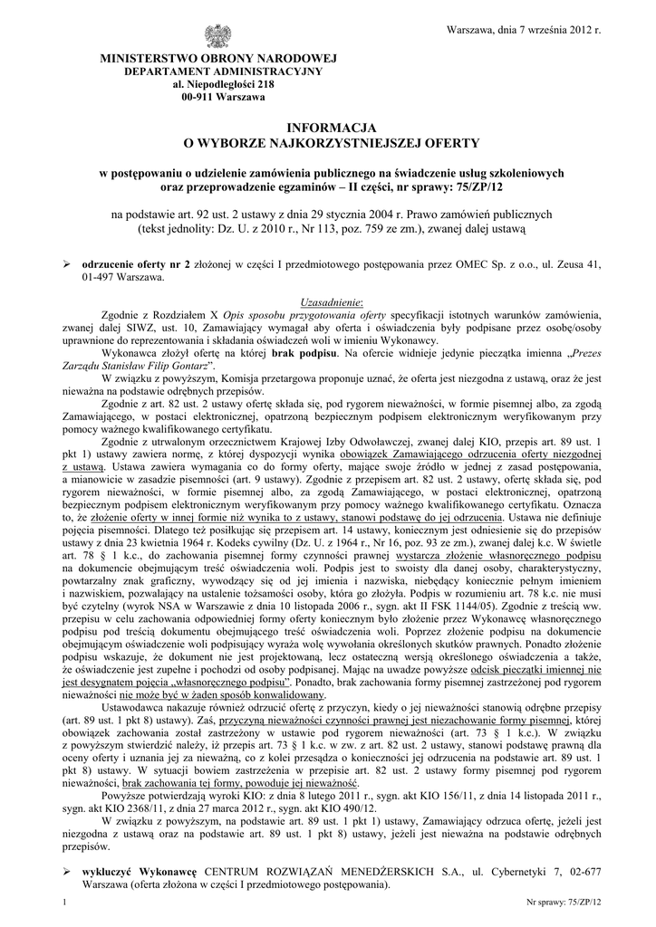 Warszawa, dnia 7 września 2012 r. MINISTERSTWO OBRONY NARODOWEJ DEPARTAMENT ADMINISTRACYJNY al. Niepodległości 218 00-911 Warszawa INFORMACJA O WYBORZE NAJKORZYSTNIEJSZEJ OFERTY w postępowaniu o udzielenie zamówienia publicznego na świadczenie usług szkoleniowych oraz przeprowadzenie egzaminów – II części, nr sprawy: 75/ZP/12 na podstawie art. 92 ust. 2 ustawy z dnia 29 stycznia 2004 r. Prawo zamówień publicznych (tekst jednolity: Dz. U. z 2010 r., Nr 113, poz. 759 ze zm.), zwanej dalej ustawą odrzucenie oferty nr 2 złoŜonej w części I przedmiotowego postępowania przez OMEC Sp. z o.o., ul. Zeusa 41, 01-497 Warszawa. Uzasadnienie: Zgodnie z Rozdziałem X Opis sposobu przygotowania oferty specyfikacji istotnych warunków zamówienia, zwanej dalej SIWZ, ust. 10, Zamawiający wymagał aby oferta i oświadczenia były podpisane przez osobę/osoby uprawnione do reprezentowania i składania oświadczeń woli w imieniu Wykonawcy. Wykonawca złoŜył ofertę na której brak podpisu. Na ofercie widnieje jedynie pieczątka imienna „Prezes Zarządu Stanisław Filip Gontarz”. W związku z powyŜszym, Komisja przetargowa proponuje uznać, Ŝe oferta jest niezgodna z ustawą, oraz Ŝe jest niewaŜna na podstawie odrębnych przepisów. Zgodnie z art. 82 ust. 2 ustawy ofertę składa się, pod rygorem niewaŜności, w formie pisemnej albo, za zgodą Zamawiającego, w postaci elektronicznej, opatrzoną bezpiecznym podpisem elektronicznym weryfikowanym przy pomocy waŜnego kwalifikowanego certyfikatu. Zgodnie z utrwalonym orzecznictwem Krajowej Izby Odwoławczej, zwanej dalej KIO, przepis art. 89 ust. 1 pkt 1) ustawy zawiera normę, z której dyspozycji wynika obowiązek Zamawiającego odrzucenia oferty niezgodnej z ustawą. Ustawa zawiera wymagania co do formy oferty, mające swoje źródło w jednej z zasad postępowania, a mianowicie w zasadzie pisemności (art. 9 ustawy). Zgodnie z przepisem art. 82 ust. 2 ustawy, ofertę składa się, pod rygorem niewaŜności, w formie pisemnej albo, za zgodą Zamawiającego, w postaci elektronicznej, opatrzoną bezpiecznym podpisem elektronicznym weryfikowanym przy pomocy waŜnego kwalifikowanego certyfikatu. Oznacza to, Ŝe złoŜenie oferty w innej formie niŜ wynika to z ustawy, stanowi podstawę do jej odrzucenia. Ustawa nie definiuje pojęcia pisemności. Dlatego teŜ posiłkując się przepisem art. 14 ustawy, koniecznym jest odniesienie się do przepisów ustawy z dnia 23 kwietnia 1964 r. Kodeks cywilny (Dz. U. z 1964 r., Nr 16, poz. 93 ze zm.), zwanej dalej k.c. W świetle art. 78 § 1 k.c., do zachowania pisemnej formy czynności prawnej wystarcza złoŜenie własnoręcznego podpisu na dokumencie obejmującym treść oświadczenia woli. Podpis jest to swoisty dla danej osoby, charakterystyczny, powtarzalny znak graficzny, wywodzący się od jej imienia i nazwiska, niebędący koniecznie pełnym imieniem i nazwiskiem, pozwalający na ustalenie toŜsamości osoby, która go złoŜyła. Podpis w rozumieniu art. 78 k.c. nie musi być czytelny (wyrok NSA w Warszawie z dnia 10 listopada 2006 r., sygn. akt II FSK 1144/05). Zgodnie z treścią ww. przepisu w celu zachowania odpowiedniej formy oferty koniecznym było złoŜenie przez Wykonawcę własnoręcznego podpisu pod treścią dokumentu obejmującego treść oświadczenia woli. Poprzez złoŜenie podpisu na dokumencie obejmującym oświadczenie woli podpisujący wyraŜa wolę wywołania określonych skutków prawnych. Ponadto złoŜenie podpisu wskazuje, Ŝe dokument nie jest projektowaną, lecz ostateczną wersją określonego oświadczenia a takŜe, Ŝe oświadczenie jest zupełne i pochodzi od osoby podpisanej. Mając na uwadze powyŜsze odcisk pieczątki imiennej nie jest desygnatem pojęcia „własnoręcznego podpisu”. Ponadto, brak zachowania formy pisemnej zastrzeŜonej pod rygorem niewaŜności nie moŜe być w Ŝaden sposób konwalidowany. Ustawodawca nakazuje równieŜ odrzucić ofertę z przyczyn, kiedy o jej niewaŜności stanowią odrębne przepisy (art. 89 ust. 1 pkt 8) ustawy). Zaś, przyczyną niewaŜności czynności prawnej jest niezachowanie formy pisemnej, której obowiązek zachowania został zastrzeŜony w ustawie pod rygorem niewaŜności (art. 73 § 1 k.c.). W związku z powyŜszym stwierdzić naleŜy, iŜ przepis art. 73 § 1 k.c. w zw. z art. 82 ust. 2 ustawy, stanowi podstawę prawną dla oceny oferty i uznania jej za niewaŜną, co z kolei przesądza o konieczności jej odrzucenia na podstawie art. 89 ust. 1 pkt 8) ustawy. W sytuacji bowiem zastrzeŜenia w przepisie art. 82 ust. 2 ustawy formy pisemnej pod rygorem niewaŜności, brak zachowania tej formy, powoduje jej niewaŜność. PowyŜsze potwierdzają wyroki KIO: z dnia 8 lutego 2011 r., sygn. akt KIO 156/11, z dnia 14 listopada 2011 r., sygn. akt KIO 2368/11, z dnia 27 marca 2012 r., sygn. akt KIO 490/12. W związku z powyŜszym, na podstawie art. 89 ust. 1 pkt 1) ustawy, Zamawiający odrzuca ofertę, jeŜeli jest niezgodna z ustawą oraz na podstawie art. 89 ust. 1 pkt 8) ustawy, jeŜeli jest niewaŜna na podstawie odrębnych przepisów. 1 wykluczyć Wykonawcę CENTRUM ROZWIĄZAŃ MENEDśERSKICH S.A., ul. Cybernetyki 7, 02-677 Warszawa (oferta złoŜona w części I przedmiotowego postępowania). Nr sprawy: 75/ZP/12 Uzasadnienie: W Rozdziale IV Warunki udziału w postępowaniu oraz opis sposobu dokonywania oceny spełniania tych warunków, ust. 1 pkt 3) SIWZ, Zamawiający wymagał, aby Wykonawca wykazał, Ŝe do realizacji zamówienia będzie dysponował co najmniej 2 (dwoma) wykładowcami, z których kaŜdy: Dotyczy części I: a) dla Akredytowanego szkolenia Metodyka zarządzania projektami Prince2® Foundation, przeprowadził co najmniej 5 szkoleń z powyŜszego zakresu, b) dla Akredytowanego szkolenia Metodyka zarządzania projektami Prince2® Practitioner, przeprowadził co najmniej 5 szkoleń z powyŜszego zakresu, c) dla Akredytowanego szkolenia ITIL® Foundation, przeprowadził co najmniej 5