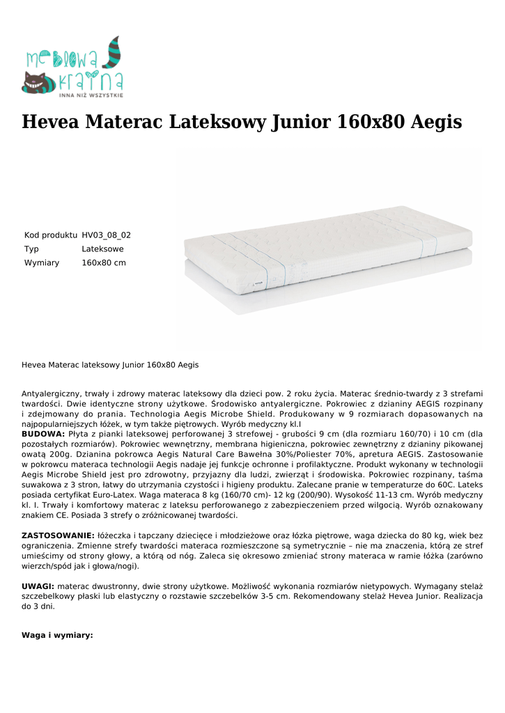 Hevea Materac Lateksowy Junior 160x80 Aegis Kod produktu HV03_08_02 Typ Lateksowe Wymiary 160x80 cm Hevea Materac lateksowy Junior 160x80 Aegis Antyalergiczny, trwały i zdrowy materac lateksowy dla dzieci pow. 2 roku życia. Materac średnio-twardy z 3 strefami twardości. Dwie identyczne strony użytkowe. Środowisko antyalergiczne. Pokrowiec z dzianiny AEGIS rozpinany i zdejmowany do prania. Technologia Aegis Microbe Shield. Produkowany w 9 rozmiarach dopasowanych na najpopularniejszych łóżek, w tym także piętrowych. Wyrób medyczny kl.I BUDOWA: Płyta z pianki lateksowej perforowanej 3 strefowej - grubości 9 cm (dla rozmiaru 160/70) i 10 cm (dla pozostałych rozmiarów). Pokrowiec wewnętrzny, membrana higieniczna, pokrowiec zewnętrzny z dzianiny pikowanej owatą 200g. Dzianina pokrowca Aegis Natural Care Bawełna 30%/Poliester 70%, apretura AEGIS. Zastosowanie w pokrowcu materaca technologii Aegis nadaje jej funkcje ochronne i profilaktyczne. Produkt wykonany w technologii Aegis Microbe Shield jest pro zdrowotny, przyjazny dla ludzi, zwierząt i środowiska. Pokrowiec rozpinany, taśma suwakowa z 3 stron, łatwy do utrzymania czystości i higieny produktu. Zalecane pranie w temperaturze do 60C. Lateks posiada certyfikat Euro-Latex. Waga materaca 8 kg (160/70 cm)- 12 kg (200/90). Wysokość 11-13 cm. Wyrób medyczny kl. I. Trwały i komfortowy materac z lateksu perforowanego z zabezpieczeniem przed wilgocią. Wyrób oznakowany znakiem CE. Posiada 3 strefy o zróżnicowanej twardości. ZASTOSOWANIE: łóżeczka i tapczany dziecięce i młodzieżowe oraz łózka piętrowe, waga dziecka do 80 kg, wiek bez ograniczenia. Zmienne strefy twardości materaca rozmieszczone są symetrycznie – nie ma znaczenia, którą ze stref umieścimy od strony głowy, a którą od nóg. Zaleca się okresowo zmieniać strony materaca w ramie łóżka (zarówno wierzch/spód jak i głowa/nogi). UWAGI: materac dwustronny, dwie strony użytkowe. Możliwość wykonania rozmiarów nietypowych. Wymagany stelaż szczebelkowy płaski lub elastyczny o rozstawie szczebelków 3-5 cm. Rekomendowany stelaż Hevea Junior. Realizacja do 3 dni. Waga i wymiary: ∙ waga materaca od 8 kg (160/70) do 12 kg (200/90), wys. ok. 11 - 13 cm (z pokrowcem); ∙ dostępne rozmiary: 160/70, 160/80, 160/90, 180/80, 180/90, 190/80, 190/90, 200/80, 200/90. Czas oczekiwania: 1-3 dni robocze. Rodzaj pokrowca: Aegis Natural Care. Twardość: H2 (średnio twardy). Gwarancja: 24 miesiące (10 lat na wkład lateksowy).