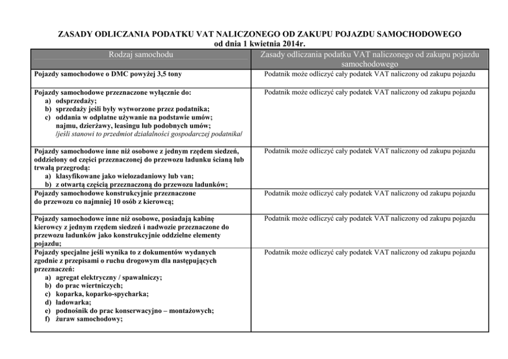 ZASADY ODLICZANIA PODATKU VAT NALICZONEGO OD ZAKUPU POJAZDU SAMOCHODOWEGO od dnia 1 kwietnia 2014r. Rodzaj samochodu Zasady odliczania podatku VAT naliczonego od zakupu pojazdu samochodowego Pojazdy samochodowe o DMC powyżej 3,5 tony Podatnik może odliczyć cały podatek VAT naliczony od zakupu pojazdu Pojazdy samochodowe przeznaczone wyłącznie do: a) odsprzedaży; b) sprzedaży jeśli były wytworzone przez podatnika; c) oddania w odpłatne używanie na podstawie umów; najmu, dzierżawy, leasingu lub podobnych umów; /jeśli stanowi to przedmiot działalności gospodarczej podatnika/ Podatnik może odliczyć cały podatek VAT naliczony od zakupu pojazdu Pojazdy samochodowe inne niż osobowe z jednym rzędem siedzeń, oddzielony od części przeznaczonej do przewozu ładunku ścianą lub trwałą przegrodą: a) klasyfikowane jako wielozadaniowy lub van; b) z otwartą częścią przeznaczoną do przewozu ładunków; Pojazdy samochodowe konstrukcyjnie przeznaczone do przewozu co najmniej 10 osób z kierowcą; Podatnik może odliczyć cały podatek VAT naliczony od zakupu pojazdu Pojazdy samochodowe inne niż osobowe, posiadają kabinę kierowcy z jednym rzędem siedzeń i nadwozie przeznaczone do przewozu ładunków jako konstrukcyjnie oddzielne elementy pojazdu; Pojazdy specjalne jeśli wynika to z dokumentów wydanych zgodnie z przepisami o ruchu drogowym dla następujących przeznaczeń: a) agregat elektryczny / spawalniczy; b) do prac wiertniczych; c) koparka, koparko-spycharka; d) ładowarka; e) podnośnik do prac konserwacyjno – montażowych; f) żuraw samochodowy; Podatnik może odliczyć cały podatek VAT naliczony od zakupu pojazdu Podatnik może odliczyć cały podatek VAT naliczony od zakupu pojazdu Podatnik może odliczyć cały podatek VAT naliczony od zakupu pojazdu Pozostałe pojazdy samochodowe, jeśli podatnik wykorzystuje je wyłącznie do działalności gospodarczej przy prowadzeniu ewidencji przebiegu pojazd zgodnie z art. 86a ust. 7 i 8 ustawy o VAT i zawiadomienia naczelnika urzędu skarbowego o takim wykorzystywaniu pojazdu samochodowego; Pozostałe pojazdy samochodowe, jeśli podatnik wykorzystuje je wyłącznie do działalności gospodarczej nie prowadzi ewidencji przebiegu pojazd zgodnie z art. 86a ust. 7 i 8 ustawy o VAT lub nie zawiadomił naczelnika urzędu skarbowego o takim wykorzystywaniu pojazdu samochodowego; Pojazdy samochodowe o DMC równej lub niższej niż 3,5 tony poza wymienionymi wyżej Podatnik może odliczyć cały podatek VAT naliczony od zakupu pojazdu Podatnik może odliczyć 50% podatku VAT naliczonego od zakupu pojazdu Podatnik może odliczyć 50% podatku VAT naliczonego od zakupu pojazdu bez ograniczenia kwotowego