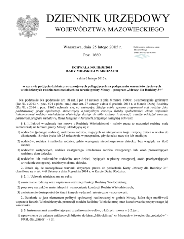 DZIENNIK URZĘDOWY WOJEWÓDZTWA MAZOWIECKIEGO Warszawa, dnia 25 lutego 2015 r. Elektronicznie podpisany przez: Sławomir Parys Poz. 1660 Data: 2015-02-25 16:11:07 UCHWAŁA NR III/58/2015 RADY MIEJSKIEJ W MROZACH z dnia 6 lutego 2015 r. w sprawie podjęcia działań prorozwojowych polegających na polepszeniu warunków życiowych wielodzietnych rodzin zamieszkałych na terenie gminy Mrozy – program „Mrozy dla Rodziny 3+” Na podstawie Na podstawie art. 18 ust. 2 pkt 15 ustawy z dnia 8 marca 1990 r. o samorządzie gminnym (Dz. U. z 2013 r., poz. 594 z późn. zm.) oraz art. 27 ustawy z dnia 5 grudnia 2014 r. o Karcie Dużej Rodziny (Dz. U. z 2014 r. poz. 1863) uchwala się, co następuje: Zdając sobie sprawę z ogromnej roli rodziny jako podstawowej grupy społecznej, stanowiącej o pomyślnym rozwoju każdej społeczności, chcąc wspomóc i uhonorować rodziny wielodzietne ułatwiając dostęp do dóbr kultury i rekreacji, a także odciążyć tworząc partnerski program rabatowy, Rada Miejska w Mrozach przyjmuje niniejszą uchwałę: § 1. 1. Ilekroć w uchwale jest mowa o Rodzinie Wielodzietnej - należy przez to rozumieć rodzinę stale zamieszkałą na terenie gminy Mrozy, składającą się z: 1) rodziców (jednego rodzica), małżonka rodzica, mających na utrzymaniu troje i więcej dzieci w wieku do ukończenia 18 roku życia lub 25 roku życia w przypadku, gdy dziecko uczy się lub studiuje; 2) rodziców, rodzica i małżonka rodzica, gdzie występuje niepełnosprawne dziecko, bez względu na ilość dzieci; 3) rodziców zastępczych, rodzica zastępczego i małżonka rodzica zastępczego lub osób prowadzących rodzinny dom dziecka; 4) rodziców lub małżonków rodziców oraz dzieci, będących w pieczy zastępczej, osób przebywających w rodzinie zastępczej, rodzinnym domu dziecka. 2. Ustala się, że szczegółowe warunki dotyczące prawa do posiadania Karty „Mrozy dla Rodziny 3+” określone są w art. 4-8 Ustawy z dnia 5 grudnia 2014 r. o Karcie Dużej Rodziny. § 2. 1. Uchwała niniejsza ma na celu: 1) umacnianie rodziny oraz wspieranie realizacji funkcji Rodziny Wielodzietnej; 2) poprawę warunków materialnych i wzmocnienie kondycji Rodzin Wielodzietnych; 3) zwiększenie dostępności do kina i innych wydarzeń artystyczno – sportowych. 2. Działanie to jest elementem polityki społecznej realizowanej w gminie Mrozy, która daje możliwość wsparcia Rodzin Wielodzietnych, promocji modelu Rodziny Wielodzietnej oraz kształtowania pozytywnego jej wizerunku. § 3. Instrumentami umożliwiającymi zrealizowanie celów, o których mowa w § 2 jest: 1) uprawnienie do zakupu zniżkowych biletów do kina „Mikroklimat” w Mrozach w kwocie: dla „rodziców” 10 zł, dla „dzieci” - 7 zł; Dziennik Urzędowy Województwa Mazowieckiego –2– Poz. 1660 2) uprawnienie do 50 % zniżki na wydarzenia organizowane przez GCK, GBP oraz GOSiR w Mrozach; 3) uprawnienie do 50% zniżki na opłaty za zajęcia dla dzieci, młodzieży i dorosłych realizowane przez gminne jednostki organizacyjne; 4) uprawnienie do 50% zniżki w przedszkolu gminnym na drugie dziecko, zwolnienie z opłaty na trzecie i kolejne dziecko; 5) prawo do zniżek wynegocjowanych z przedsiębiorcami należącymi do programu „Mrozy dla Rodziny 3+”. § 4. 1. Jako potwierdzenie do korzystania z uprawnień, o których mowa w §3 wprowadza się Kartę „Mrozy dla Rodziny 3+” . 2. Wzór Karty „Mrozy dla Rodziny 3+”, stanowi załącznik nr 1 do niniejszej uchwały. 3. Kartę „Mrozy dla rodziny 3+” będzie otrzymywał każdy członek Rodziny Wielodzietnej. 4. Warunkiem otrzymania Karty jest zamieszkiwanie na terenie gminy Mrozy. 5. W przypadku zagubienia Karty wydawany będzie duplikat za opłatą ustaloną przez Burmistrza Mrozów. § 5. 1. Uzyskanie Karty „Mrozy dla Rodziny 3+” odbywać się będzie na wniosek rodzica złożony w Urzędzie Stanu Cywilnego w Mrozach. 2. Wzór wniosku stanowi załącznik nr 2 do niniejszej uchwały. 3. Wniosek o wydanie Karty rozpatrywany jest w ciągu miesiąca od dnia jego złożenia wraz z załącznikami. 4. Karty „Mrozy dla Rodziny 3+” wydaje się od momentu pozytywnie zweryfikowanego wniosku do czasu spełniania przez rodzinę kryteriów niniejszej uchwały. 5. Karty tracą ważność z chwilą zaprzestania spełniania kryteriów, dokonania zmian w § 3 uchwały lub uchylenia niniejszej uchwały. § 6. Środki niezbędne na realizację instrumentów, o których mowa w § 3 zabezpieczone są z budżetu Gminy Mrozy. § 7. 1. Jednostką koordynującą realizację jest Urząd Stanu Cywilnego w Mrozach. 2. Kierownik Urzędu Stanu Cywilnego w Mrozach przedstawi Radzie Miejskiej w Mrozach informację o realizacji uchwały za dany rok najpóźniej do 31 marca po upływie danego roku budżetowego. § 8. 1. Urząd Stanu Cywilnego jako koordynator oraz Urząd Miasta i Gminy Mrozy będą prowadziły działania mające na celu pozyskiwanie partnerów do wspierania Karty „Mrozy dla Rodziny 3+”. 2. Wzór deklaracji dla partnerów pragnących przystąpić do programu „Mrozy dla Rodziny 3+” stanowi załącznik nr 3 do niniejszej uchwały. 3. Partnerów, którzy zadeklarowali przystąpienie do programu zobowiązuje się do umieszczenia w widocznym miejscu informacji o honorowaniu Karty „Mrozy dla Rodziny 3+”, przekazanej przez Urząd Stanu Cywilnego w Mrozach. Wzór informacji stanowi załącznik nr 4 do niniejszej uchwały. 4. Promocja działań w ramach Karty obejmować będzie ogłoszenia w lokalnej prasie, powierzchniach reklamowo - promocyjnych gminy oraz w Internecie. § 9. Wykonanie uchwały powierza się Burmistrzowi Mrozów. § 10. Traci moc uchwała Nr XXXI/345/2013 Rady Gminy Mrozy z dnia 30 września 2013 r. w sprawie podjęcia działań prorozwojowych polegających na polepszeniu warunków życiowych wielodzietnych rodzin zamieszkałych na terenie gminy Mrozy – program „Mrozy dla Rodziny 3+”. § 10. Uchwała wchodzi w życie po upływie 