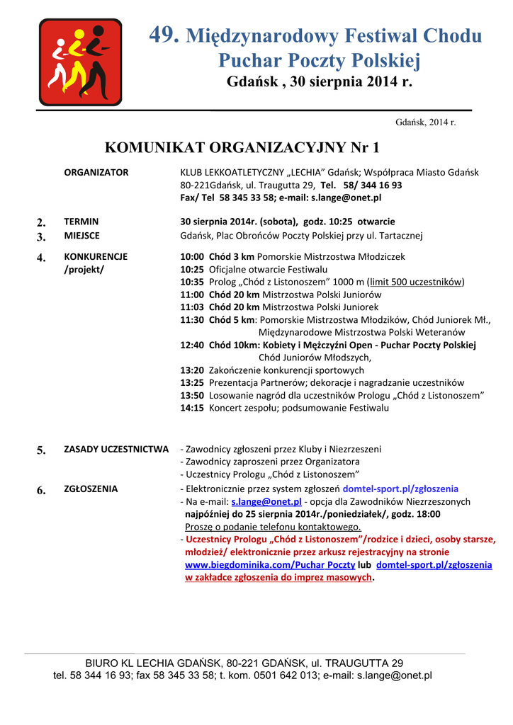 49. Międzynarodowy Festiwal Chodu Puchar Poczty Polskiej Gdańsk , 30 sierpnia 2014 r. Gdańsk, 2014 r. KOMUNIKAT ORGANIZACYJNY Nr 1 ORGANIZATOR KLUB LEKKOATLETYCZNY „LECHIA” Gdańsk; Współpraca Miasto Gdańsk 80-221Gdańsk, ul. Traugutta 29, Tel. 58/ 344 16 93 Fax/ Tel 58 345 33 58; e-mail: [email protected] 2. 3. TERMIN MIEJSCE 30 sierpnia 2014r. (sobota), godz. 10:25 otwarcie Gdańsk, Plac Obrońców Poczty Polskiej przy ul. Tartacznej 4. KONKURENCJE /projekt/ 10:00 10:25 10:35 11:00 11:03 11:30 12:40 13:20 13:25 13:50 14:15 5. ZASADY UCZESTNICTWA 6. ZGŁOSZENIA Chód 3 km Pomorskie Mistrzostwa Młodziczek Oficjalne otwarcie Festiwalu Prolog „Chód z Listonoszem” 1000 m (limit 500 uczestników) Chód 20 km Mistrzostwa Polski Juniorów Chód 20 km Mistrzostwa Polski Juniorek Chód 5 km: Pomorskie Mistrzostwa Młodzików, Chód Juniorek Mł., Międzynarodowe Mistrzostwa Polski Weteranów Chód 10km: Kobiety i Mężczyźni Open - Puchar Poczty Polskiej Chód Juniorów Młodszych, Zakończenie konkurencji sportowych Prezentacja Partnerów; dekoracje i nagradzanie uczestników Losowanie nagród dla uczestników Prologu „Chód z Listonoszem” Koncert zespołu; podsumowanie Festiwalu - Zawodnicy zgłoszeni przez Kluby i Niezrzeszeni - Zawodnicy zaproszeni przez Organizatora - Uczestnicy Prologu „Chód z Listonoszem” - Elektronicznie przez system zgłoszeń domtel-sport.pl/zgłoszenia - Na e-mail: [email protected] - opcja dla Zawodników Niezrzeszonych najpóźniej do 25 sierpnia 2014r./poniedziałek/, godz. 18:00 Proszę o podanie telefonu kontaktowego. - Uczestnicy Prologu „Chód z Listonoszem”/rodzice i dzieci, osoby starsze, młodzież/ elektronicznie przez arkusz rejestracyjny na stronie www.biegdominika.com/Puchar Poczty lub domtel-sport.pl/zgłoszenia w zakładce zgłoszenia do imprez masowych. BIURO KL LECHIA GDAŃSK, 80-221 GDAŃSK, ul. TRAUGUTTA 29 tel. 58 344 16 93; fax 58 345 33 58; t. kom. 0501 642 013; e-mail: [email protected] -2 - 7. NOCLEGI Zamówienia na noclegi ( osobno kobiety i mężczyźni) z 29.08/30.08 2014r. i 30.08/01.09 2014r. przesłać na e-mail Organizatora: [email protected] w obligatoryjnym terminie do 23 sierpnia 2014r./sobota/. Koszt 80 zł za dobę (nocleg 40,- zł + 40,- zł wyżywienie) Opłaty za noclegi i wyżywienie dokonać przy weryfikacji w Biurze 29 sierpnia 2014 r. 8. ZASADY FINANSOWANIA Koszty organizacji zawodów pokrywa Organizator. Koszty osobowe uczestnictwa pokrywają zawodnikom Kluby. Opłata Regulaminowa PZLA 15 zł /Juniorzy i Młodzicy 10 zł /; Prolog - bez opłat 9. NAGRODY a/ Nagrody Seniorki i Seniorzy 10 km/opcja/: Im-1500; IIm-1000; IIIm-800; IVm-500; V-300; VIm-200; VII-VIII -100 b/ Nagrody Juniorki i Juniorzy MP 20 km: Medale + finansowe c/ Nagrody Juniorki i Juniorzy Młodsi oraz Młodzicy: rzeczowe Zasady nagradzania zostaną podane przed Mityngiem. 10. BIURO ZAWODÓW 29.08.2014r. od 15:00 do 21:00 w Holu Głównym Zespołu Szkół Łączności, ul. Podwale Staromiejskie 51/52 (wejście od strony boiska) 30.08.2014r. od godz. 07:30 do 10:00 w Holu Głównym Zespołu Szkół Łączności. UWAGA: ZAWODNICY STARTUJĄ W NUMERACH PRZYDZIELONYCH PRZEZ ORGANIZATORA !!! ZAWODNICY NA PODIUM WYSTĘPUJĄ Z NUMEREM STARTOWYM FESTIWALU PRZYPIĘTYM NA KLATCE PIERSIOWEJ !!! Udział w 49. Festiwalu Chodu-Pucharze Poczty Polskiej jest równoznaczny z wyrażeniem zgody na wykorzystanie wizerunku uczestnika zawodów w materiałach promocyjnych Organizatora i Sponsorów Pucharu. 11. INNE: Obowiązek ubezpieczenia NNW spoczywa na macierzystym Klubie zawodników. 12. OTRZYMUJĄ: 1. PZLA 2. Kluby I i II ligi 3. OZLA - powiadamiają pozostałe kluby w Okręgu Dyrektor Festiwalu Stanisław Lange BIURO KL LECHIA GDAŃSK, 80-221 GDAŃSK, ul. TRAUGUTTA 29 tel. 58 344 16 93; fax 58 345 33 58; t. kom. 0501 642 013; e-mail: [email protected]