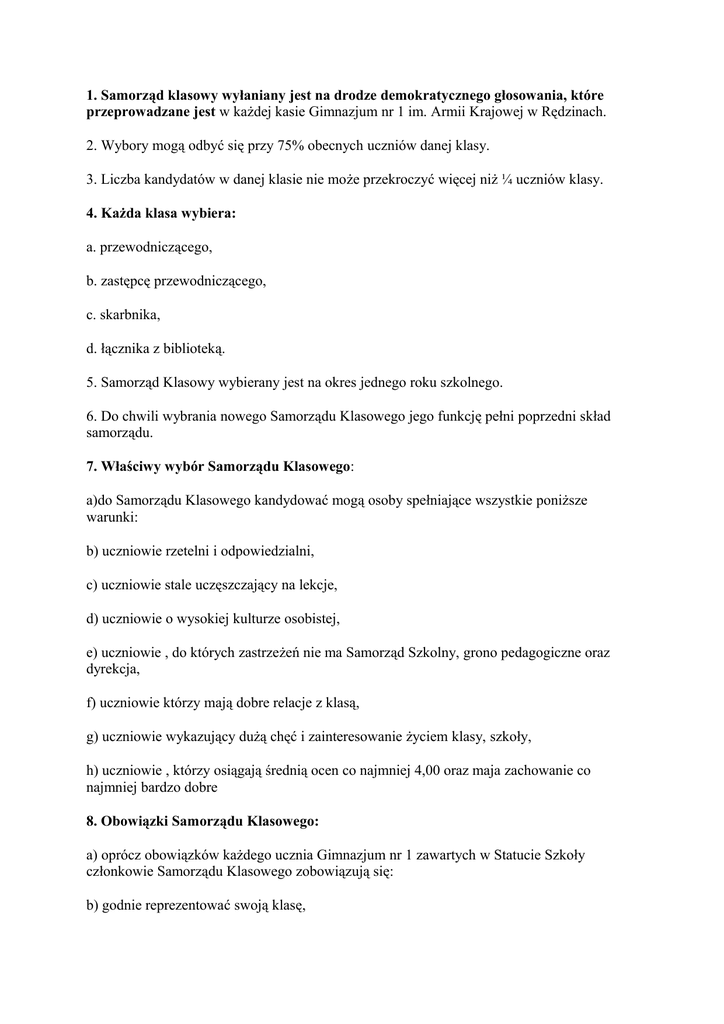 1. Samorząd klasowy wyłaniany jest na drodze demokratycznego głosowania, które przeprowadzane jest w każdej kasie Gimnazjum nr 1 im. Armii Krajowej w Rędzinach. 2. Wybory mogą odbyć się przy 75% obecnych uczniów danej klasy. 3. Liczba kandydatów w danej klasie nie może przekroczyć więcej niż ¼ uczniów klasy. 4. Każda klasa wybiera: a. przewodniczącego, b. zastępcę przewodniczącego, c. skarbnika, d. łącznika z biblioteką. 5. Samorząd Klasowy wybierany jest na okres jednego roku szkolnego. 6. Do chwili wybrania nowego Samorządu Klasowego jego funkcję pełni poprzedni skład samorządu. 7. Właściwy wybór Samorządu Klasowego: a)do Samorządu Klasowego kandydować mogą osoby spełniające wszystkie poniższe warunki: b) uczniowie rzetelni i odpowiedzialni, c) uczniowie stale uczęszczający na lekcje, d) uczniowie o wysokiej kulturze osobistej, e) uczniowie , do których zastrzeżeń nie ma Samorząd Szkolny, grono pedagogiczne oraz dyrekcja, f) uczniowie którzy mają dobre relacje z klasą, g) uczniowie wykazujący dużą chęć i zainteresowanie życiem klasy, szkoły, h) uczniowie , którzy osiągają średnią ocen co najmniej 4,00 oraz maja zachowanie co najmniej bardzo dobre 8. Obowiązki Samorządu Klasowego: a) oprócz obowiązków każdego ucznia Gimnazjum nr 1 zawartych w Statucie Szkoły członkowie Samorządu Klasowego zobowiązują się: b) godnie reprezentować swoją klasę, c) dbać o aktualną wymianę informacji w obrębie swojej klasy, d) wykonywać specjalne polecenia od grona pedagogicznego, dyrekcji, e) współpracować z Samorządem Szkolnym, pedagogiem szkolnym, gronem pedagogicznym, dyrekcją, f) informować odpowiednie organy o problemach, sporach w swojej klasie, g) zbierać informacje od swojej klasy o zastrzeżeniach, pomysłach związanych z funkcjonowaniem organów szkoły, w tym organizacją imprez szkolnych oraz innych działań, które mają miejsce w Gimnazjum nr 1 lub mogłyby mieć w nim miejsce, h) przewodniczący klasowi mają obowiązek stawiać się na spotkaniach ogłoszonych przez Samorząd Szkolny oraz inne organy, i) zastępca przewodniczącego powinien działać we współpracy z przewodniczącym a pod jego nieobecność przejmować jego obowiązki, j) skarbnik zobowiązany jest zbierać fundusze, bezpiecznie je przechowywać oraz nie dopuszczać do ich utracenia, k) łącznik z biblioteką współpracuje z biblioteką szkolną, 9. Prawa Samorządu Klasowego: Oprócz praw każdego ucznia Gimnazjum nr 1 zawartych w Statucie Szkoły członkowie samorządu klasowego mają prawo do: a) bezpośredniej współpracy z organami szkolnymi, b) wyrażania swoich poglądów, zastrzeżeń, pomysłów oraz reprezentowanej klasy, c) spotykania się i dyskutowania na spotkaniach ogłoszonych przez wybrany organ szkolny, d) zwalniania się z lekcji na czas spotkań organizowanych przez organy szkoły, e) pełne uczestniczenie w życiu szkolnym. 10. Osoby naruszające punkt 7 nie mogą kandydować do Samorządu Klasowego. 11. W wypadku udowodnionych podejrzeń o naruszanie punktu 7 przez osoby aktualnie pełniące funkcję w Samorządzie Klasowym na wniosek dyrekcji lub grona pedagogicznego lub wychowawcy bądź Samorządu Klasowego lub jednoznacznej większości swojej klasy następuje bezzwłoczne odwołanie takiej osoby z funkcji w Samorządzie Klasowym. 12. Osoba, która zostanie odwołana nie może kandydować w aktualnym roku szkolnym. 13. W przypadku odwołania przewodniczącego klasy jego funkcję przejmuje zastępca przewodniczącego, jeżeli wyrazi taką chęć. 14. Jeżeli zastępca przewodniczącego nie wyrazi zgody na objęcie nadrzędnej funkcji klasa przystępuje do wyborów uzupełniających. 15. W przypadku odwołania zastępcy przewodniczącego klasowego klasa przystępuje do wyborów uzupełniających. 16. Członkowie Samorządu Klasowego przystępują do niego dobrowolnie. 17. Członkom Samorządu Klasowego przysługuje możliwość odwołania się z pełnionej przez siebie funkcji pisemnie z uzasadnieniem do Samorządu Uczniowskiego. 18. W przypadku naruszenia zasady demokratycznego wyboru Samorządu Klasowego członek Samorządu Klasowego, uczeń danej klasy może kierować wniosek do Samorządu Szkolnego opisując zaistniałą sytuację. 19. W wypadku zastrzeżeń do Samorządu Klasowego przez Samorząd Szkolny może on wnieść o ponowne wybory.
