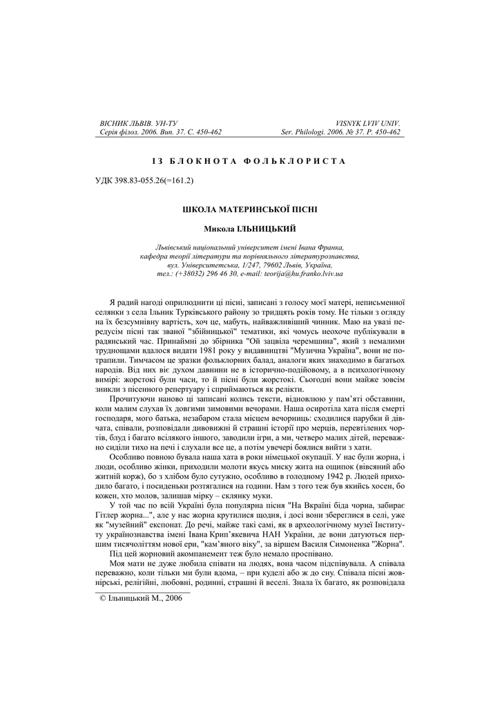 ВІСНИК ЛЬВІВ. УН-ТУ Серія філол. 2006. Вип. 37. С. 450-462 VISNYK LVIV UNIV. Ser. Philologi. 2006. № 37. P. 450-462 ІЗ БЛОКНОТА ФОЛЬКЛОРИСТА УДК 398.83-055.26(=161.2) ШКОЛА МАТЕРИНСЬКОЇ ПІСНІ Микола ІЛЬНИЦЬКИЙ Львівський національний університет імені Івана Франка, кафедра теорії літератури та порівняльного літературознавства, вул. Університетська, 1/247, 79602 Львів, Україна, тел.: (+38032) 296 46 30, e-mail: [email protected] Я радий нагоді оприлюднити ці пісні, записані з голосу моєї матері, неписьменної селянки з села Ільник Турківського району зо тридцять років тому. Не тільки з огляду на їх безсумнівну вартість, хоч це, мабуть, найважливіший чинник. Маю на увазі передусім пісні так званої "збійницької" тематики, які чомусь неохоче публікували в радянський час. Принаймні до збірника "Ой зацвіла черемшина", який з немалими труднощами вдалося видати 1981 року у видавництві "Музична Україна", вони не потрапили. Тимчасом це зразки фольклорних балад, аналоги яких знаходимо в багатьох народів. Від них віє духом давнини не в історично-подійовому, а в психологічному вимірі: жорстокі були часи, то й пісні були жорстокі. Сьогодні вони майже зовсім зникли з пісенного репертуару і сприймаються як релікти. Прочитуючи наново ці записані колись тексти, відновлюю у пам’яті обставини, коли малим слухав їх довгими зимовими вечорами. Наша осиротіла хата після смерті господаря, мого батька, незабаром стала місцем вечорниць: сходилися парубки й дівчата, співали, розповідали дивовижні й страшні історії про мерців, перевтілених чортів, блуд і багато всілякого іншого, заводили ігри, а ми, четверо малих дітей, переважно сиділи тихо на печі і слухали все це, а потім увечері боялися вийти з хати. Особливо повною бувала наша хата в роки німецької окупації. У нас були жорна, і люди, особливо жінки, приходили молоти якусь миску жита на ощипок (вівсяний або житній корж), бо з хлібом було сутужно, особливо в голодному 1942 р. Людей приходило багато, і посиденьки розтягалися на години. Нам з того теж був якийсь хосен, бо кожен, хто молов, залишав мірку – склянку муки. У той час по всій Україні була популярна пісня "На Вкраїні біда чорна, забирає Гітлер жорна...", але у нас жорна крутилися щодня, і досі вони збереглися в селі, уже як "музейний" експонат. До речі, майже такі самі, як в археологічному музеї Інституту українознавства імені Івана Крип’якевича НАН України, де вони датуються першим тисячоліттям нової ери, "кам’яного віку", за віршем Василя Симоненка "Жорна". Під цей жорновий акомпанемент теж було немало проспівано. Моя мати не дуже любила співати на людях, вона часом підспівувала. А співала переважно, коли тільки ми були вдома, – при куделі або ж до сну. Співала пісні жовнірські, релігійні, любовні, родинні, страшні й веселі. Знала їх багато, як розповідала © Ільницький М., 2006 Школа материнської пісні 451 потім, багато з них перейняла ще підлітком від сусідки, старенької бабусі. Втім, більшість із них увійшли до книжки "Ой зацвіла черемшина". Частина сюжетів співпадає з тими, що їх свого часу записував Іван Франко, очевидно, "репертуар" був поширений на всі підгірські околиці. Траплялися пісні польські, трохи попереінакшувані, – що не дивина, бо хоч у селі було тільки кілька польських родин, пісні переймала молодь. Були й російські, тут уже спричинилися обставини часу. Після відступу у 1915 р. російських військ з окупованої ними Галичини баг