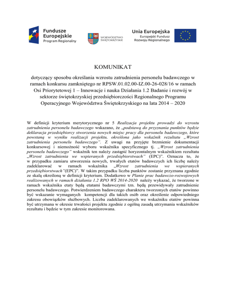 KOMUNIKAT dotyczący sposobu określania wzrostu zatrudnienia personelu badawczego w ramach konkursu zamkniętego nr RPSW.01.02.00-IZ.00-26-028/16 w ramach Osi Priorytetowej 1 – Innowacje i nauka Działania 1.2 Badanie i rozwój w sektorze świętokrzyskiej przedsiębiorczości Regionalnego Programu Operacyjnego Województwa Świętokrzyskiego na lata 2014 – 2020 W definicji kryterium merytorycznego nr 5 Realizacja projektu prowadzi do wzrostu zatrudnienia personelu badawczego wskazano, że „podstawą do przyznania punktów będzie deklaracja przedsiębiorcy stworzenia nowych miejsc pracy dla personelu badawczego, które powstaną w wyniku realizacji projektu, określona jako wskaźnik rezultatu „Wzrost zatrudnienia personelu badawczego”. Z uwagi na przyjęte brzmienie dokumentacji konkursowej i niemożność wyboru wskaźnika specyficznego tj. „Wzrost zatrudnienia personelu badawczego” wskaźnik ten należy zastąpić horyzontalnym wskaźnikiem rezultatu „Wzrost zatrudnienia we wspieranych przedsiębiorstwach” (EPC)”. Oznacza to, że w przypadku zamiaru utworzenia nowych, trwałych etatów badawczych ich liczbę należy zadeklarować w ramach wskaźnika „Wzrost zatrudnienia we wspieranych przedsiębiorstwach”(EPC)”. W takim przypadku liczba punktów zostanie przyznana zgodnie ze skalą określoną w definicji kryterium. Dodatkowo w Planie prac badawczo-rozwojowych realizowanych w ramach działania 1.2 RPO WŚ 2014-2020 należy wykazać, że tworzone w ramach wskaźnika etaty będą etatami badawczymi tzn. będą przewidywały zatrudnienie personelu badawczego. Potwierdzeniem badawczego charakteru tworzonych etatów powinno być wskazanie wymaganych kompetencji dla takich osób oraz określenie odpowiedniego zakresu obowiązków służbowych. Liczba zadeklarowanych we wskaźniku etatów powinna być utrzymana w okresie trwałości projektu zgodnie z ogólną zasadą utrzymania wskaźników rezultatu i będzie w tym zakresie monitorowana.
