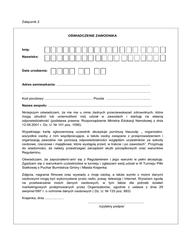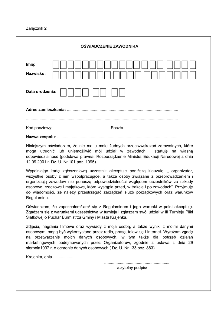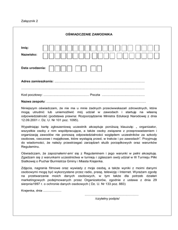 Załącznik 2 OŚWIADCZENIE ZAWODNIKA Imię: Nazwisko: Data urodzenia: - - Adres zamieszkania: ................................................................................................... ....................................................................................................................................... Kod pocztowy: .................................................. Poczta ............................................... Nazwa zespołu: ............................................................................................................. Niniejszym oświadczam, że nie ma u mnie żadnych przeciwwskazań zdrowotnych, które mogą utrudnić lub uniemożliwić mój udział w zawodach i startuję na własną odpowiedzialność (podstawa prawna: Rozporządzenie Ministra Edukacji Narodowej z dnia 12.09.2001 r. Dz. U. Nr 101 poz. 1095). Wypełniając kartę zgłoszeniową uczestnik akceptuje poniższą klauzulę: „ organizator, wszystkie osoby z nim współpracujące, a także osoby związane z przeprowadzeniem i organizacją zawodów nie ponoszą odpowiedzialności względem uczestników za szkody osobowe, rzeczowe i majątkowe, które wystąpią przed, w trakcie i po zawodach”. Przyjmuję do wiadomości, że należy przestrzegać zarządzeń służb porządkowych oraz warunków Regulaminu. Oświadczam, że zapoznałem/-am/ się z Regulaminem i jego warunki w pełni akceptuję. Zgadzam się z warunkami uczestnictwa w turnieju i zgłaszam swój udział w III Turnieju Piłki Siatkowej o Puchar Burmistrza Gminy i Miasta Krajenka. Zdjęcia, nagrania filmowe oraz wywiady z moja osobą, a także wyniki z moimi danymi osobowymi mogą być wykorzystane przez radio, prasę, telewizję i Internet. Wyrażam zgodę na przetwarzanie moich danych osobowych, w tym także dla potrzeb działań marketingowych podejmowanych przez Organizatorów, zgodnie z ustawa z dnia 29 sierpnia1997 r. o ochronie danych osobowych ( Dz. U. Nr 133 poz. 883) Krajenka, dnia .................... ........................................................... /czytelny podpis/