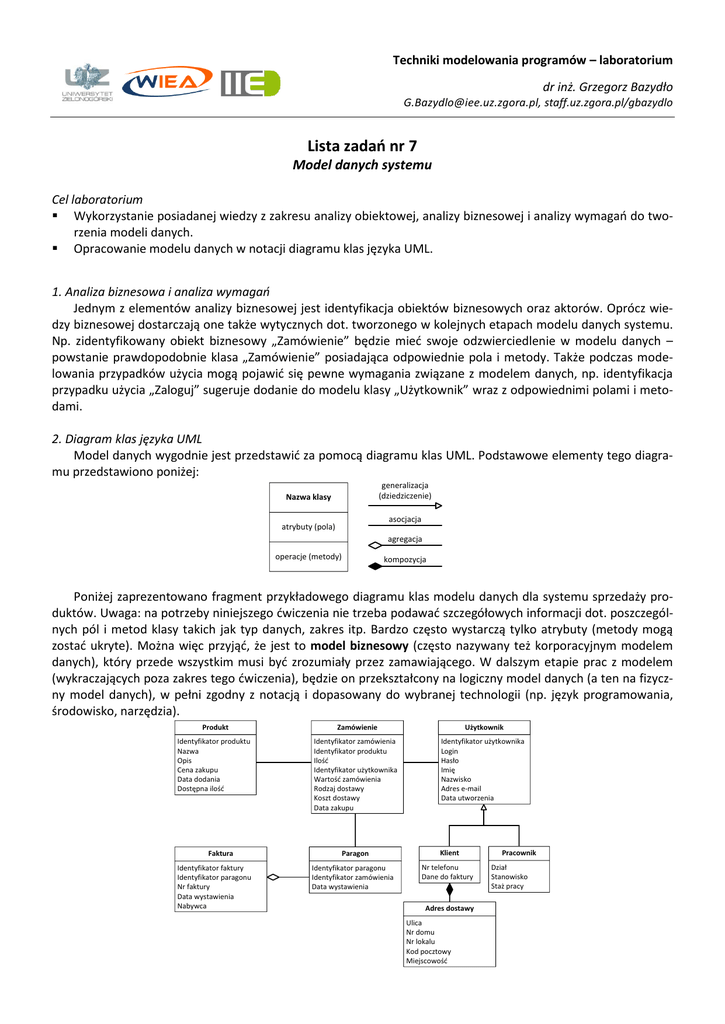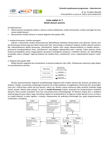 Techniki modelowania programów – laboratorium dr inż. Grzegorz Bazydło [email protected], staff.uz.zgora.pl/gbazydlo Lista zadań nr 7 Model danych systemu Cel laboratorium Wykorzystanie posiadanej wiedzy z zakresu analizy obiektowej, analizy biznesowej i analizy wymagań do tworzenia modeli danych. Opracowanie modelu danych w notacji diagramu klas języka UML. 1. Analiza biznesowa i analiza wymagań Jednym z elementów analizy biznesowej jest identyfikacja obiektów biznesowych oraz aktorów. Oprócz wiedzy biznesowej dostarczają one także wytycznych dot. tworzonego w kolejnych etapach modelu danych systemu. Np. zidentyfikowany obiekt biznesowy „Zamówienie” będzie mieć swoje odzwierciedlenie w modelu danych – powstanie prawdopodobnie klasa „Zamówienie” posiadająca odpowiednie pola i metody. Także podczas modelowania przypadków użycia mogą pojawić się pewne wymagania związane z modelem danych, np. identyfikacja przypadku użycia „Zaloguj” sugeruje dodanie do modelu klasy „Użytkownik” wraz z odpowiednimi polami i metodami. 2. Diagram klas języka UML Model danych wygodnie jest przedstawić za pomocą diagramu klas UML. Podstawowe elementy tego diagramu przedstawiono poniżej: generalizacja (dziedziczenie) Nazwa klasy asocjacja atrybuty (pola) agregacja operacje (metody) kompozycja Poniżej zaprezentowano fragment przykładowego diagramu klas modelu danych dla systemu sprzedaży produktów. Uwaga: na potrzeby niniejszego ćwiczenia nie trzeba podawać szczegółowych informacji dot. poszczególnych pól i metod klasy takich jak typ danych, zakres itp. Bardzo często wystarczą tylko atrybuty (metody mogą zostać ukryte). Można więc przyjąć, że jest to model biznesowy (często nazywany też korporacyjnym modelem danych), który przede wszystkim musi być zrozumiały przez zamawiającego. W dalszym etapie prac z modelem (wykraczających poza zakres tego ćwiczenia), będzie on przekształcony na logiczny model danych (a ten na fizyczny model danych), w pełni zgodny z notacją i dopasowany do wybranej technologii (np. język programowania, środowisko, narzędzia). Produkt Zamówienie Użytkownik Identyfikator produktu Nazwa Opis Cena zakupu Data dodania Dostępna ilość Identyfikator zamówienia Identyfikator produktu Ilość Identyfikator użytkownika Wartość zamówienia Rodzaj dostawy Koszt dostawy Data zakupu Identyfikator użytkownika Login Hasło Imię Nazwisko Adres e-mail Data utworzenia Faktura Identyfikator faktury Identyfikator paragonu Nr faktury Data wystawienia Nabywca Paragon Identyfikator paragonu Identyfikator zamówienia Data wystawienia Klient Nr telefonu Dane do faktury Adres dostawy Ulica Nr domu Nr lokalu Kod pocztowy Miejscowość Pracownik Dział Stanowisko Staż pracy Zadanie 1 Pracując samodzielnie lub w dwuosobowych grupach zidentyfikujcie i opracujcie modele danych Waszego projektowanego systemu (hipotetycznej) firmy. Wynikiem analizy powinien być uzupełniony rozdział 6 „Model danych” szablonu specyfikacji wymagań (patrz lista zadań nr 6). 2