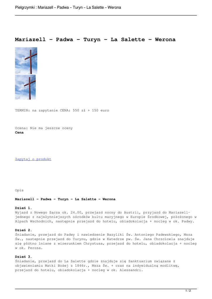 Pielgrzymki : Mariazell – Padwa – Turyn – La Salette – Werona Mariazell – Padwa – Turyn – La Salette – Werona TERMIN: na zapytanie CENA: 550 zł + 150 euro Ocena: Nie ma jeszcze oceny Cena Zapytaj o produkt Opis Mariazell – Padwa – Turyn – La Salette – Werona Dzień 1. Wyjazd z Nowego Sącza ok. 24.00, przejazd nocny do Austrii, przyjazd do Mariazelljednego z najsłynniejszych ośrodków kultu maryjnego w Europie Środkowej, położonego w Alpach Wschodnich, następnie przejazd do hotelu, obiadokolacja + nocleg w ok. Padwy. Dzień 2. Śniadanie, przejazd do Padwy i nawiedzenie Bazyliki Św. Antoniego Padewskiego, Msza Św., nastepnie przejazd do Turynu, gdzie w Katedrze pw. Św. Jana Chrzcicela znajduje się płótno lniane z wizerunkiem Chrystusa, przejazd do hotelu, obiadokolacja + nocleg w ok. Perosa. Dzień 3. Śniadanie, przejazd do La Salette gdzie znajduje się Sanktuarium związane z objawieniamiu Matki Bożej z 1846r., Msza Św. + czas na indywidualną modlitwę, przejazd do hotelu, obiadokolacja + nocleg w ok. Alessandri. 1/2 Pielgrzymki : Mariazell – Padwa – Turyn – La Salette – Werona Dzień 4. Śniadanie, przejazd do Werony – miasta Romea i Julii, spacer po Starówce Piazza dei Signori, przejazd na obiad do restauracji. Powrót nocny do Polski. Dzień 5. Przyjazd do Nowego Sącza w godzinach rannych. CENA : 550 zł + 150 euro Cena zawiera: - przejazd autokarem Cafe Bar, DVD/Mp3, WC, Klimatyzacja; - 3 noclegi + wyżywienie HB (śniadanie i obiadokolacja); - dodatkowy obiad w drodze powrotnej; - opieka pilota/przewodnika; - ubezpieczenie (NNW i KL); Na choroby przewlekłe należy ubezpieczyć się oddzielnie - dodatkowo. Na ewentualne dodatkowe wydatki związane z podróżą (np. toalety, kawa, pamiątki), prosimy przeznaczyć kwotę ok. 50euro. Organizator wyjazdu zastrzega sobie prawo do zmian w programie zwiedzania, który może wyniknąć z indywidualnych życzeń danej grupy lub z niedostępności do tych miejsc. 2/2 Powered by TCPDF (www.tcpdf.org)