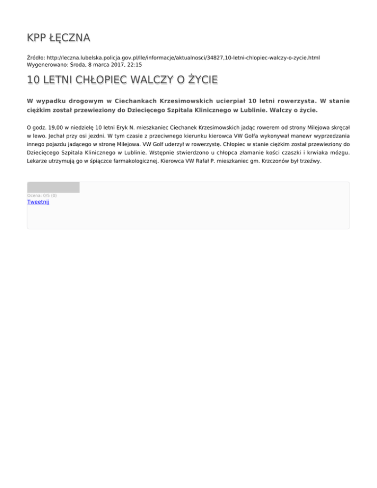 KPP ŁĘCZNA Źródło: http://leczna.lubelska.policja.gov.pl/lle/informacje/aktualnosci/34827,10-letni-chlopiec-walczy-o-zycie.html Wygenerowano: Środa, 8 marca 2017, 22:15 10 LETNI CHŁOPIEC WALCZY O ŻYCIE W wypadku drogowym w Ciechankach Krzesimowskich ucierpiał 10 letni rowerzysta. W stanie ciężkim został przewieziony do Dziecięcego Szpitala Klinicznego w Lublinie. Walczy o życie. O godz. 19,00 w niedzielę 10 letni Eryk N. mieszkaniec Ciechanek Krzesimowskich jadąc rowerem od strony Milejowa skręcał w lewo. Jechał przy osi jezdni. W tym czasie z przeciwnego kierunku kierowca VW Golfa wykonywał manewr wyprzedzania innego pojazdu jadącego w stronę Milejowa. VW Golf uderzył w rowerzystę. Chłopiec w stanie ciężkim został przewieziony do Dziecięcego Szpitala Klinicznego w Lublinie. Wstępnie stwierdzono u chłopca złamanie kości czaszki i krwiaka mózgu. Lekarze utrzymują go w śpiączce farmakologicznej. Kierowca VW Rafał P. mieszkaniec gm. Krzczonów był trzeźwy. Ocena: 0/5 (0) Tweetnij