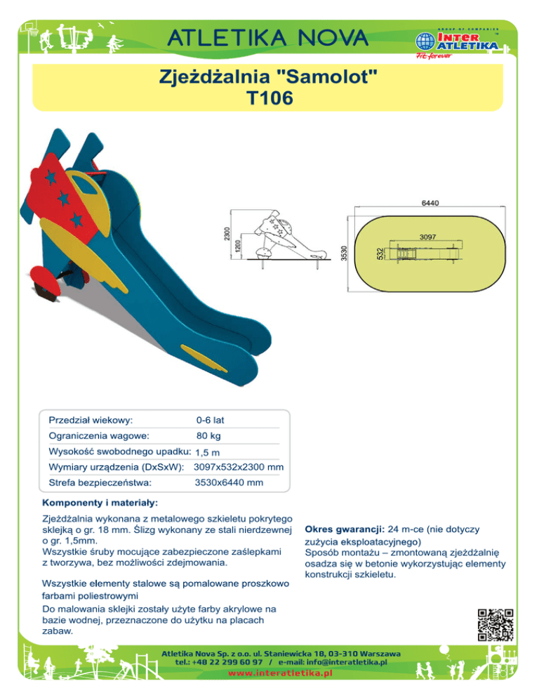Zjeżdżalnia "Samolot" 106 1,5 m 3097x532x2300 mm 3530x6440 mm Zjeżdżalnia wykonana z metalowego szkieletu pokrytego sklejką o gr. 18 mm. Ślizg wykonany ze stali nierdzewnej o gr. 1,5mm. Wszystkie śruby mocujące zabezpieczone zaślepkami z tworzywa, bez możliwości zdejmowania. Do malowania sklejki zostały użyte farby akrylowe na bazie wodnej, przeznaczone do użytku na placach zabaw. Sposób montażu – zmontowaną zjeżdżalnię osadza się w betonie wykorzystując elementy konstrukcji szkieletu.