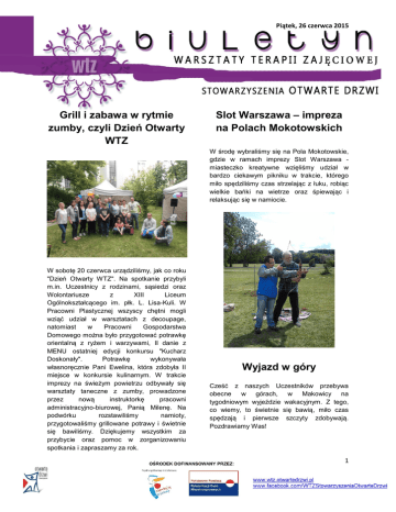 Piątek, 26 czerwca 2015 Grill i zabawa w rytmie zumby, czyli Dzień Otwarty WTZ Slot Warszawa – impreza na Polach Mokotowskich W środę wybraliśmy się na Pola Mokotowskie, gdzie w ramach imprezy Slot Warszawa miasteczko kreatywne wzięliśmy udział w bardzo ciekawym pikniku w trakcie, którego miło spędziliśmy czas strzelając z łuku, robiąc wielkie bańki na wietrze oraz śpiewając i relaksując się w namiocie. W sobotę 20 czerwca urządziliśmy, jak co roku "Dzień Otwarty WTZ". Na spotkanie przybyli m.in. Uczestnicy z rodzinami, sąsiedzi oraz Wolontariusze z XIII Liceum Ogólnokształcącego im. płk. L. Lisa-Kuli. W Pracowni Plastycznej wszyscy chętni mogli wziąć udział w warsztatach z decoupage, natomiast w Pracowni Gospodarstwa Domowego można było przygotować potrawkę orientalną z ryżem i warzywami, II danie z MENU ostatniej edycji konkursu "Kucharz Doskonały". Potrawkę wykonywała własnoręcznie Pani Ewelina, która zdobyła II miejsce w konkursie kulinarnym. W trakcie imprezy na świeżym powietrzu odbywały się warsztaty taneczne z zumby, prowadzone przez nową instruktorkę pracowni administracyjno-biurowej, Panią Milenę. Na podwórku rozstawiliśmy namioty, przygotowaliśmy grillowane potrawy i świetnie się bawiliśmy. Dziękujemy wszystkim za przybycie oraz pomoc w zorganizowaniu spotkania i zapraszamy za rok. Wyjazd w góry Cześć z naszych Uczestników przebywa obecne w górach, w Makowicy na tygodniowym wyjeździe wakacyjnym. Z tego, co wiemy, to świetnie się bawią, miło czas spędzają i pierwsze szczyty zdobywają. Pozdrawiamy Was! 1 Piątek, 26 czerwca 2015 Dziś zaś pożegnaliśmy Panią Anię Drózd, która właśnie zakończyła proces rehabilitacji w naszej placówce. Pani Aniu, dziękujemy za to, że była Pani z nami i życzymy wielu sukcesów w przyszłości! KONTAKT: Warsztaty Terapii Zajęciowej Stowarzyszenia Otwarte Drzwi ul. Równa 10/3 03-418 Warszawa tel: (22) 670-21-23 tel/fax: (22) 619-07-04 Imieniny, urodziny i pożegnania [email protected] www.wtz.otwartedrzwi.pl www.facebook.com/WTZStowarzyszeniaOtwar teDrzwi We wtorek obchodziliśmy imieniny Pana Jana, w czwartek zaś uczciliśmy urodziny Pani Magdy oraz pożegnaliśmy Panią Ewelinę, która opuszcza nasze Warsztaty, z powodu podjęcia pracy w Galerii "Apteka Sztuki" ZAZ. Pani Magdzie i Panu Jankowi życzymy wszystkiego najlepszego, natomiast Pani Ewelinie powodzenia na nowej ścieżce zawodowej! Gratulujemy! 2